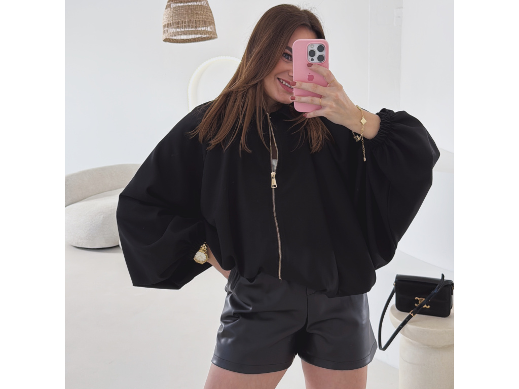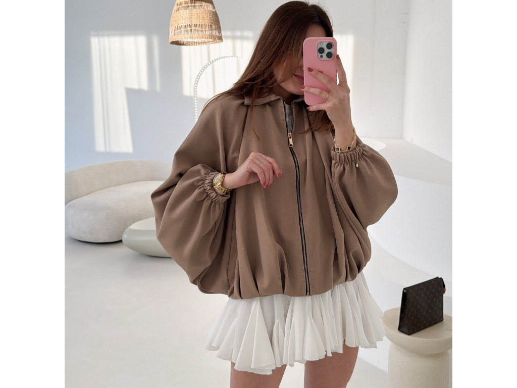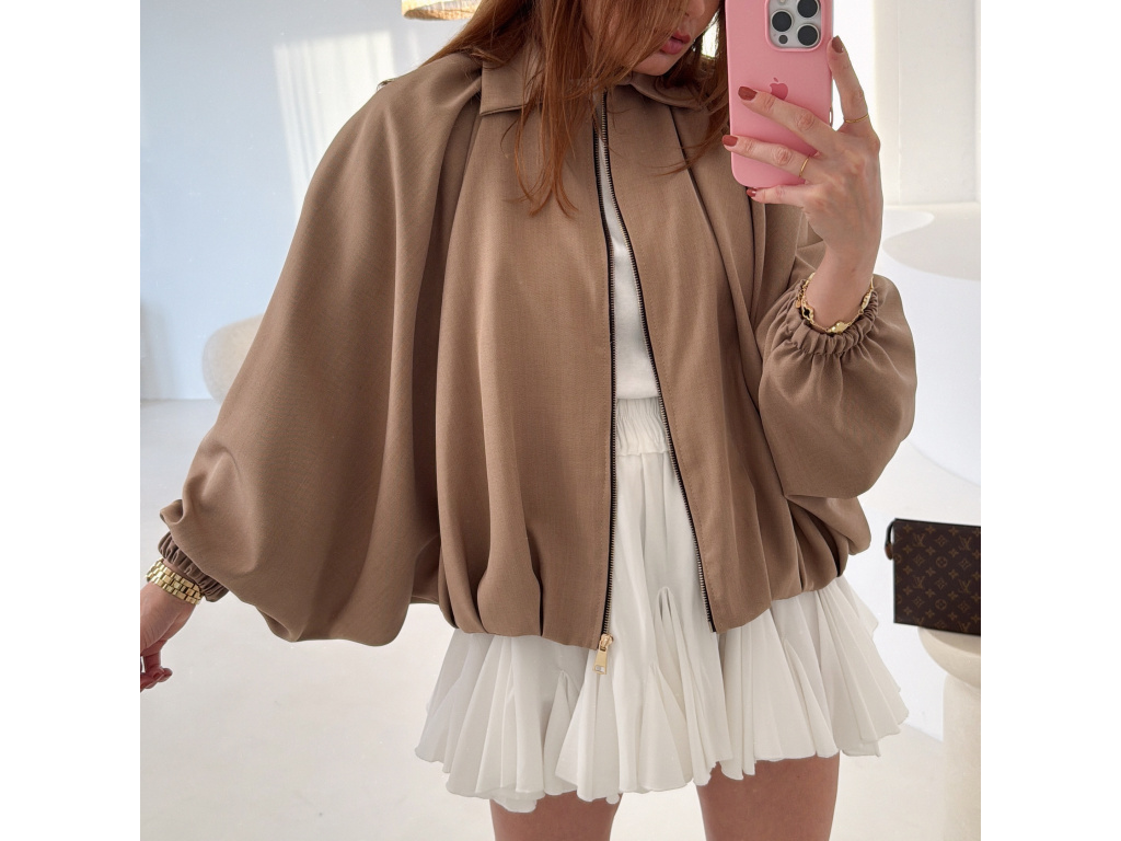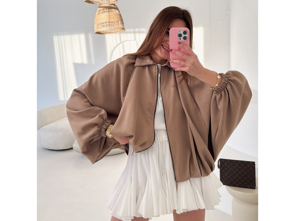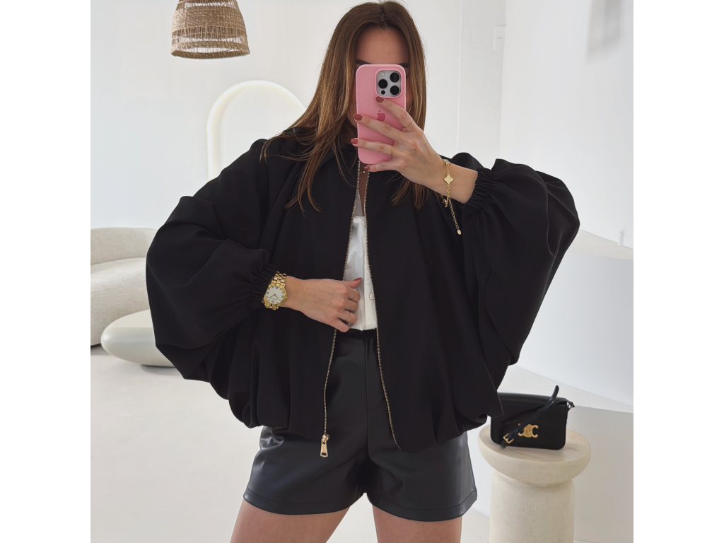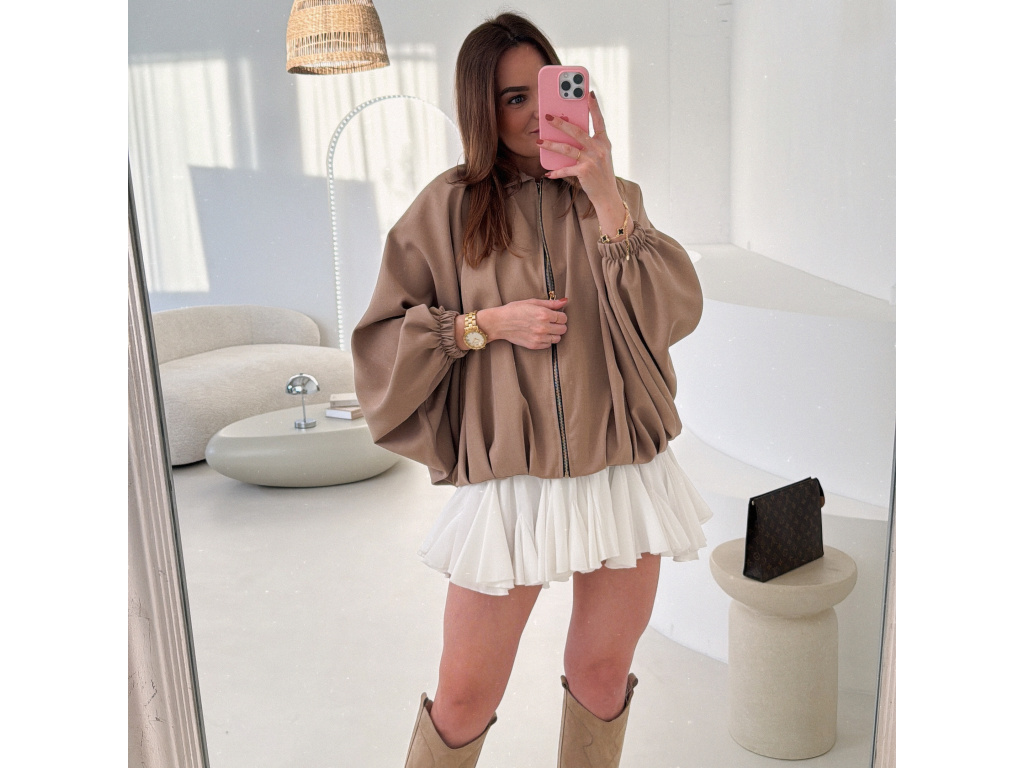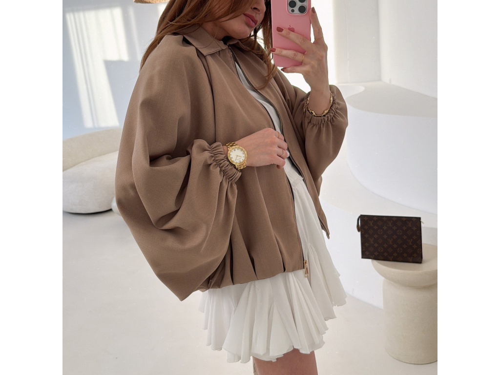 Stylová bundička s balónovými rukávy, která zaujme na první pohled. Nabírané sklady v dolním kraji dodávají modelu objem a moderní siluetu, zatímco rukávy zakončené do gumičky vytváří jemný, ženský efekt. Zapínání na zlatý zip přidává elegantní detail a krásně doplňuje celý look. Perfektní k šatům, sukním i kalhotám pro každodenní i slavnostnější styling.
