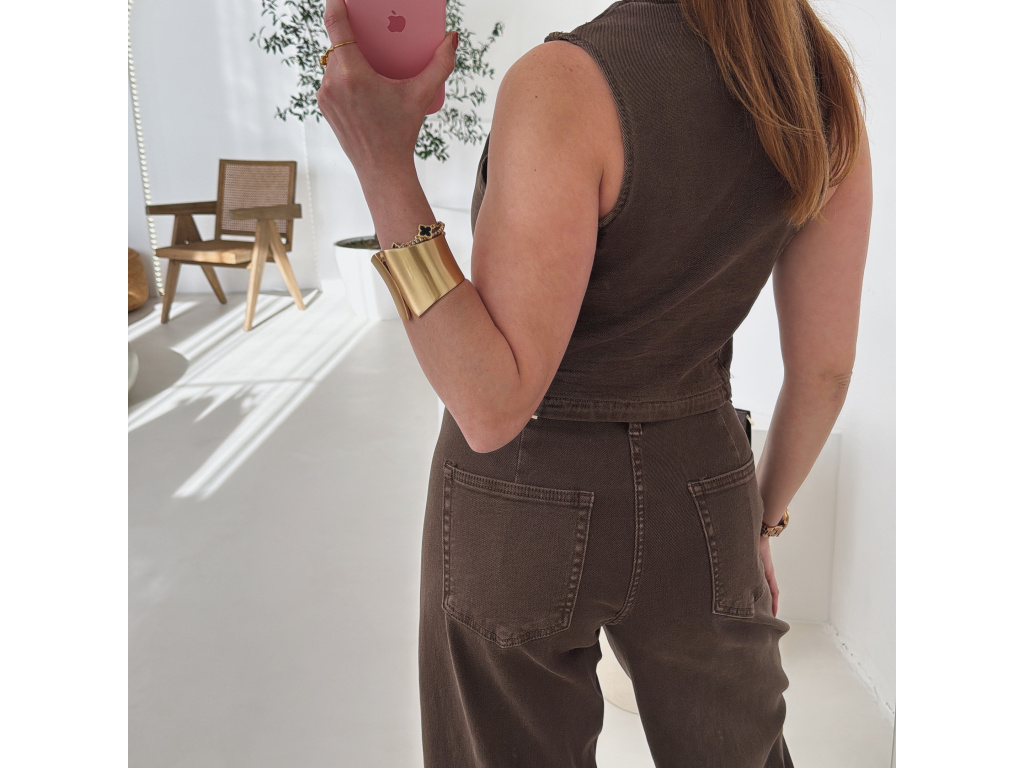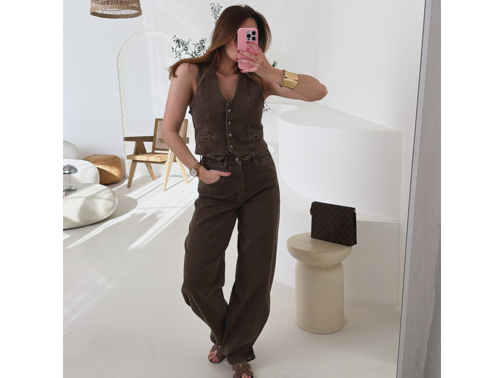 Stylová hnědá vestička z příjemného a elastického džínového materiálu, která krásně sedí na postavě a skvěle se kombinuje. Vesta se zapíná na knoflíky a díky svému střihu je ideální jak samostatně, tak i jako součást setu s kalhotami ve stejném materiálu. Pohodlný a zároveň velmi stylový kousek, který snadno využijete pro každodenní outfity. Dostupná ve velikostech XS až XL.