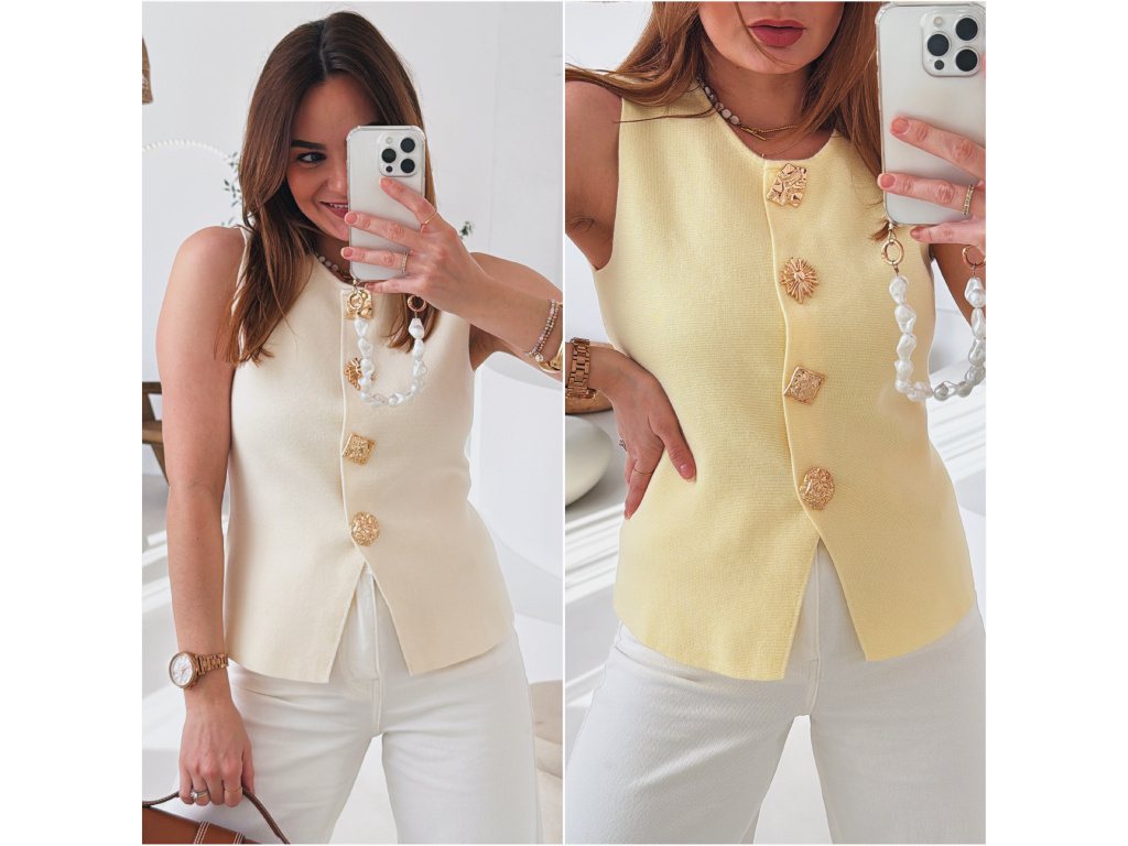 Elegantní vesta s čistým, ženským střihem, která krásně doplní jak elegantní, tak i casual outfit. Dominantním prvkem jsou výrazné zlaté knoflíky s originálním designem, které dodávají vestě luxusní a stylový vzhled. Příjemný materiál skvěle drží tvar a vesta se perfektně kombinuje například s košilí, tričkem nebo i samostatně.