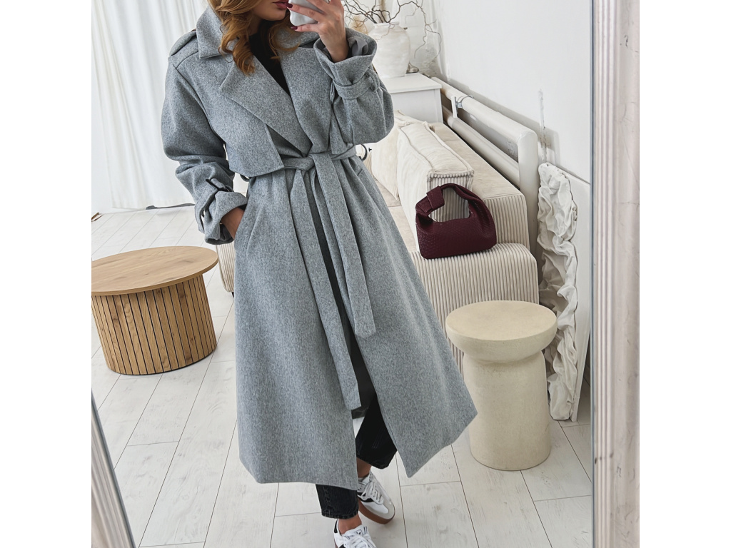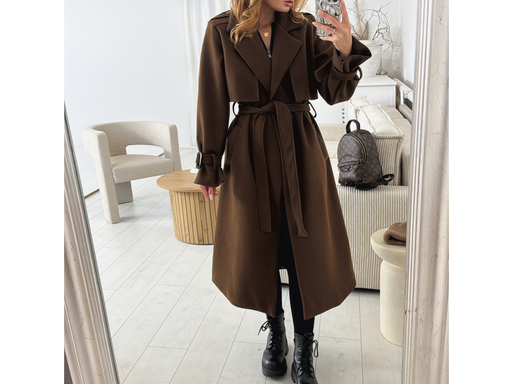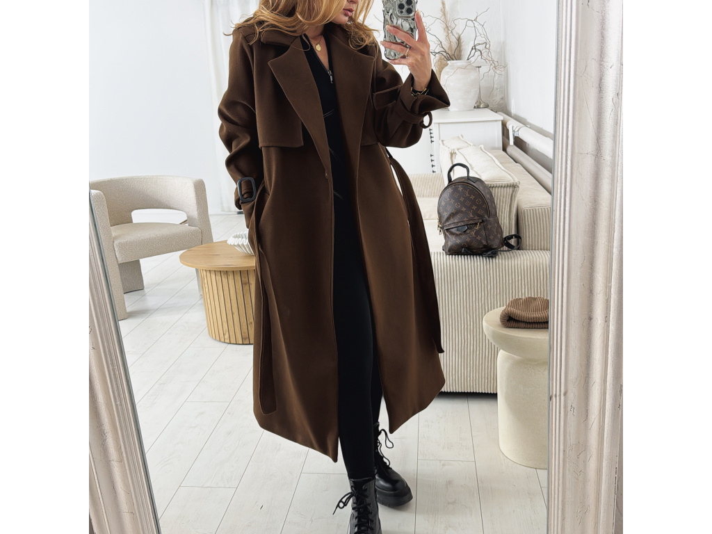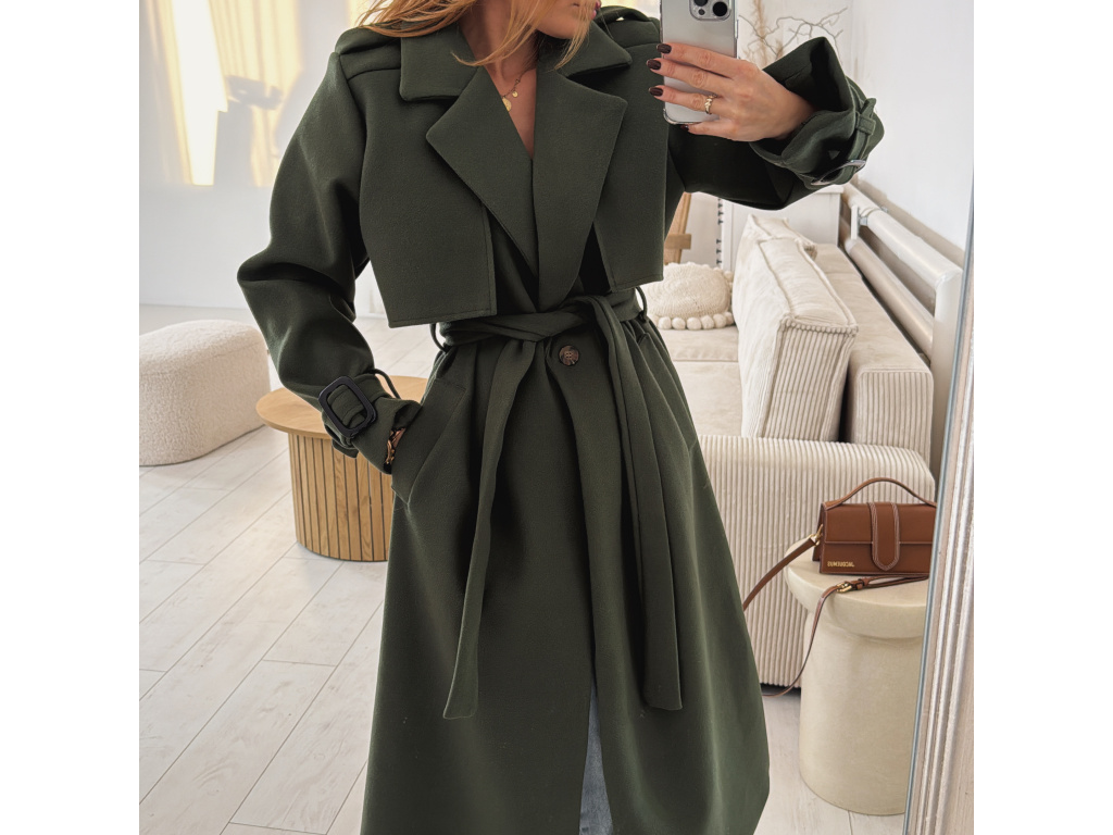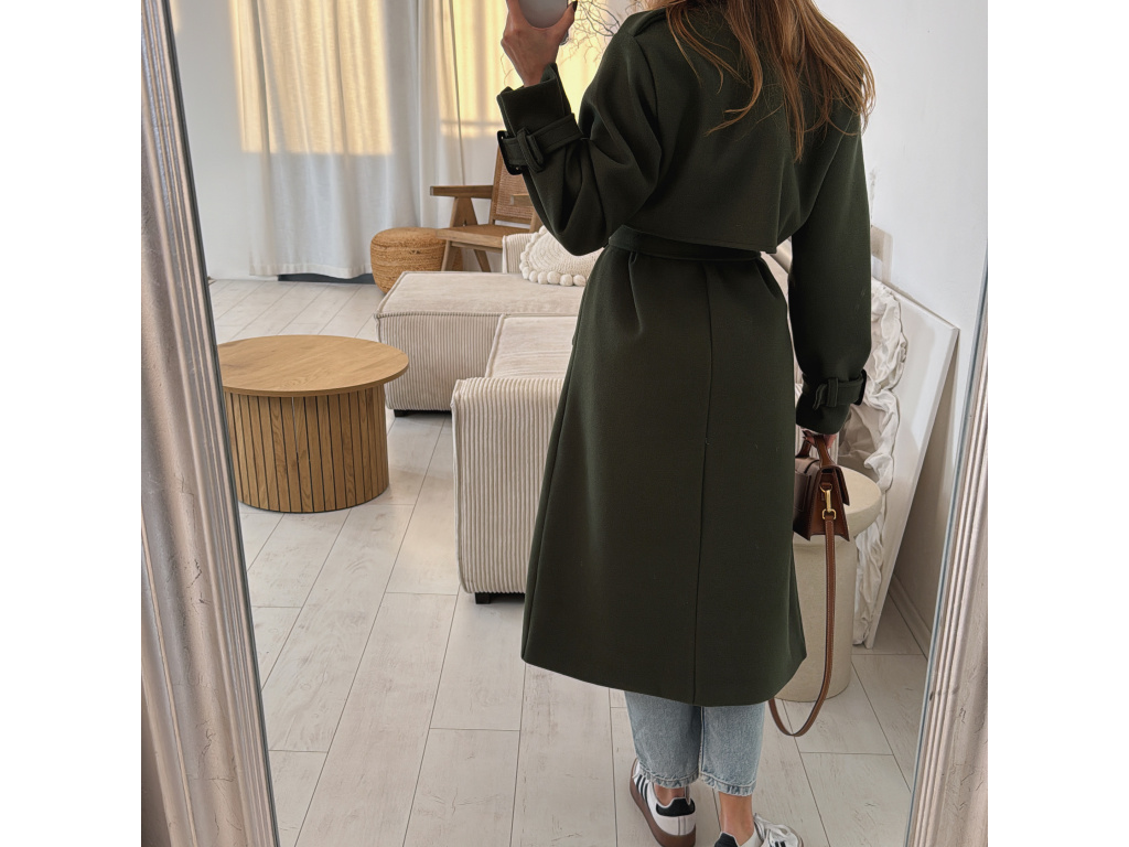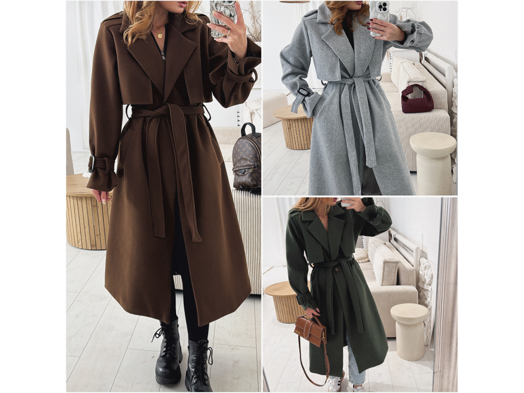 Luxusní, elegantní kabát velice hezkého, propracovaného střihu s páskem ve světle šedé, hnědé a khaki barvě s podšívkou. Kabát má ze zadní i přední strany ochranný štít, fazonku a kapsy. Kabát se váže pomocí pásku a na knoflík. Velikost je univerzální, sedí na XS,S,M i menší L. Foceno je na výšce 165 cm a velikosti XS.