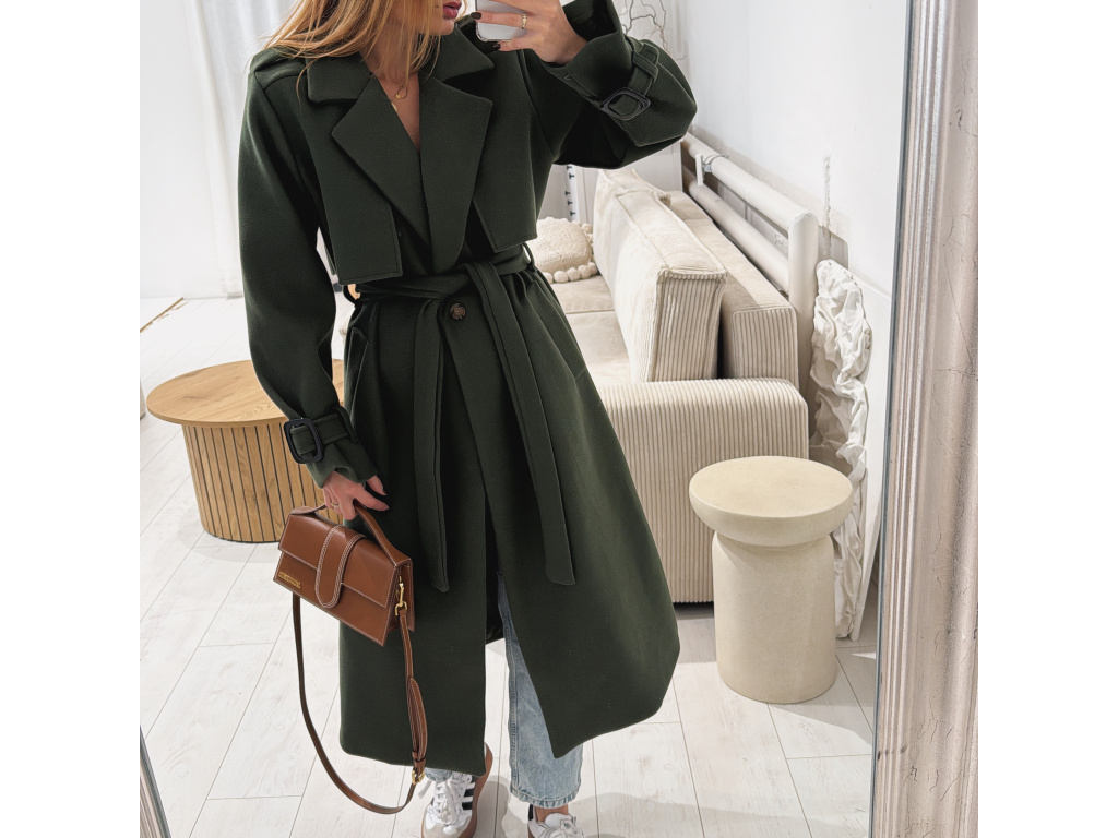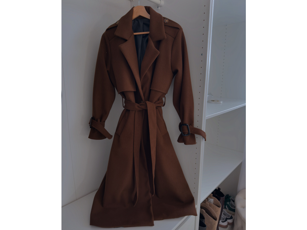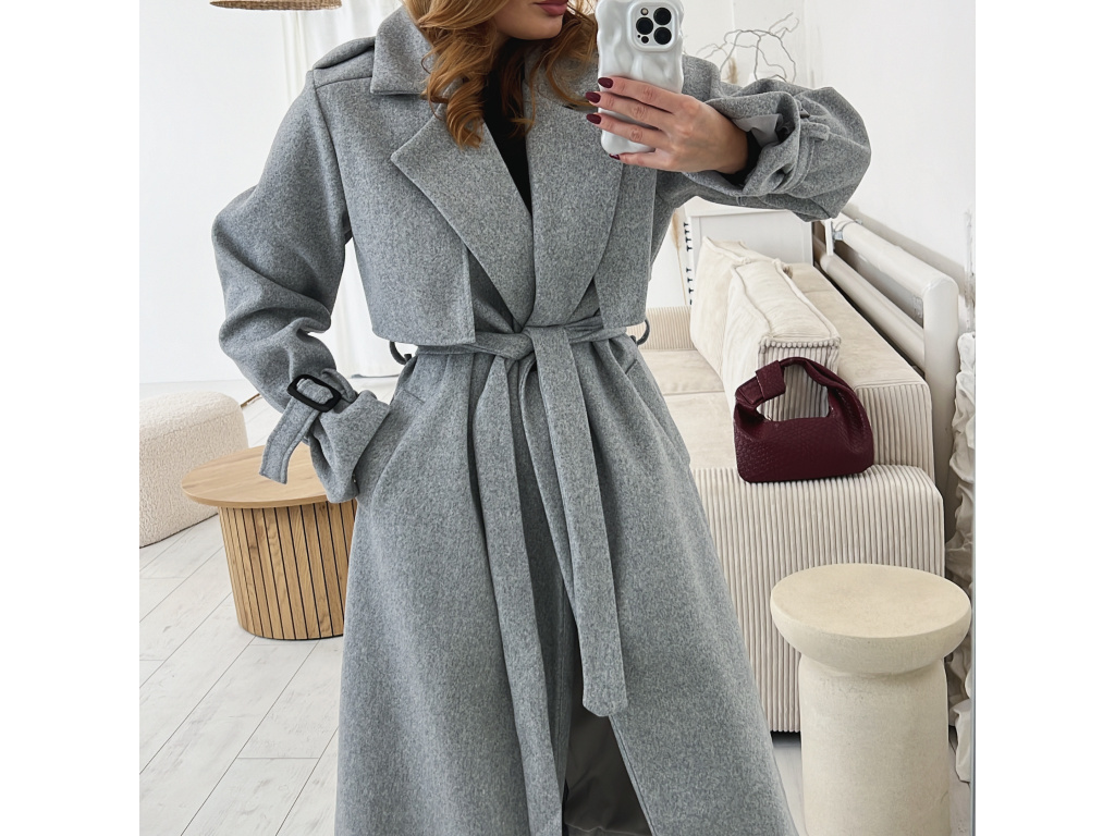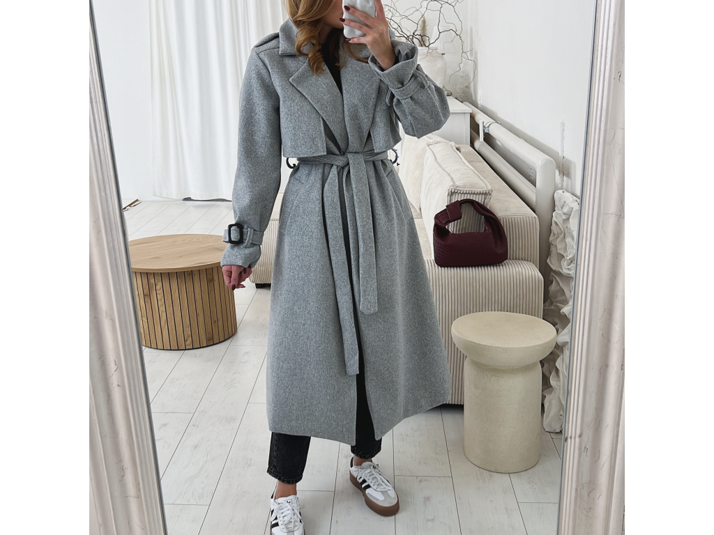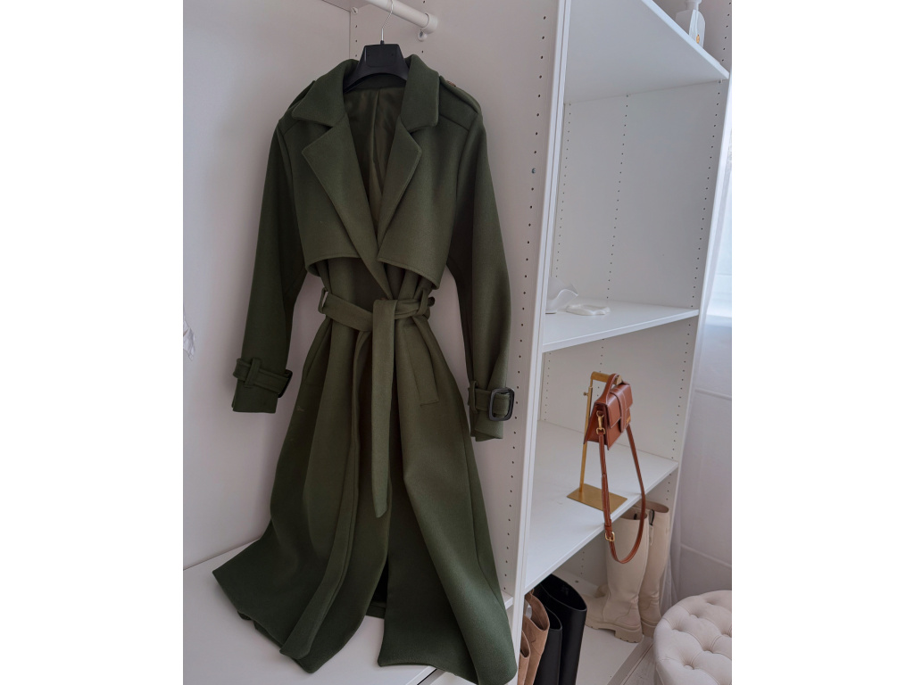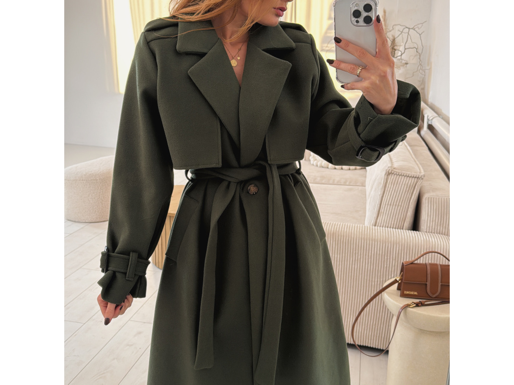 Luxusní, elegantní kabát velice hezkého, propracovaného střihu s páskem ve světle šedé, hnědé a khaki barvě s podšívkou. Kabát má ze zadní i přední strany ochranný štít, fazonku a kapsy. Kabát se váže pomocí pásku a na knoflík. Velikost je univerzální, sedí na XS,S,M i menší L. Foceno je na výšce 165 cm a velikosti XS.