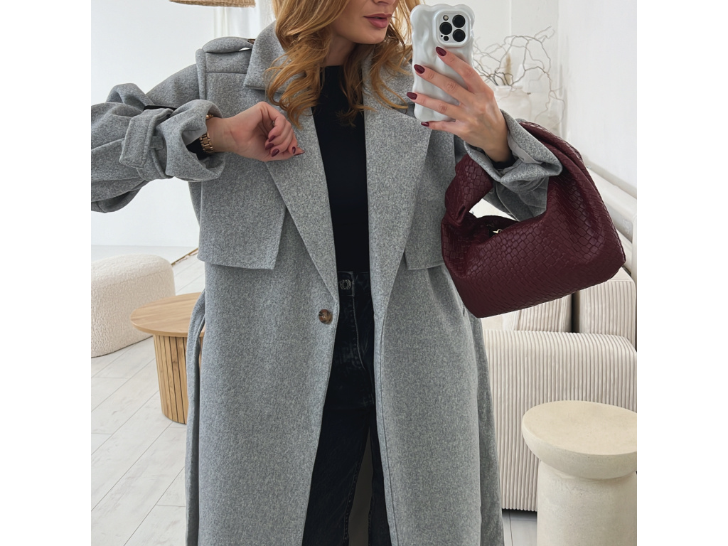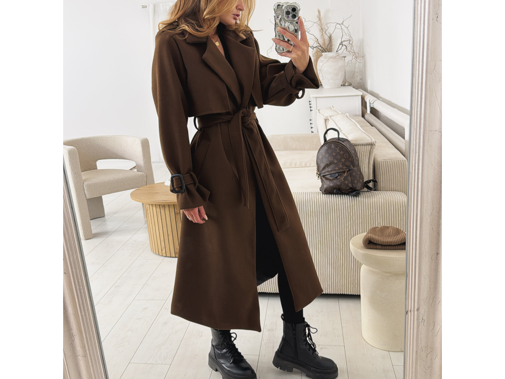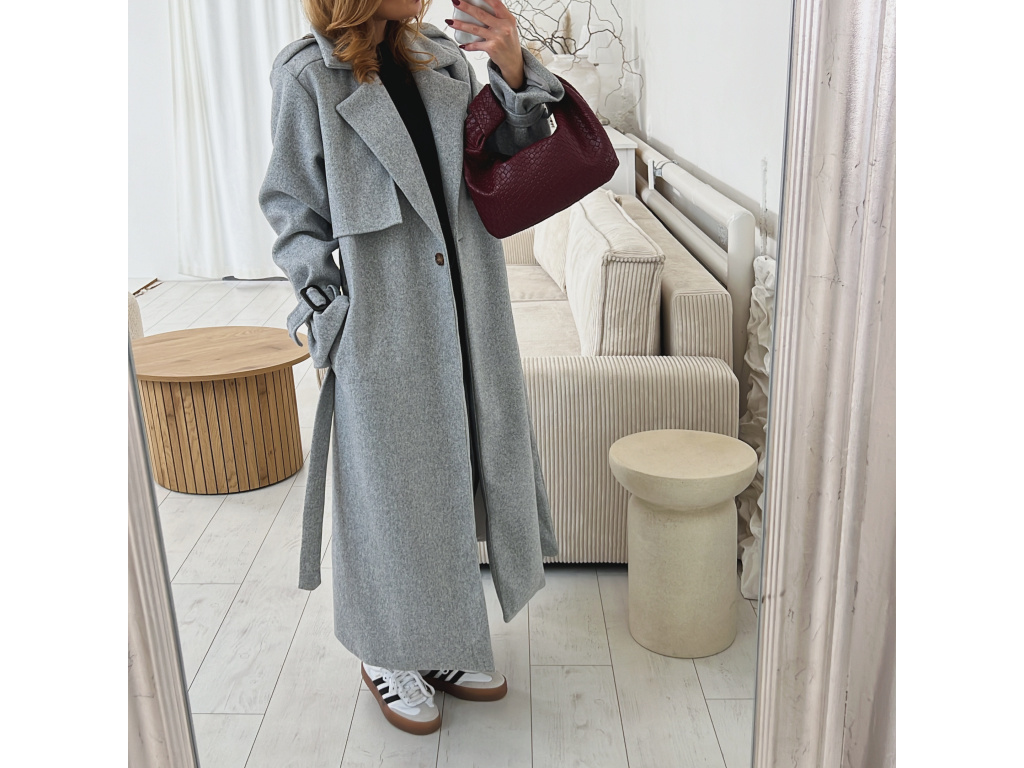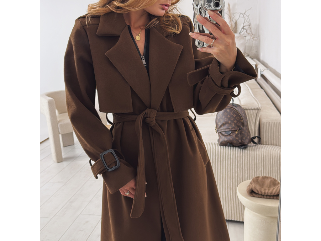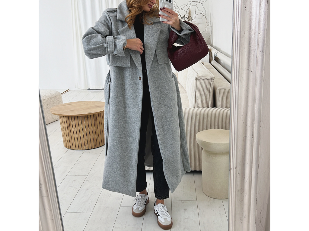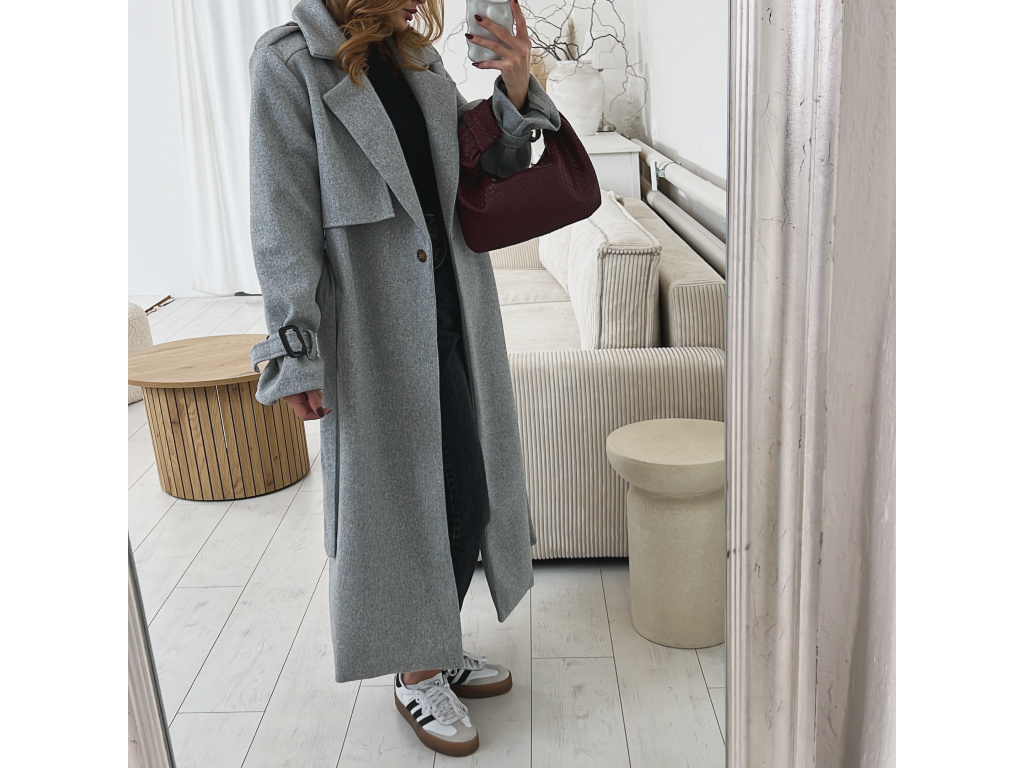 Luxusní, elegantní kabát velice hezkého, propracovaného střihu s páskem ve světle šedé, hnědé a khaki barvě s podšívkou. Kabát má ze zadní i přední strany ochranný štít, fazonku a kapsy. Kabát se váže pomocí pásku a na knoflík. Velikost je univerzální, sedí na XS,S,M i menší L. Foceno je na výšce 165 cm a velikosti XS.