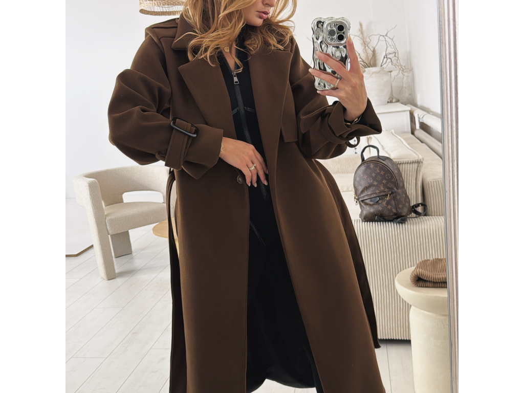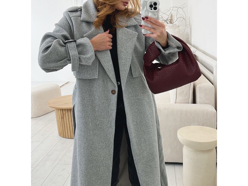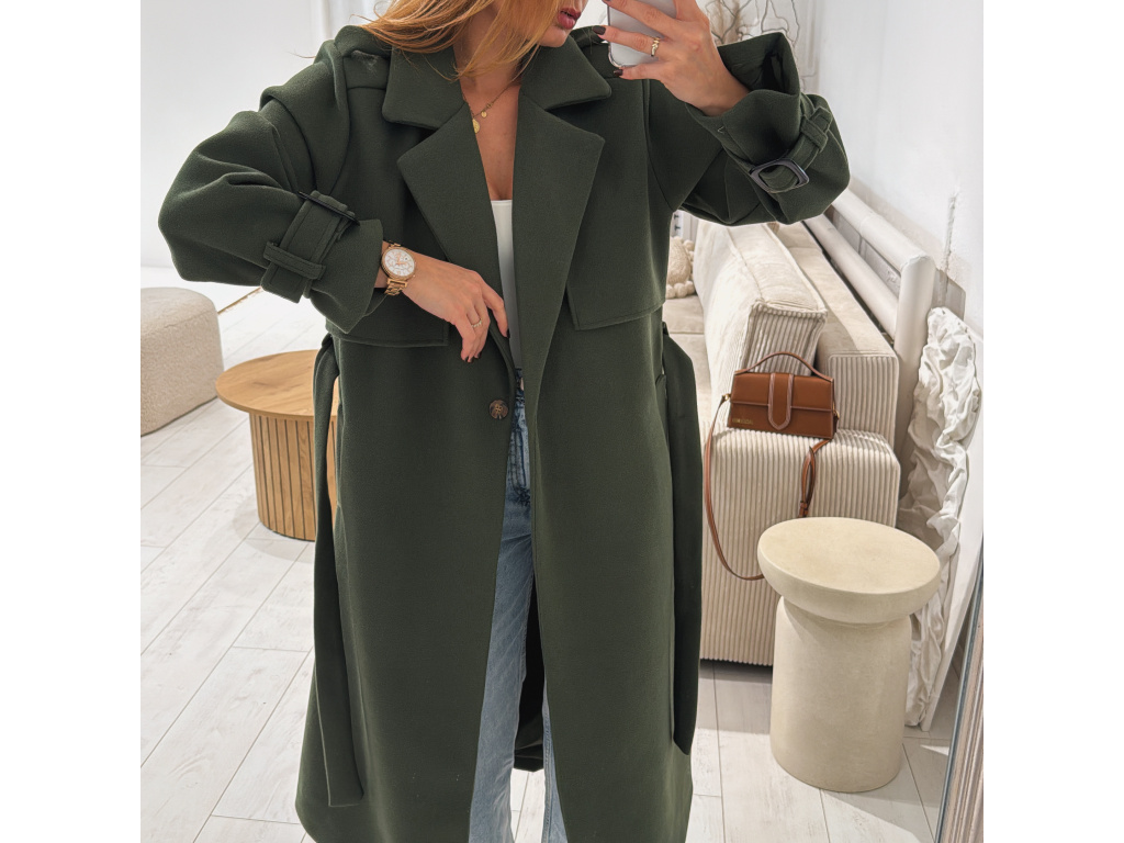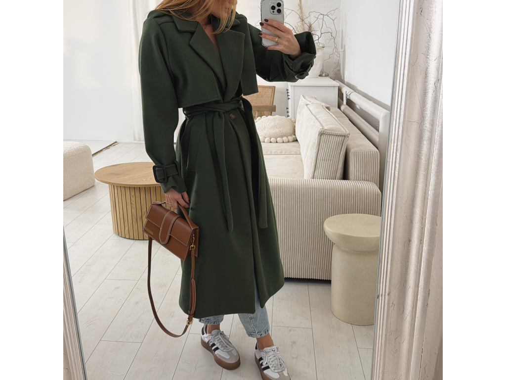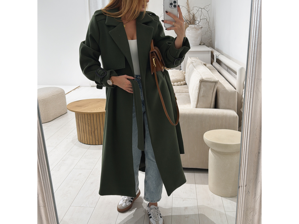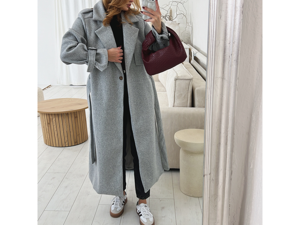 Luxusní, elegantní kabát velice hezkého, propracovaného střihu s páskem ve světle šedé, hnědé a khaki barvě s podšívkou. Kabát má ze zadní i přední strany ochranný štít, fazonku a kapsy. Kabát se váže pomocí pásku a na knoflík. Velikost je univerzální, sedí na XS,S,M i menší L. Foceno je na výšce 165 cm a velikosti XS.