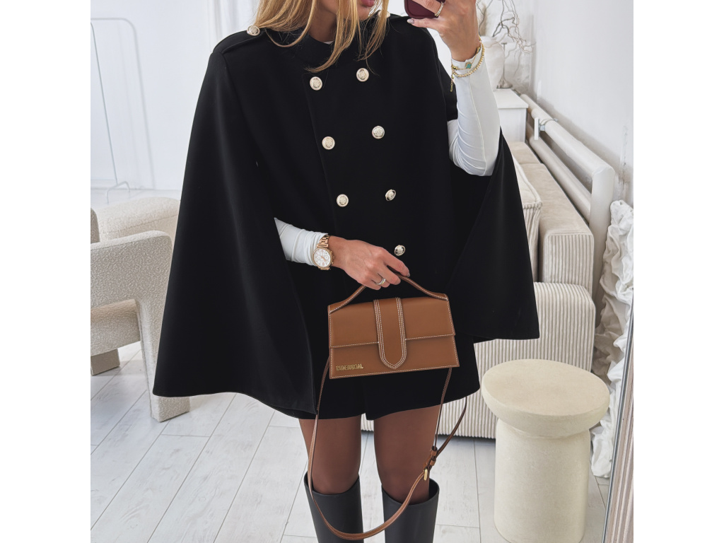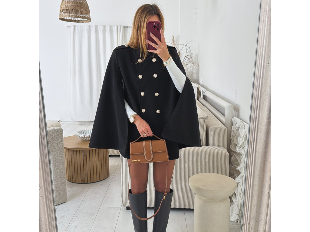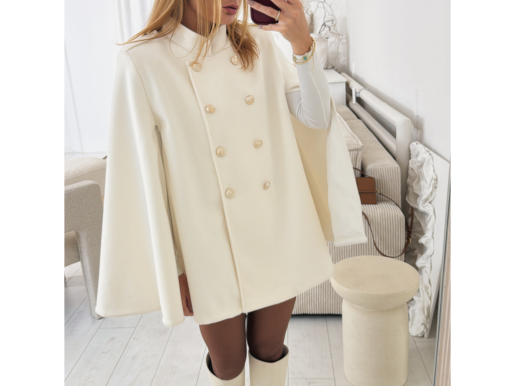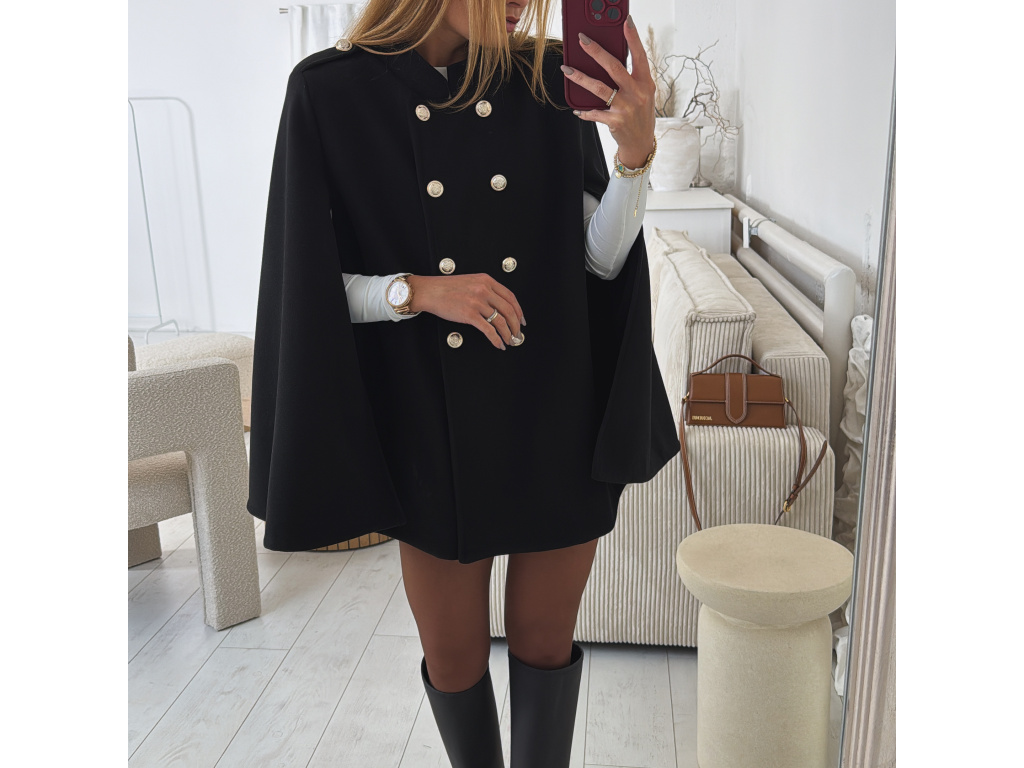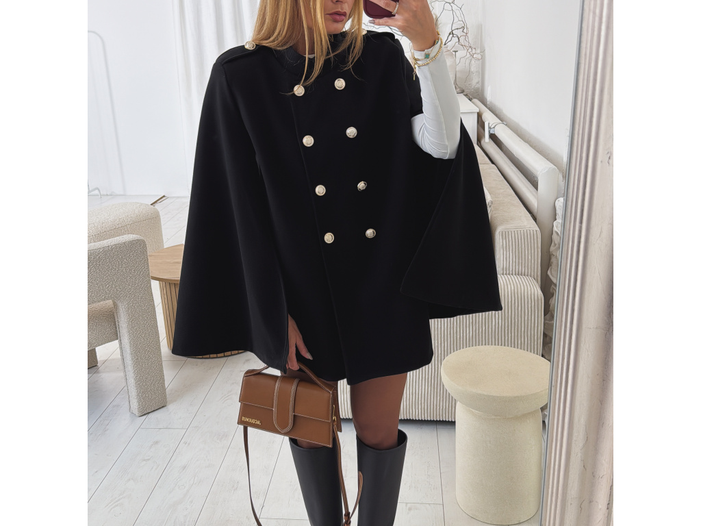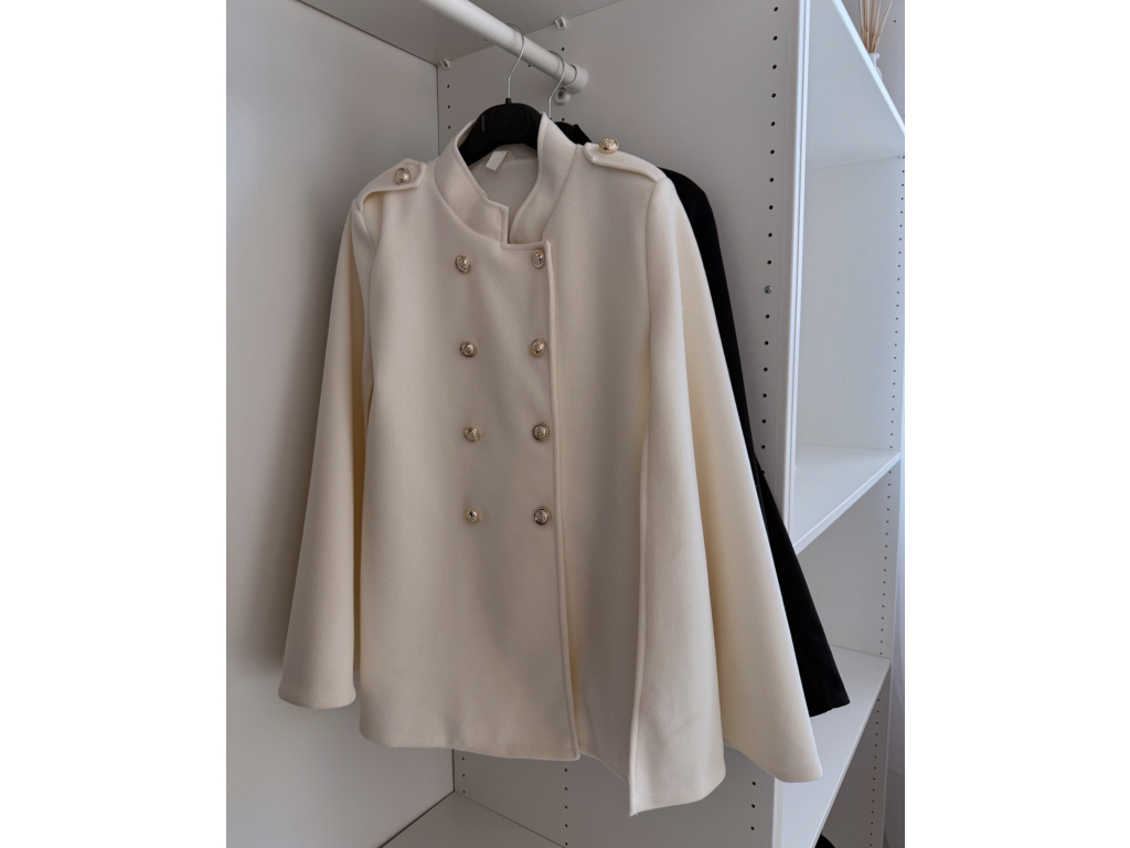 Elegantní, lehčí, dámský kabát s dvouřadým jemně zlatým zapínáním a pláštěnkovým střihem. Dostupný v černé a krémové barvě, ideální pro formální i neformální příležitosti. Stylový kousek pro každodenní sofistikovanost se zajímavými průstřihy na rukávech. Kabát je vč. podšívky a ramena jsou vyztužená. Velikost je univerzální, sedí na XS-L. Foceno je na výšce 165 cm a velikosti XS.