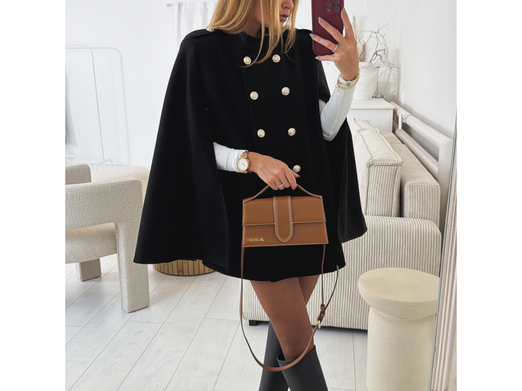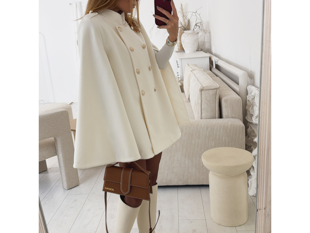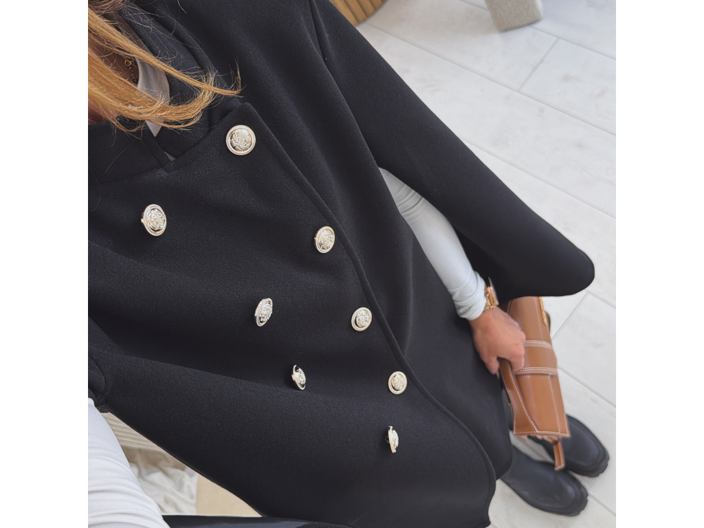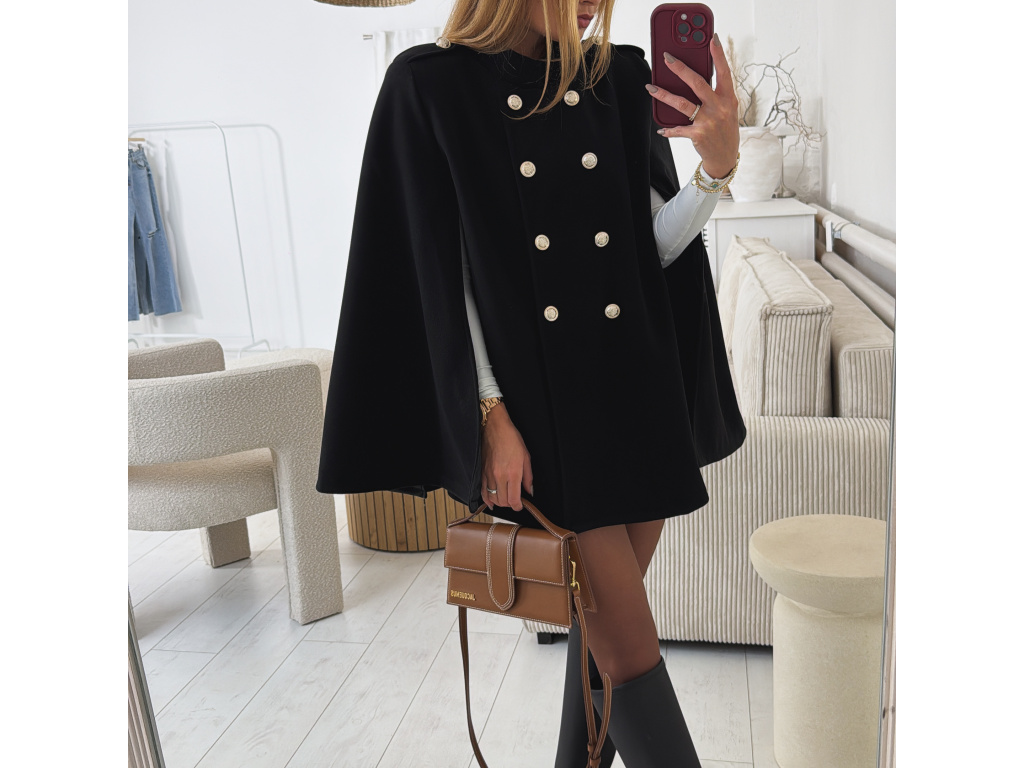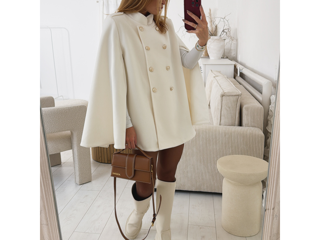 Elegantní, lehčí, dámský kabát s dvouřadým jemně zlatým zapínáním a pláštěnkovým střihem. Dostupný v černé a krémové barvě, ideální pro formální i neformální příležitosti. Stylový kousek pro každodenní sofistikovanost se zajímavými průstřihy na rukávech. Kabát je vč. podšívky a ramena jsou vyztužená. Velikost je univerzální, sedí na XS-L. Foceno je na výšce 165 cm a velikosti XS.