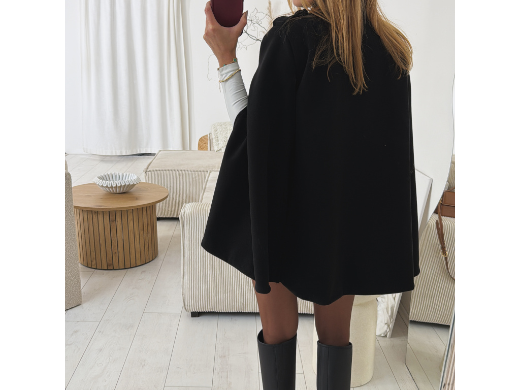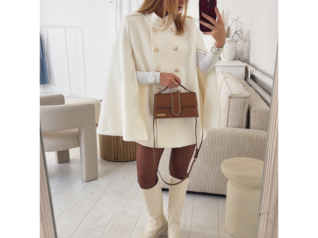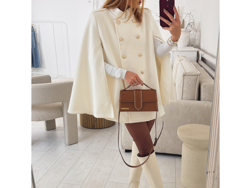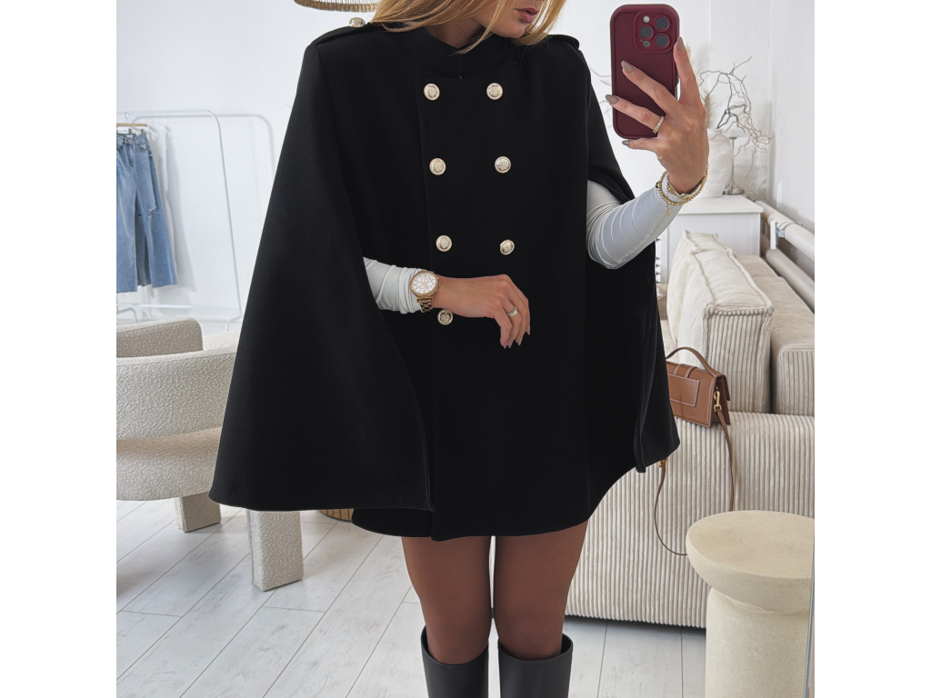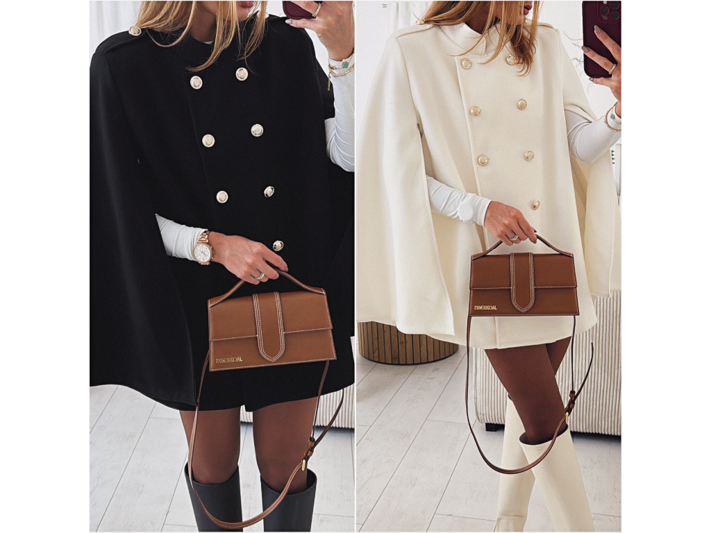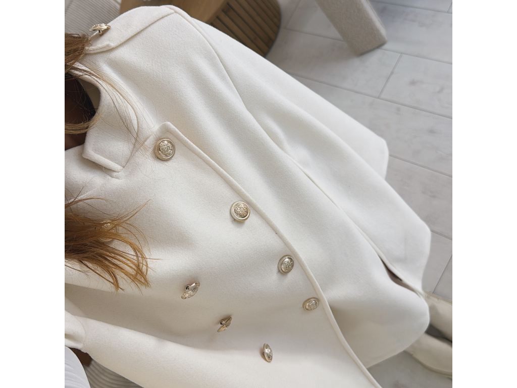 Elegantní, lehčí, dámský kabát s dvouřadým jemně zlatým zapínáním a pláštěnkovým střihem. Dostupný v černé a krémové barvě, ideální pro formální i neformální příležitosti. Stylový kousek pro každodenní sofistikovanost se zajímavými průstřihy na rukávech. Kabát je vč. podšívky a ramena jsou vyztužená. Velikost je univerzální, sedí na XS-L. Foceno je na výšce 165 cm a velikosti XS.