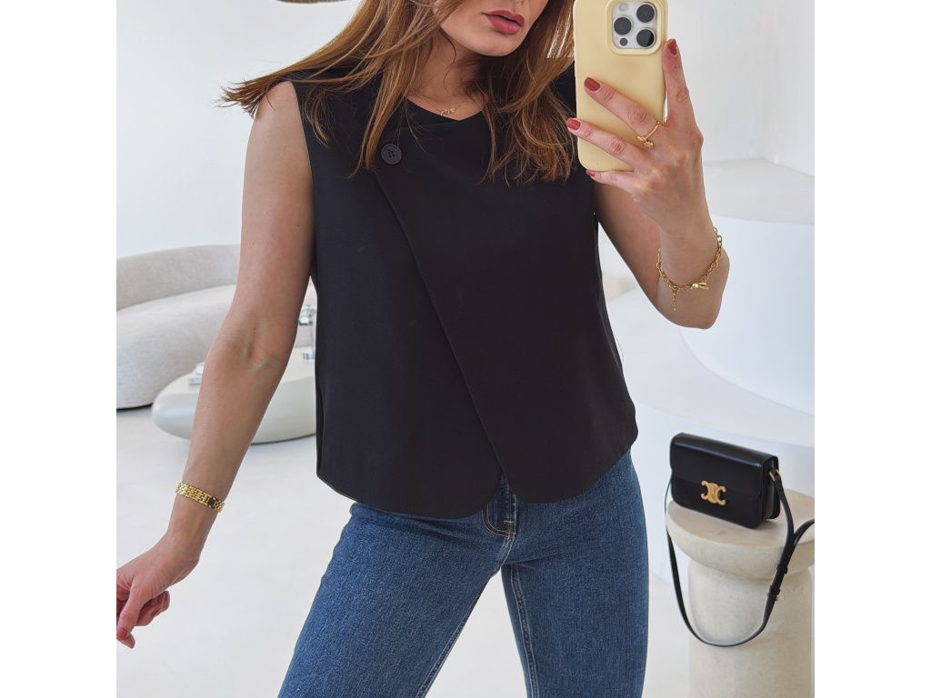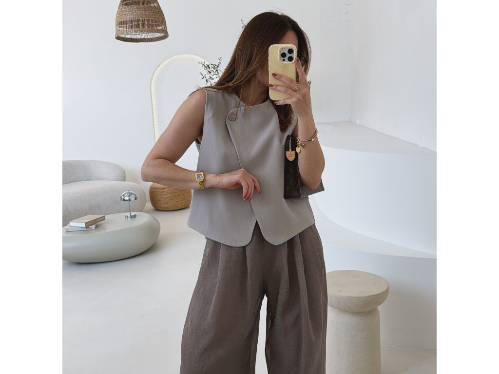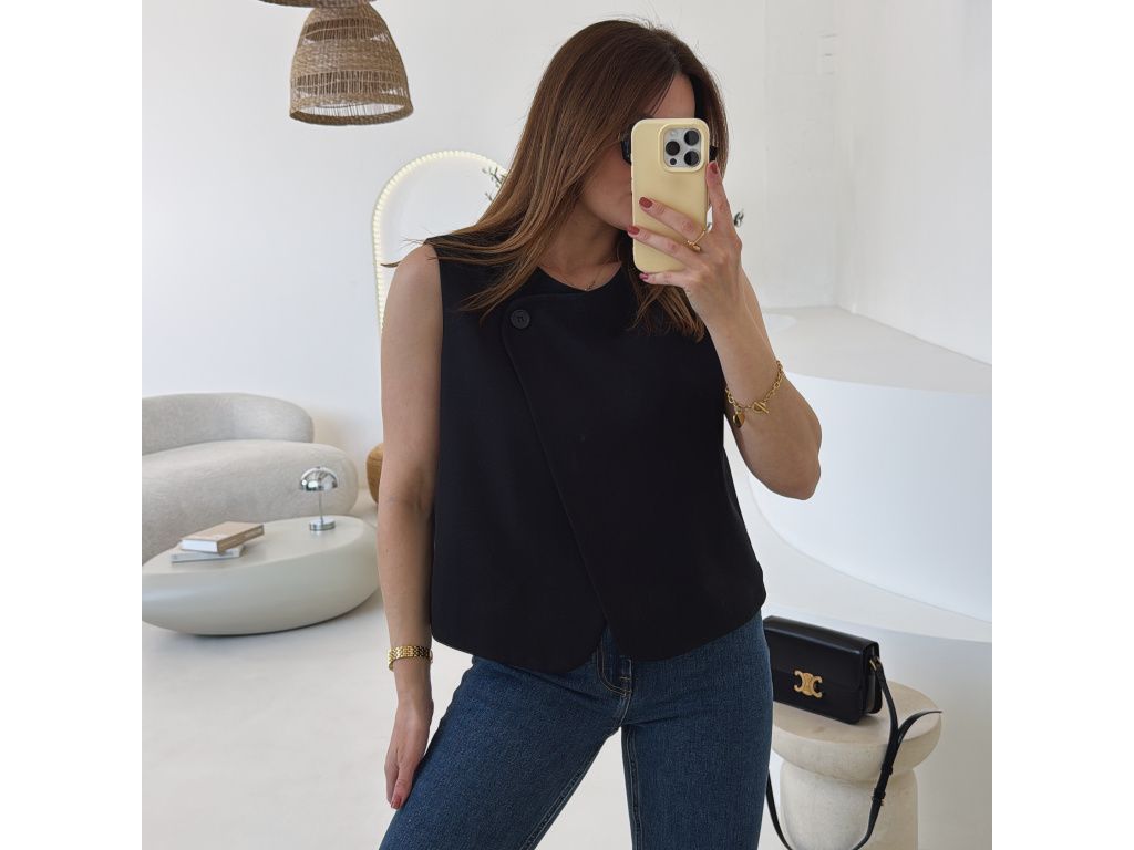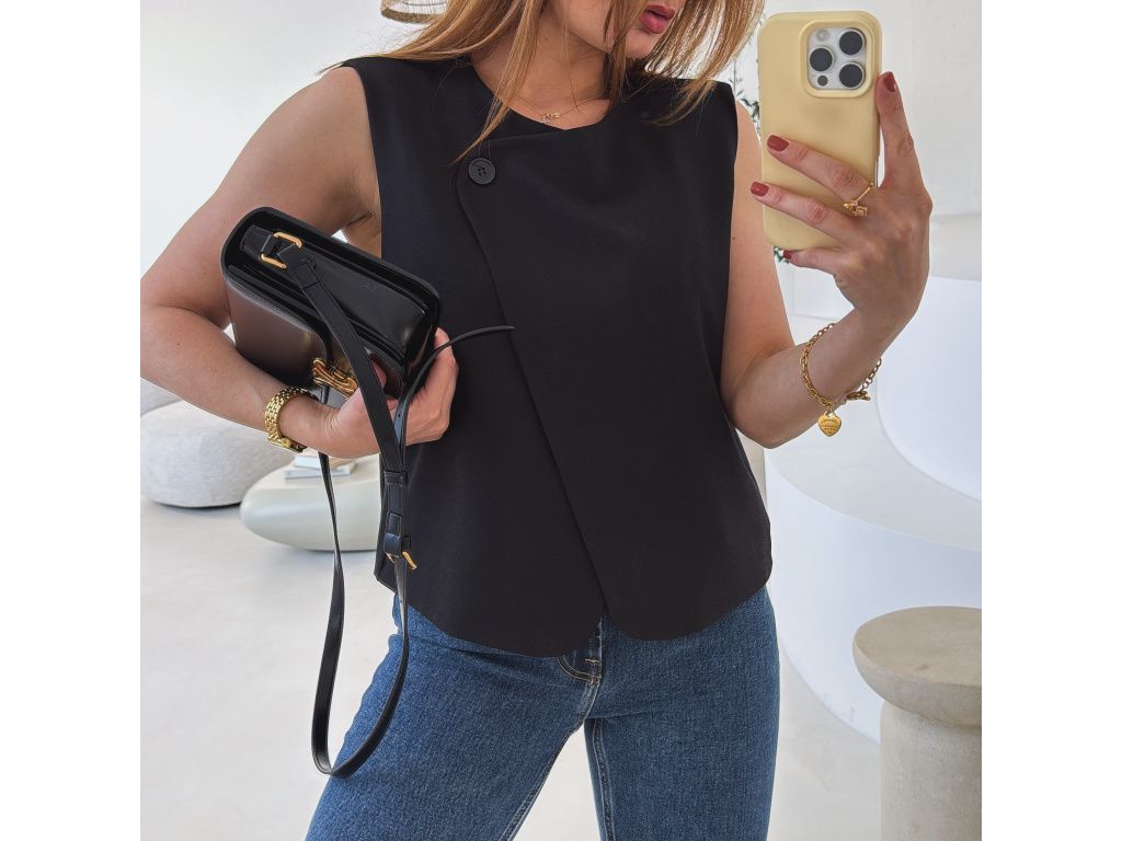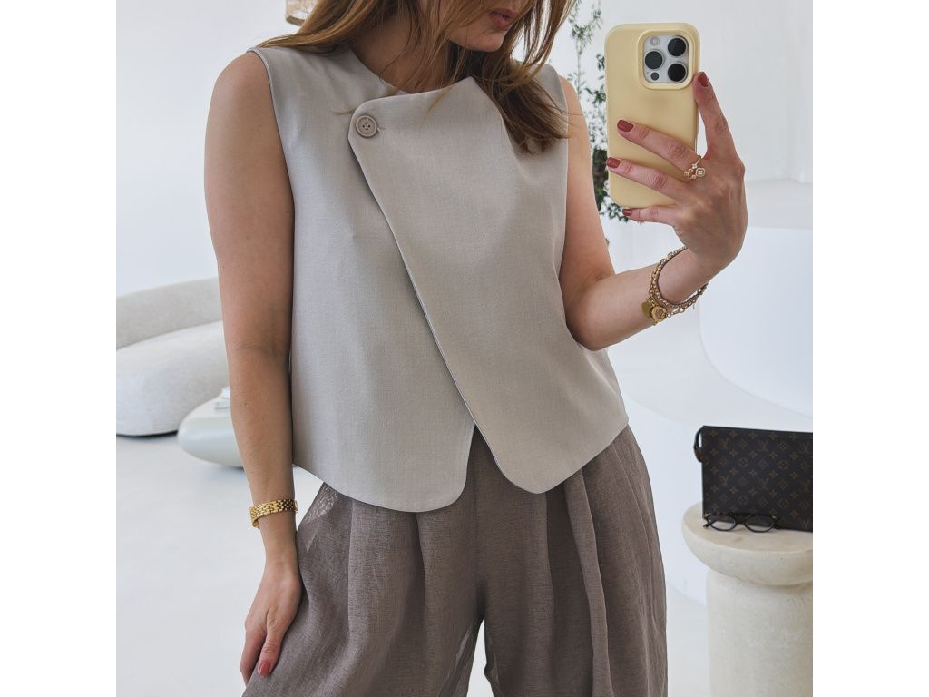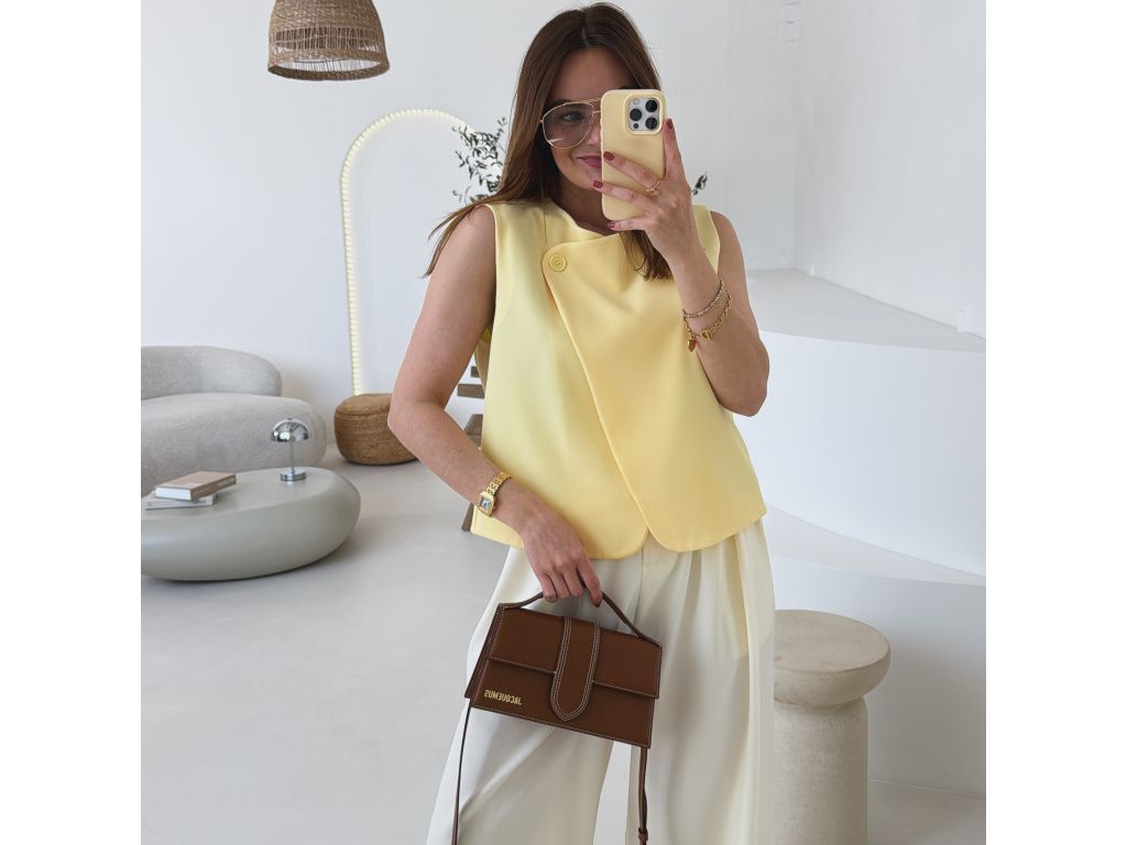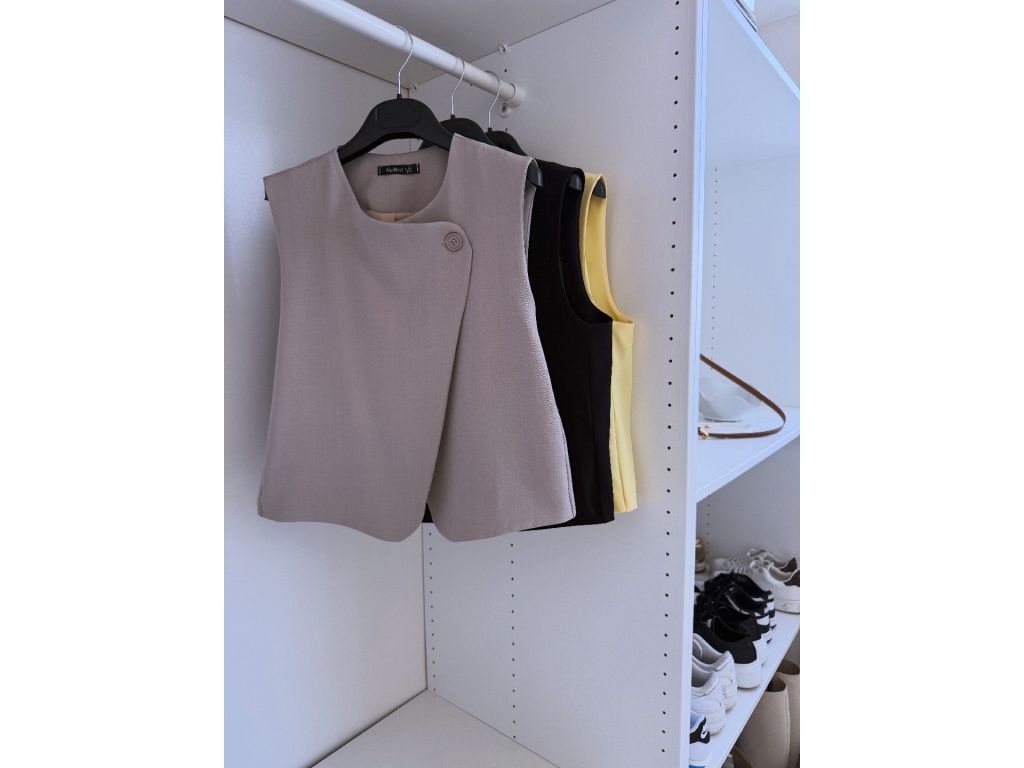 Elegantní vestička v minimalistickém střihu, která skvěle doplní jak ležérní, tak i formálnější outfit. Má jemnou podšívku pro větší komfort při nošení a zapínání u krku na knoflík, které vytváří zajímavý detail. Díky volnějšímu střihu působí moderně a velmi snadno se kombinuje. Dostupná ve žluté, černé a béžové variantě.