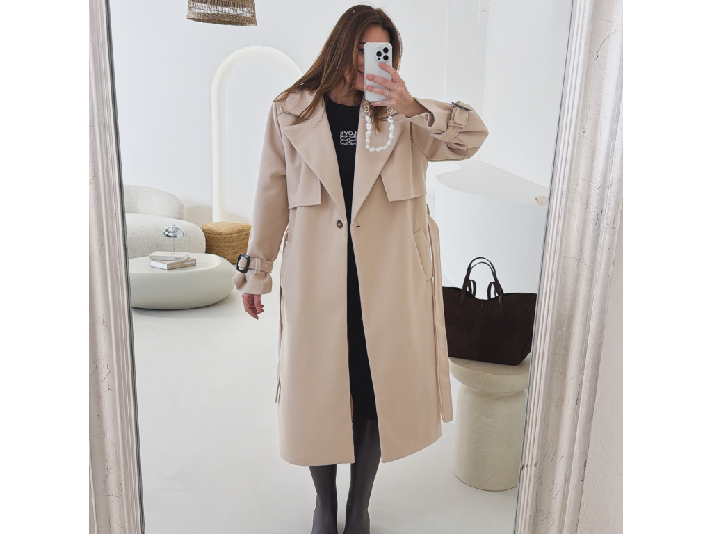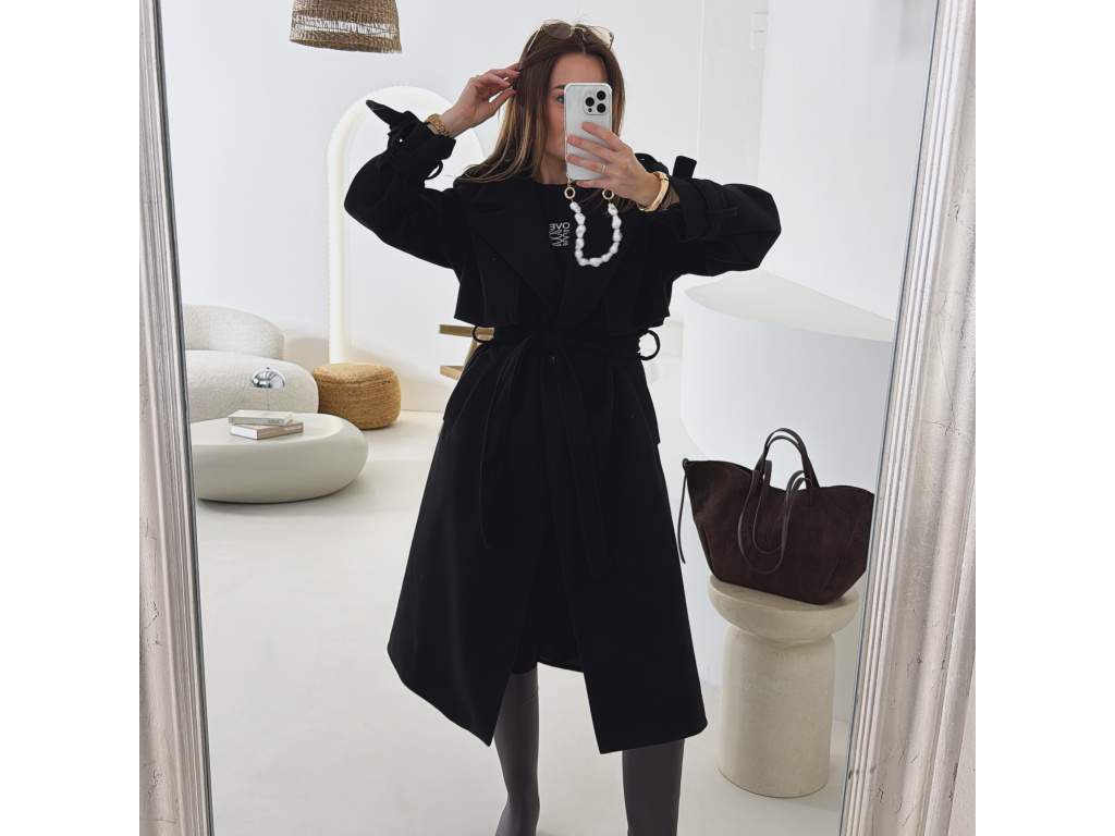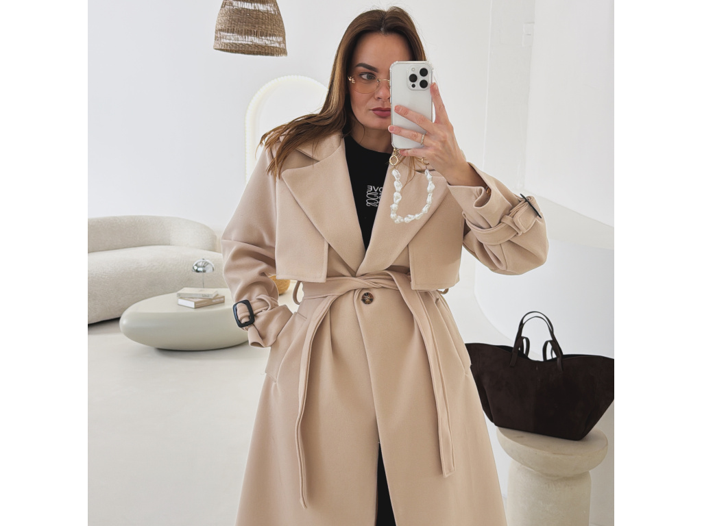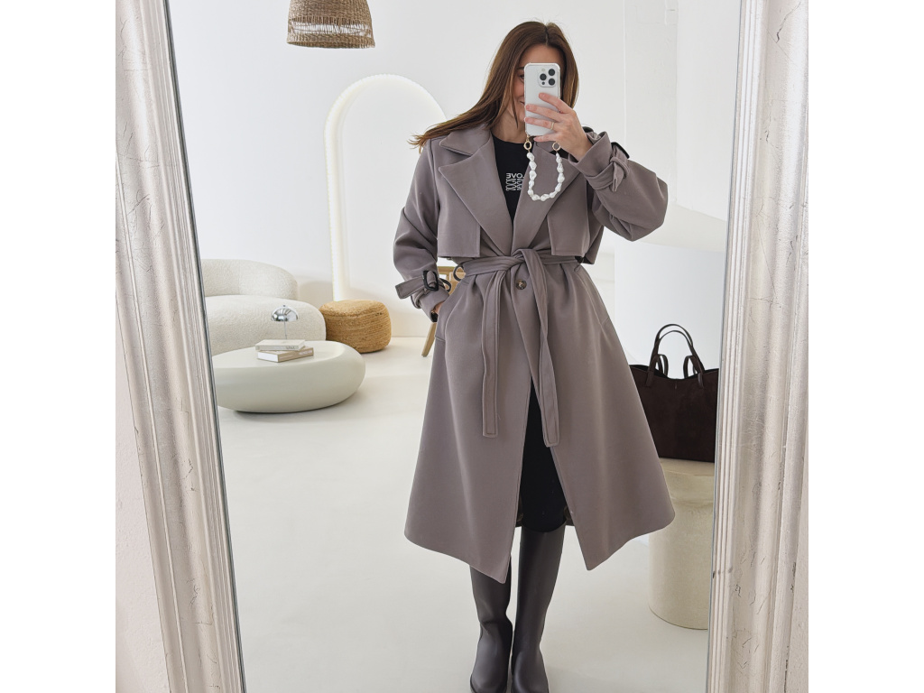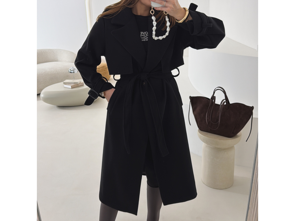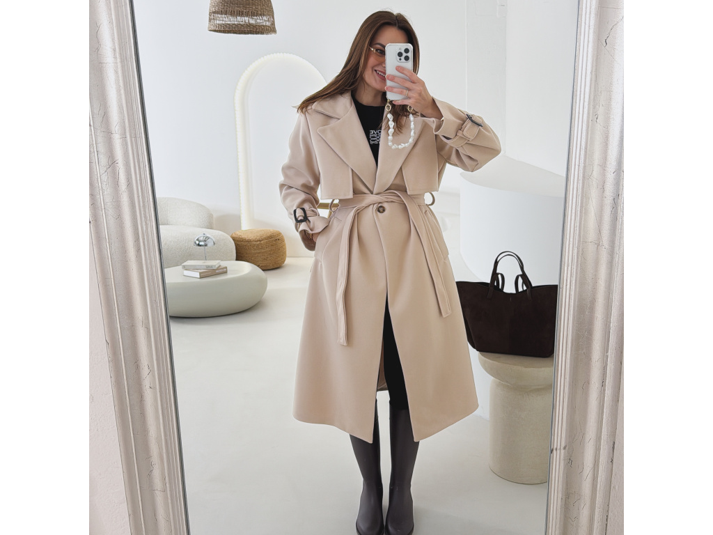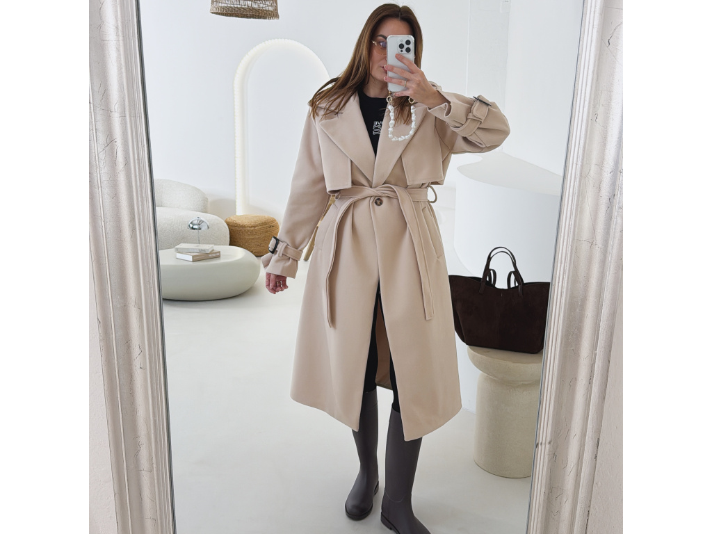Elegantní kabát s páskem, který dokonale podtrhne siluetu. Zaujme výrazným límcem, zajímavým překládaným detailem v horní části a stylovými pásky na rukávech. Díky podšívce je pohodlný a vhodný na přechodné období. Nadčasový střih, který snadno zkombinujete s elegantním i casual outfitem.