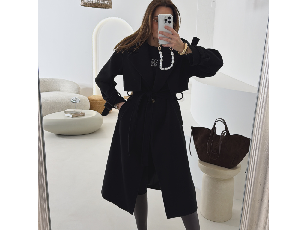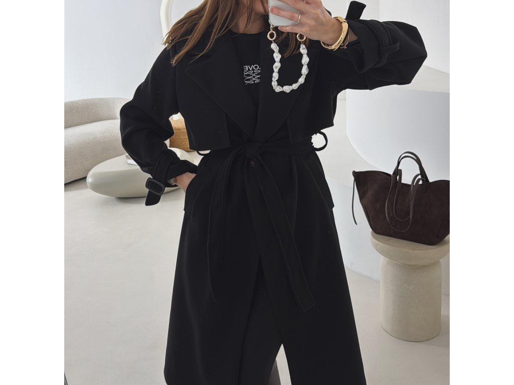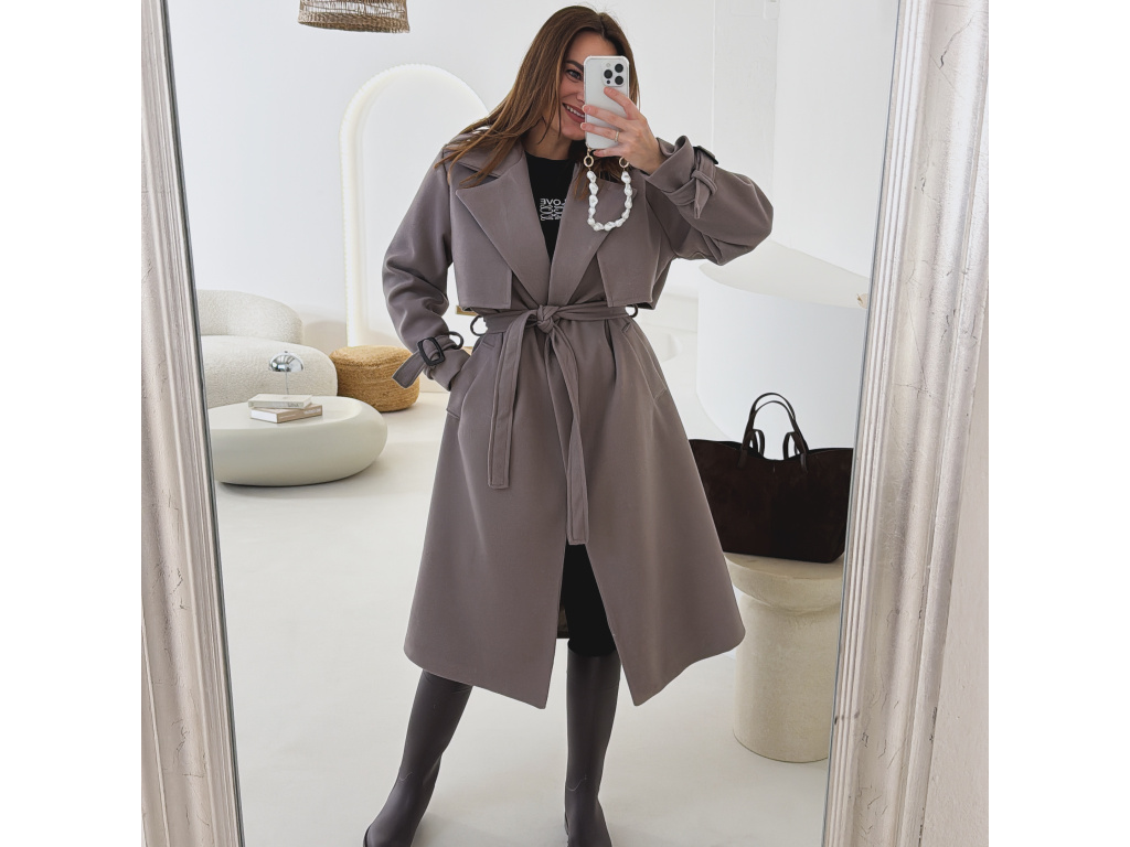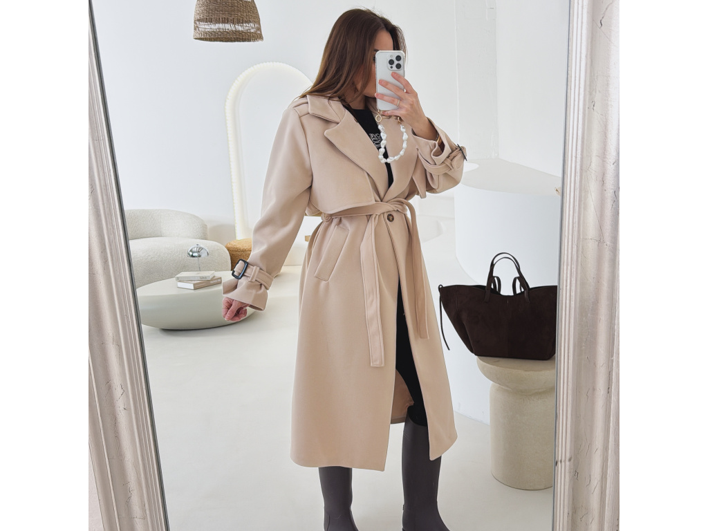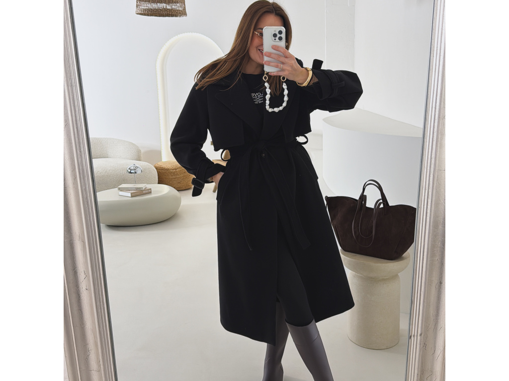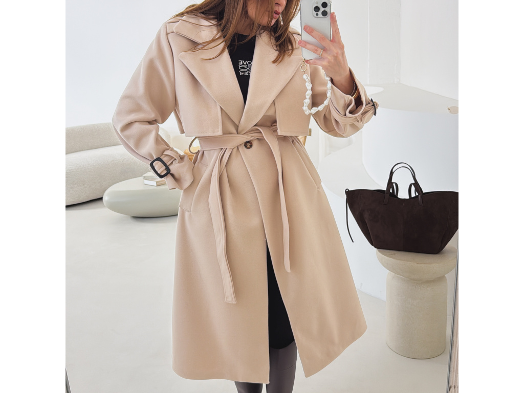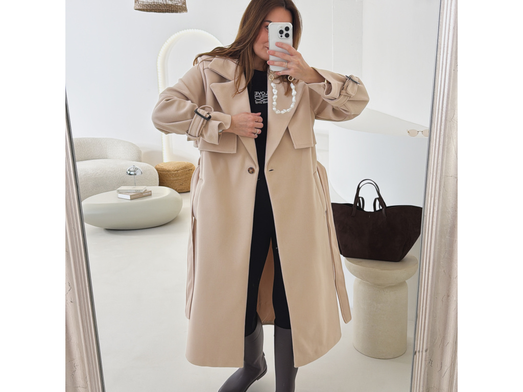 Elegantní kabát s páskem, který dokonale podtrhne siluetu. Zaujme výrazným límcem, zajímavým překládaným detailem v horní části a stylovými pásky na rukávech. Díky podšívce je pohodlný a vhodný na přechodné období. Nadčasový střih, který snadno zkombinujete s elegantním i casual outfitem.
