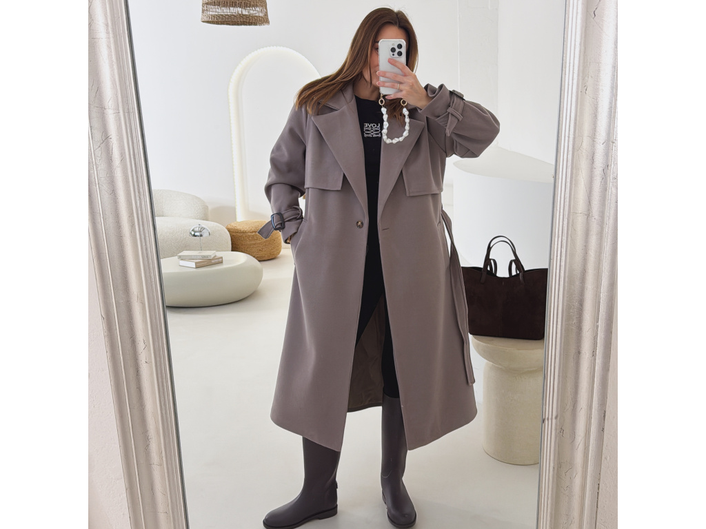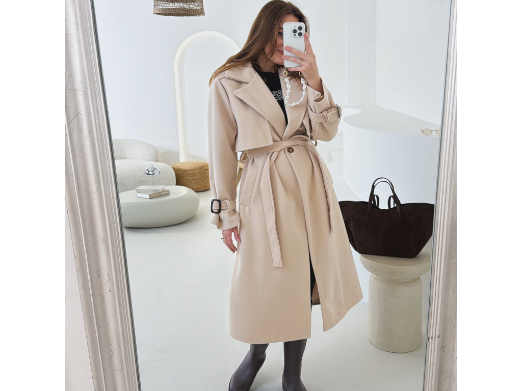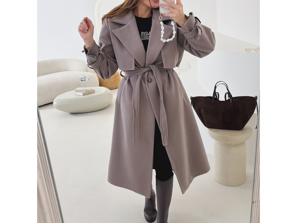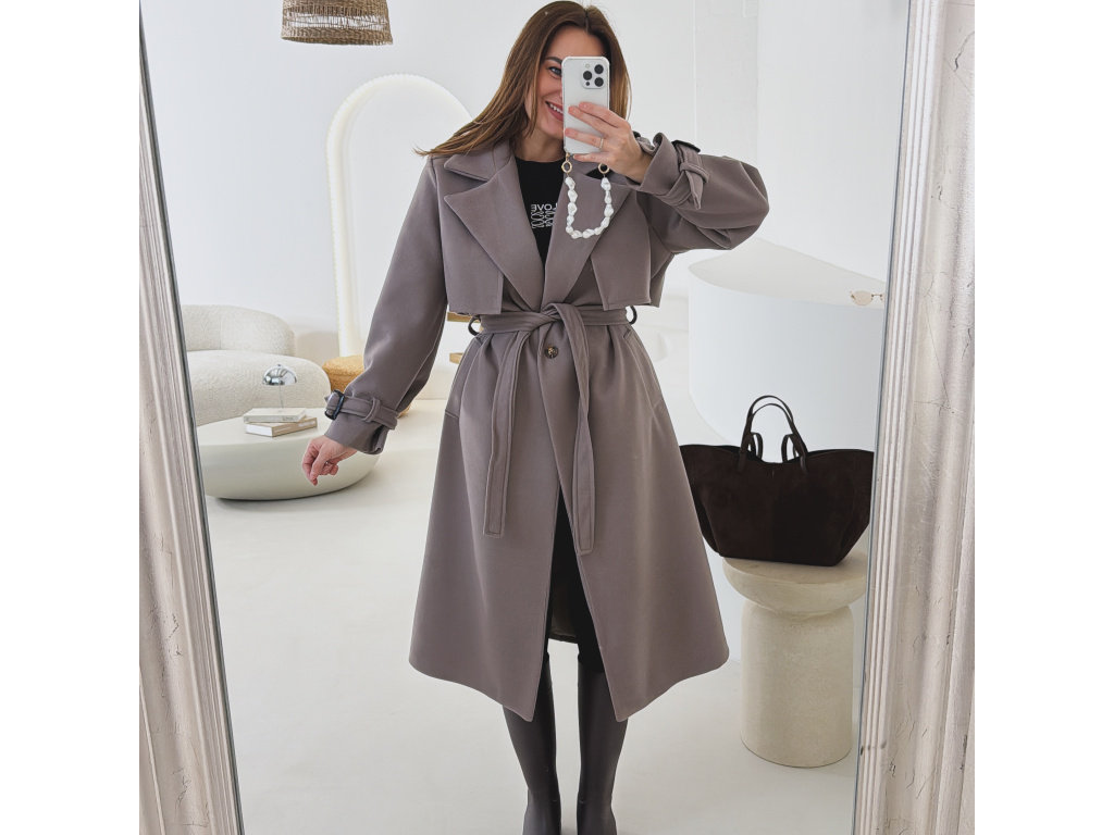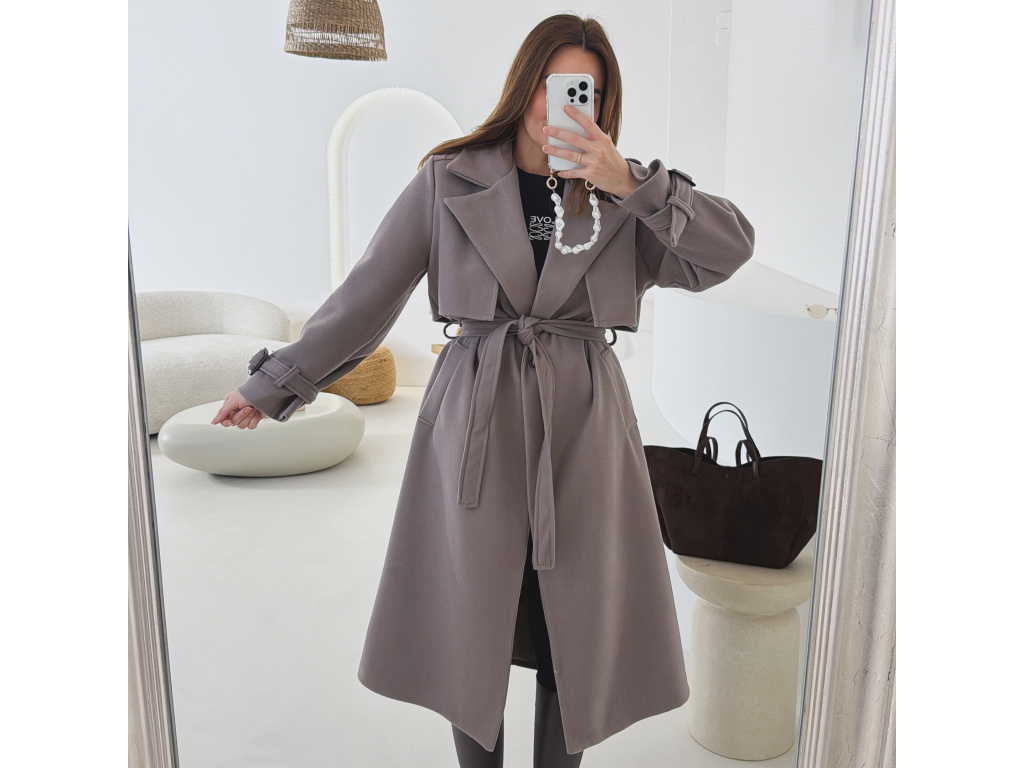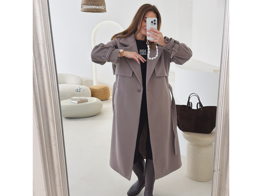 Elegantní kabát s páskem, který dokonale podtrhne siluetu. Zaujme výrazným límcem, zajímavým překládaným detailem v horní části a stylovými pásky na rukávech. Díky podšívce je pohodlný a vhodný na přechodné období. Nadčasový střih, který snadno zkombinujete s elegantním i casual outfitem.
