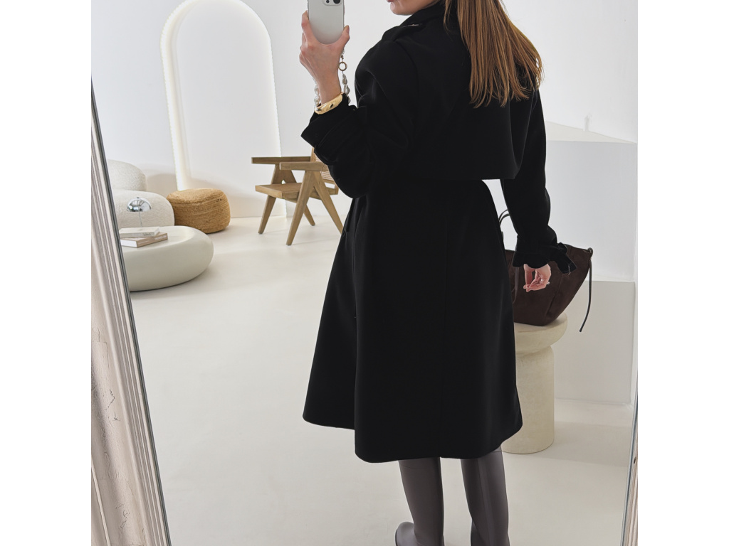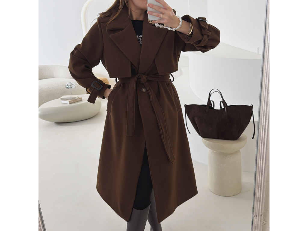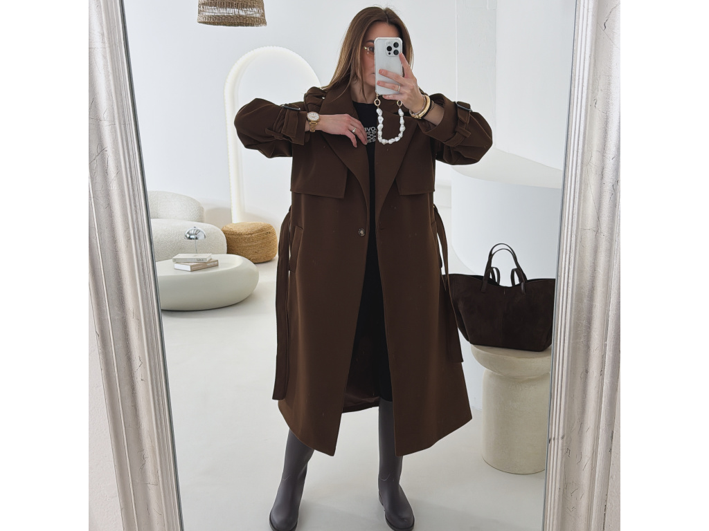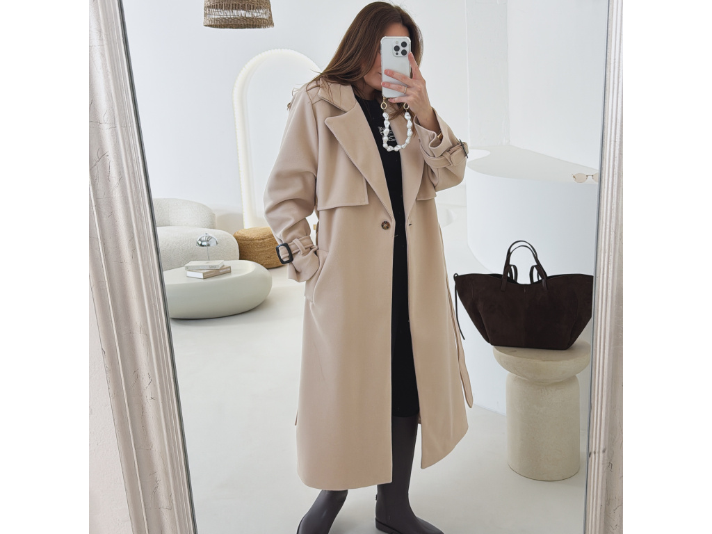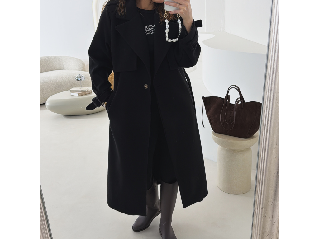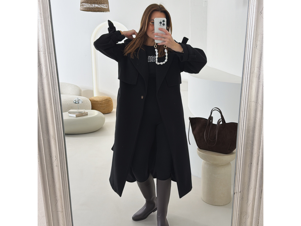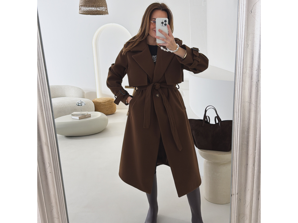 Elegantní kabát s páskem, který dokonale podtrhne siluetu. Zaujme výrazným límcem, zajímavým překládaným detailem v horní části a stylovými pásky na rukávech. Díky podšívce je pohodlný a vhodný na přechodné období. Nadčasový střih, který snadno zkombinujete s elegantním i casual outfitem.