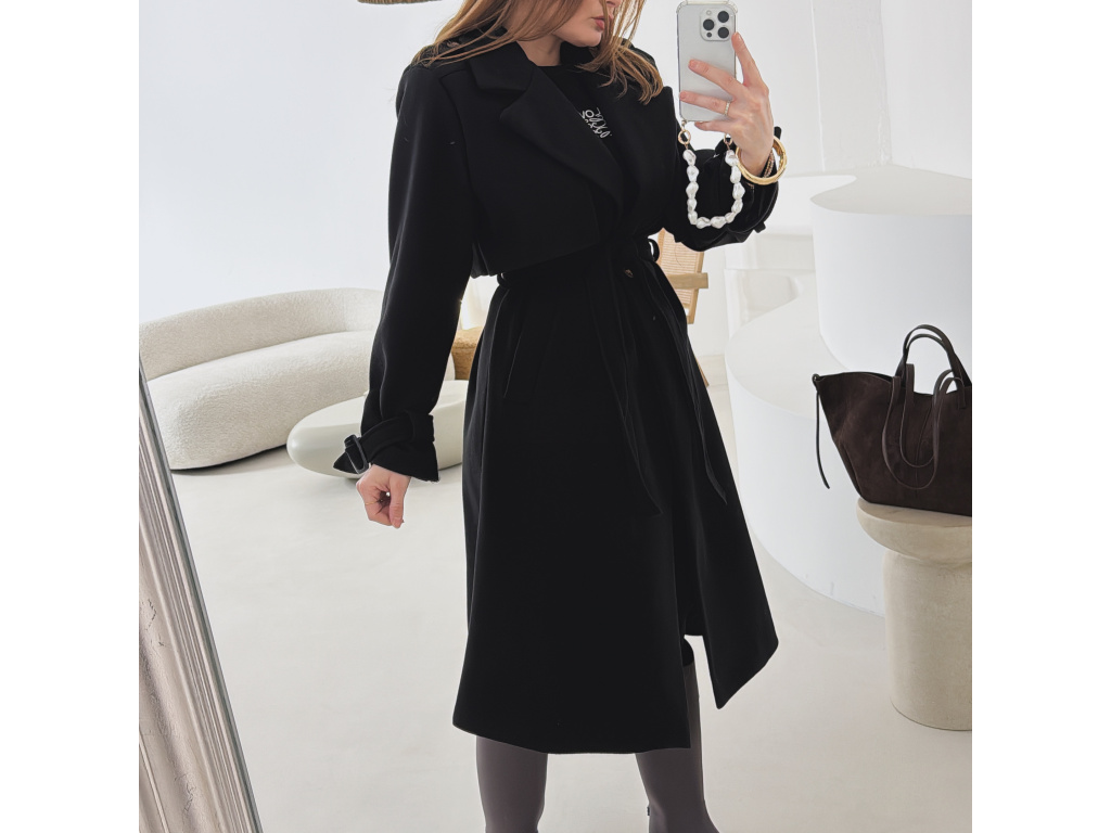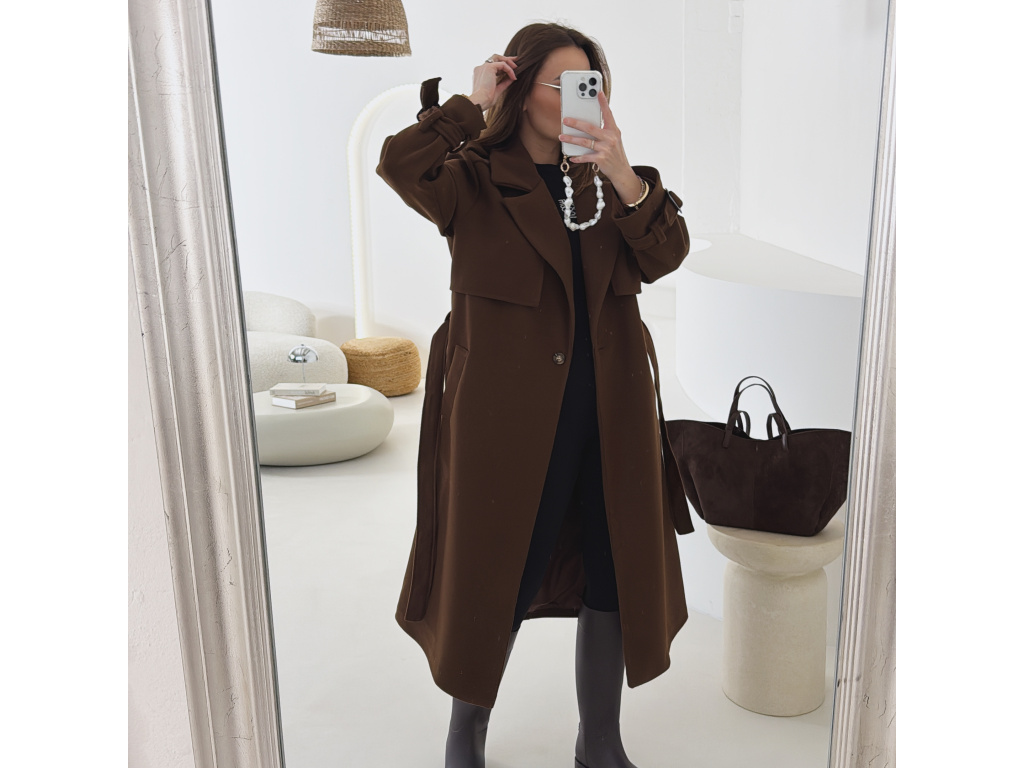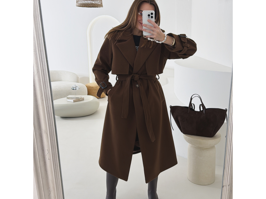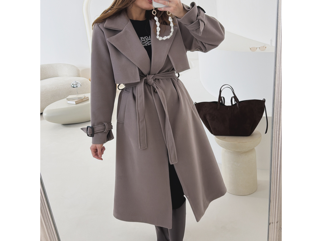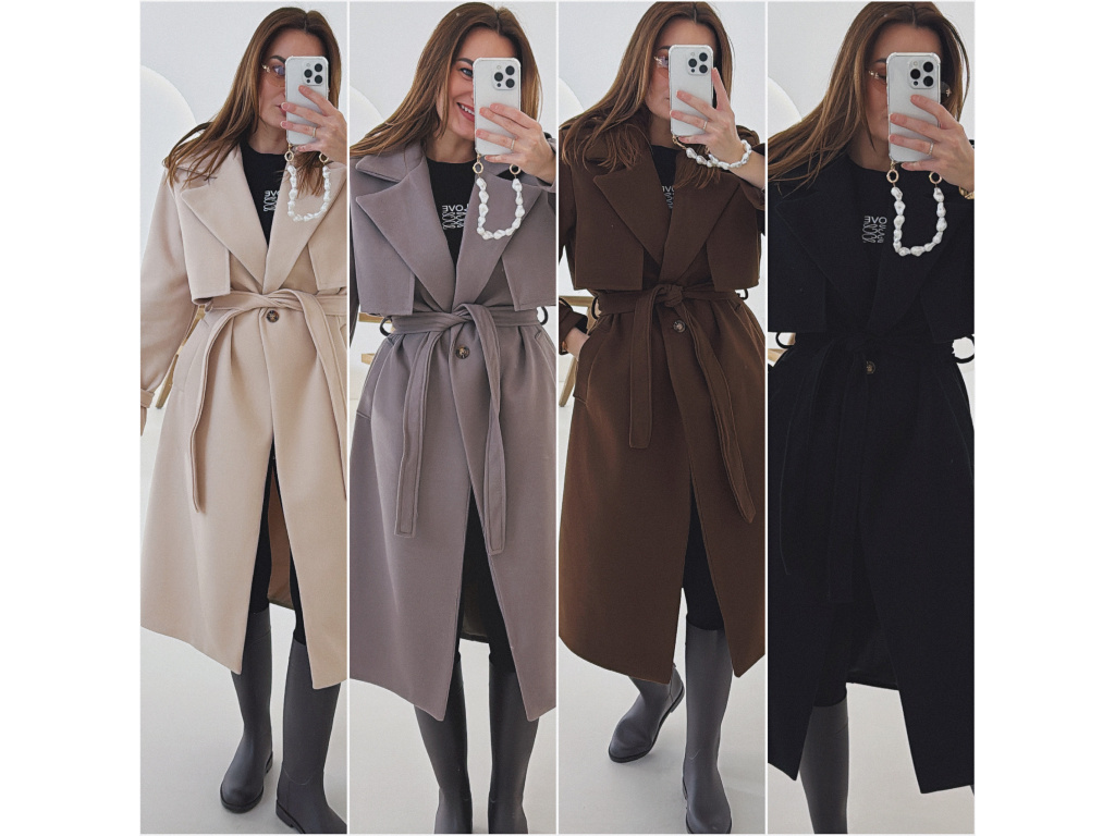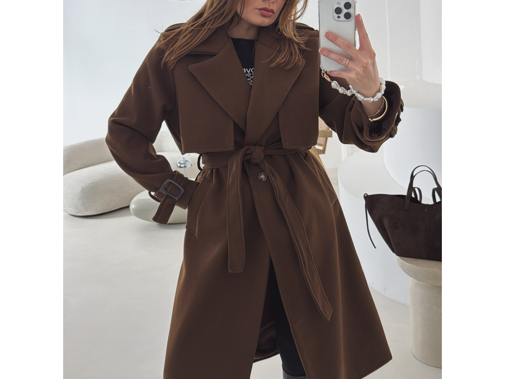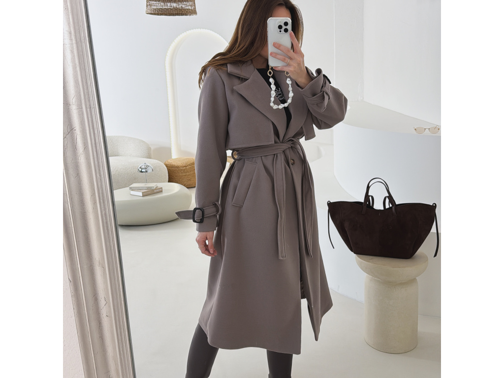 Elegantní kabát s páskem, který dokonale podtrhne siluetu. Zaujme výrazným límcem, zajímavým překládaným detailem v horní části a stylovými pásky na rukávech. Díky podšívce je pohodlný a vhodný na přechodné období. Nadčasový střih, který snadno zkombinujete s elegantním i casual outfitem.