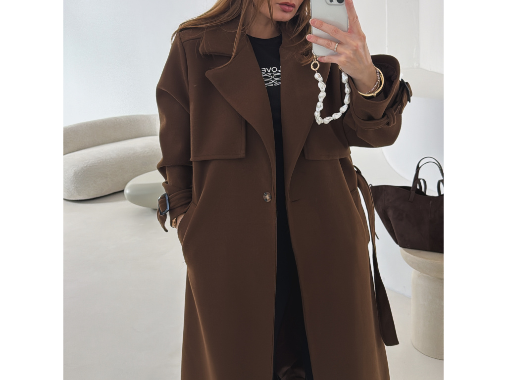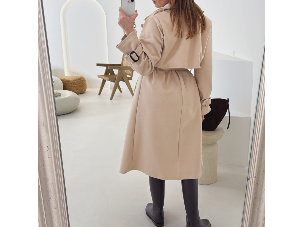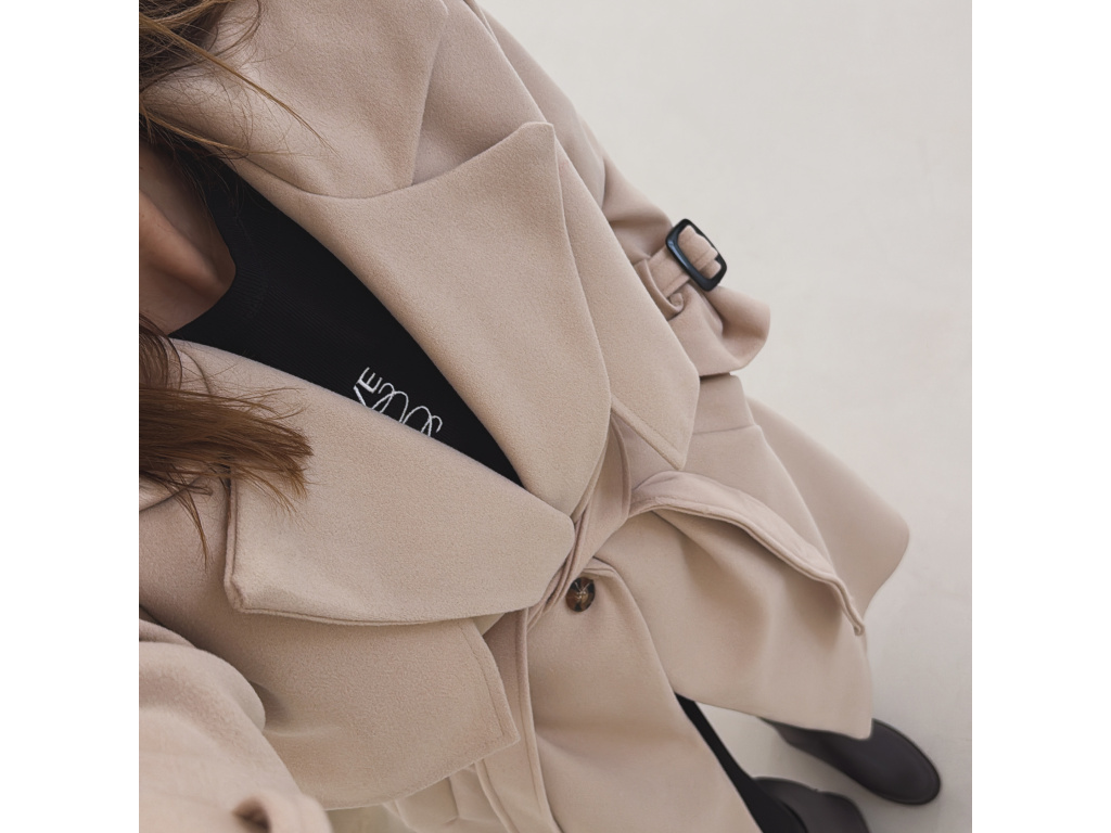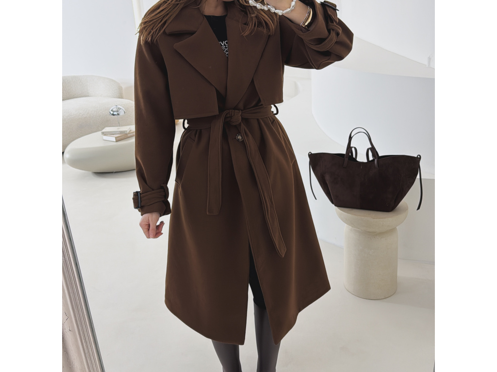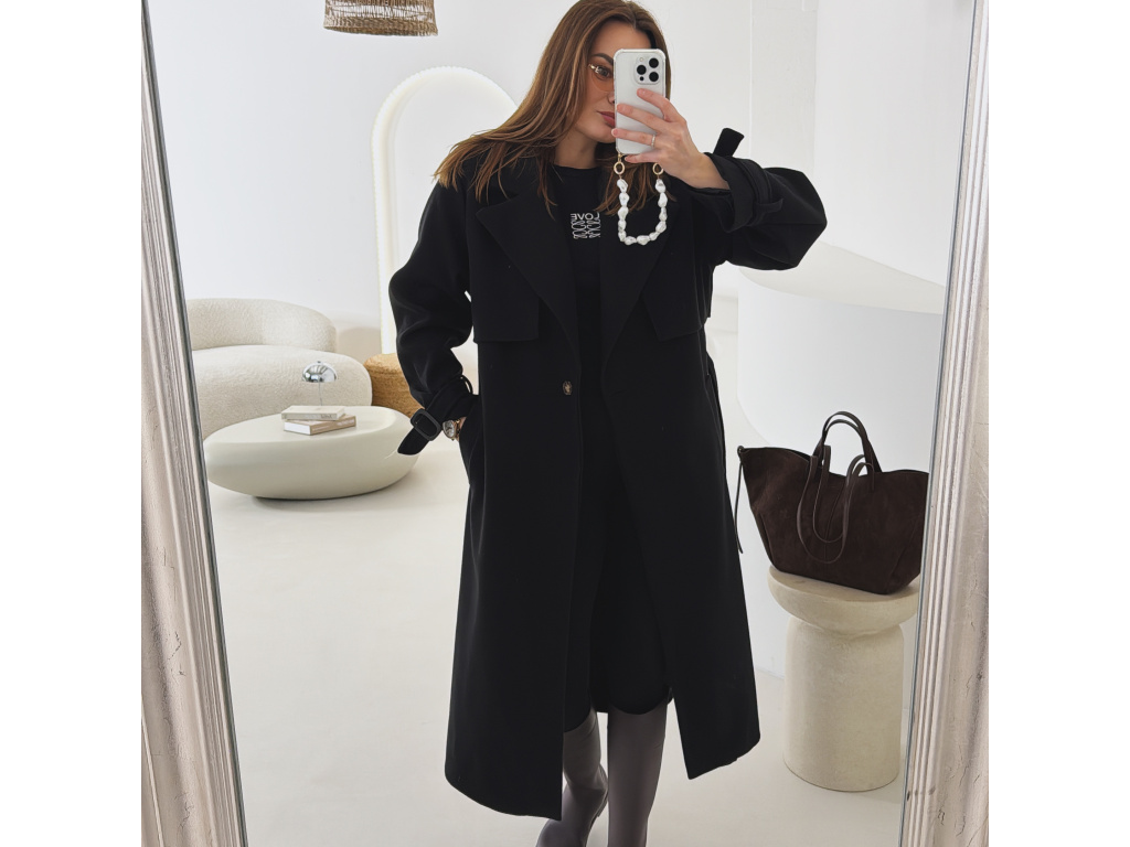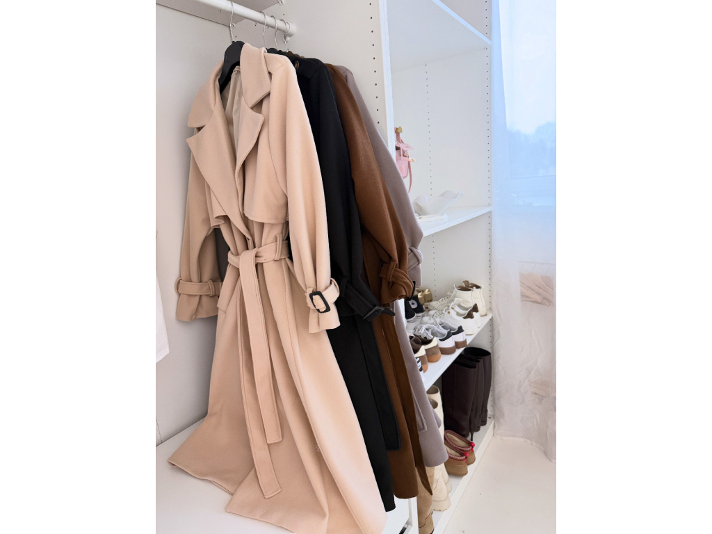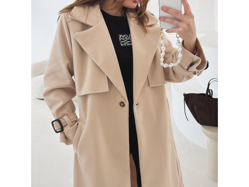 Elegantní kabát s páskem, který dokonale podtrhne siluetu. Zaujme výrazným límcem, zajímavým překládaným detailem v horní části a stylovými pásky na rukávech. Díky podšívce je pohodlný a vhodný na přechodné období. Nadčasový střih, který snadno zkombinujete s elegantním i casual outfitem.
