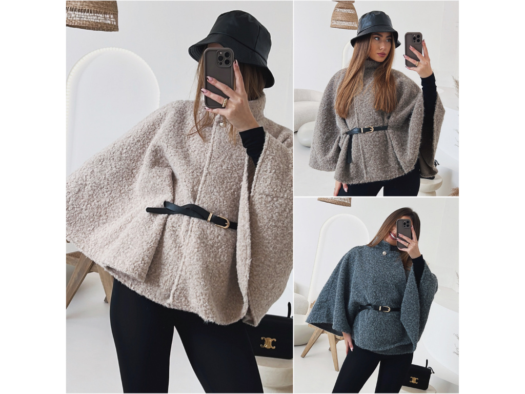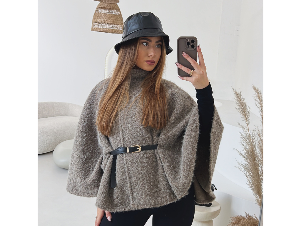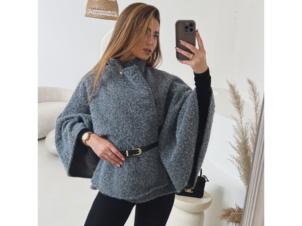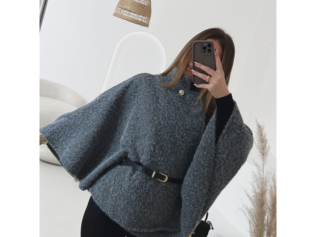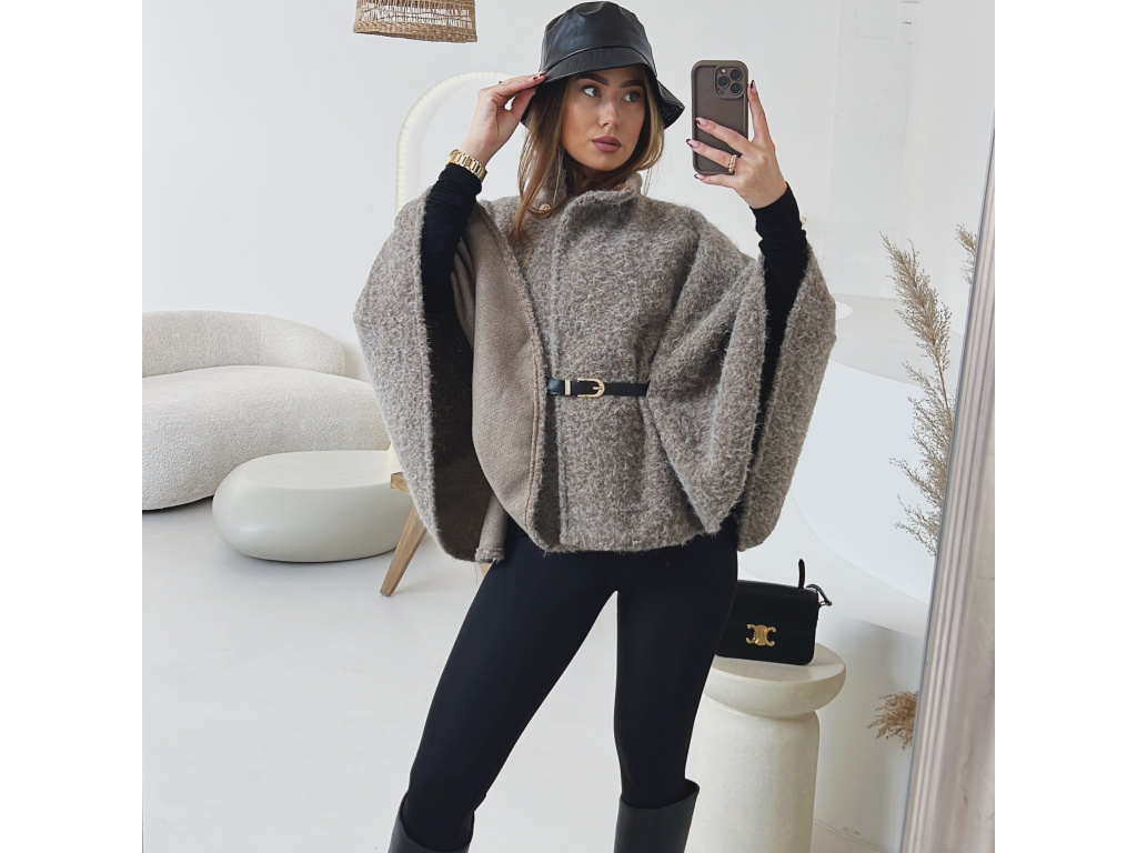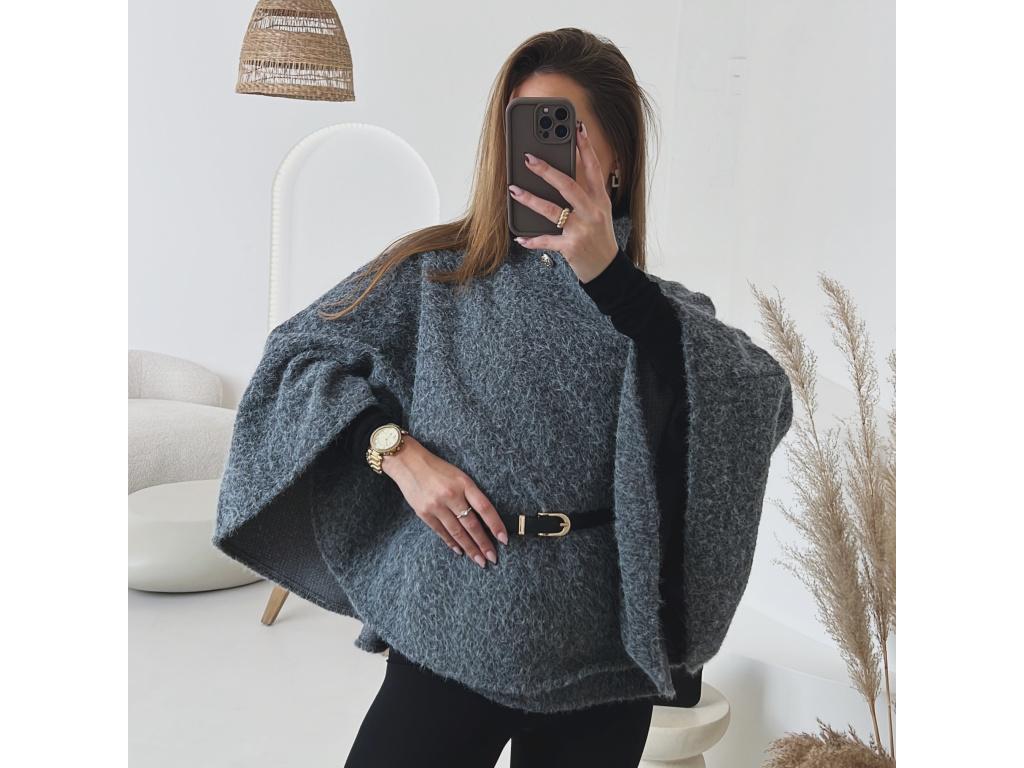 Objevte dokonalou kombinaci elegance a pohodlí v tomto nadčasovém ponču. Je vyrobeno z měkkého, hřejivého materiálu, který vás zahřeje v chladnějších dnech a zároveň dodá outfitu šmrnc. Volný střih umožňuje pohodlné vrstvení, zatímco černý pásek v pase krásně zvýrazní ženskou siluetu. Pončo má moderní stojáček se zapínáním na knoflík a široké rukávy, které působí vzdušně a zároveň elegantně. Skvěle se hodí jak k ležérnímu outfitu s džínami, tak i k elegantnějšímu looku s kozačkami. Velikost je univerzální, sedí na XS, S, M.