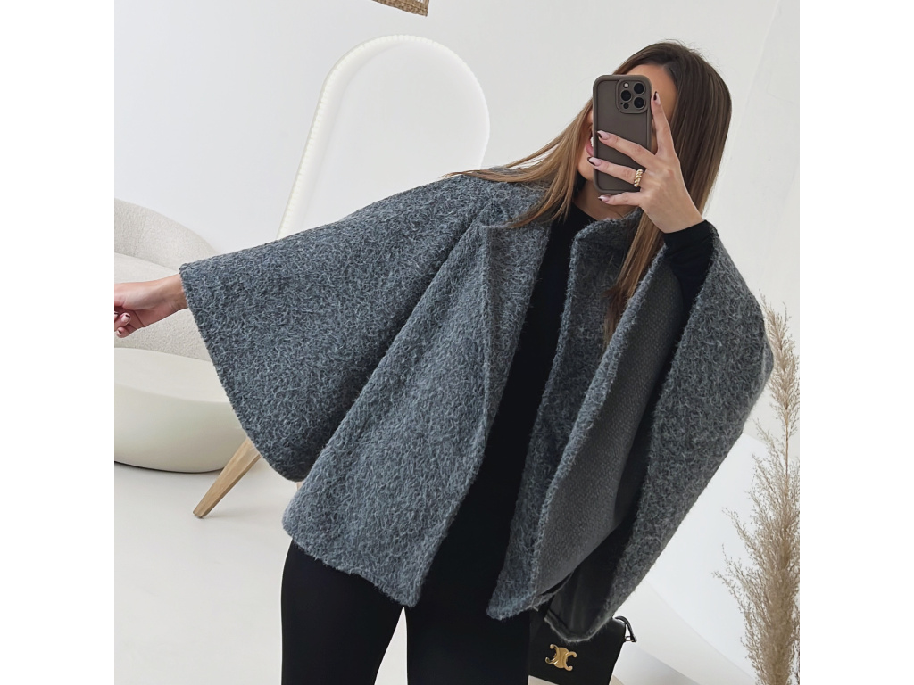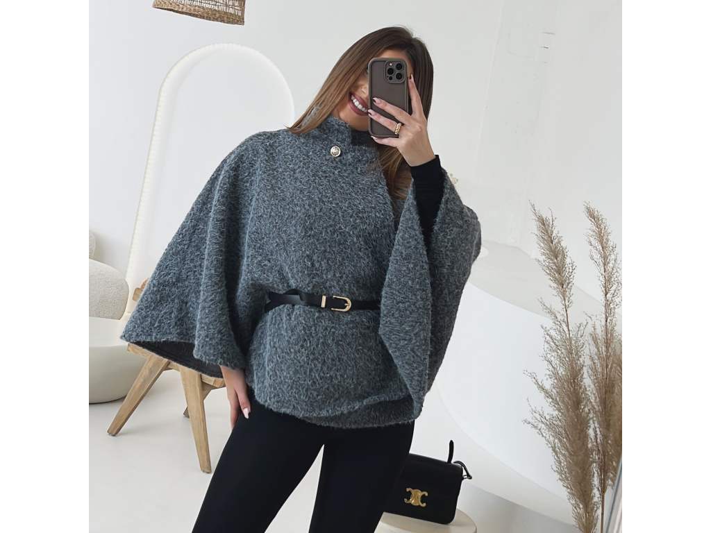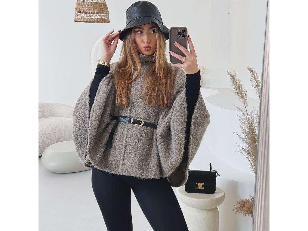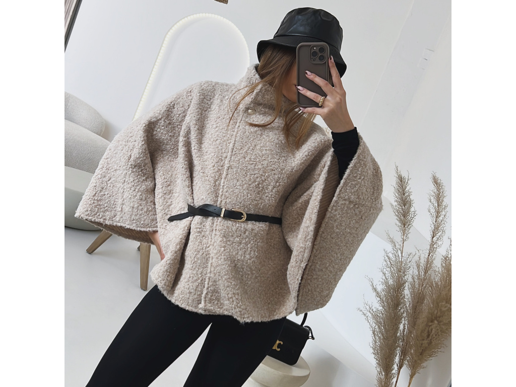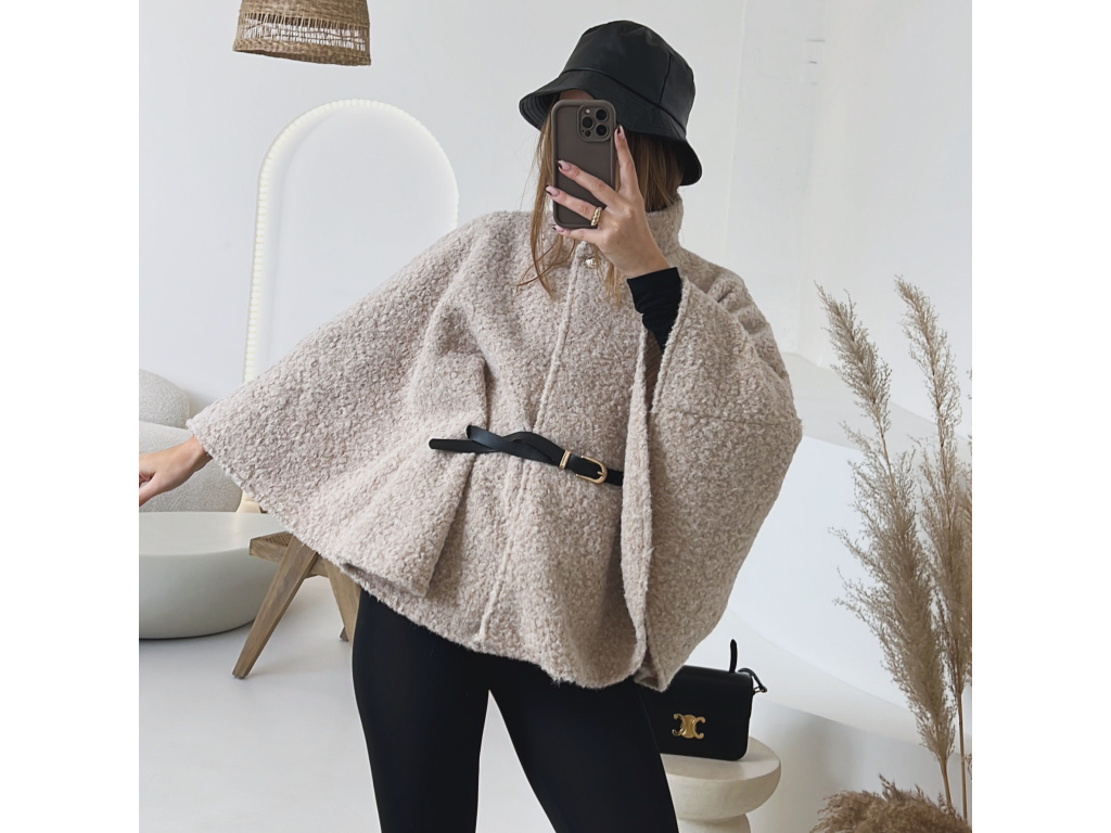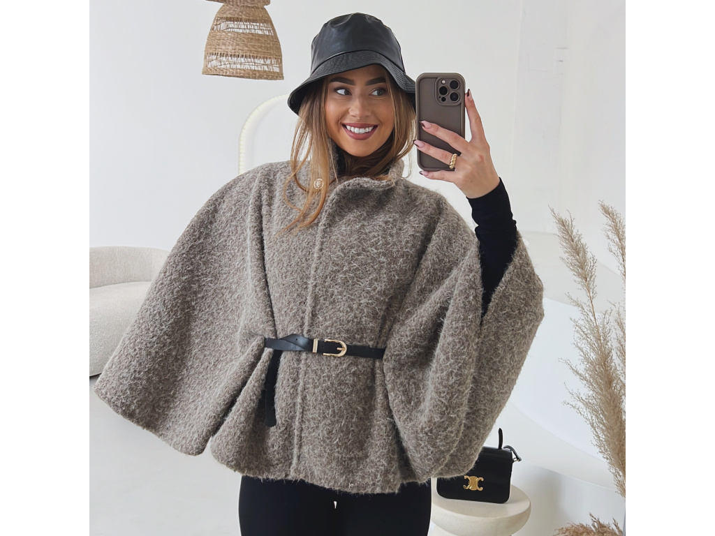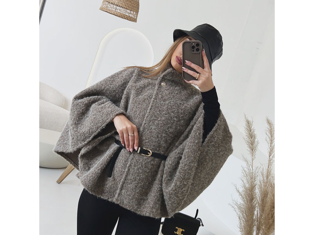 Objevte dokonalou kombinaci elegance a pohodlí v tomto nadčasovém ponču. Je vyrobeno z měkkého, hřejivého materiálu, který vás zahřeje v chladnějších dnech a zároveň dodá outfitu šmrnc. Volný střih umožňuje pohodlné vrstvení, zatímco černý pásek v pase krásně zvýrazní ženskou siluetu. Pončo má moderní stojáček se zapínáním na knoflík a široké rukávy, které působí vzdušně a zároveň elegantně. Skvěle se hodí jak k ležérnímu outfitu s džínami, tak i k elegantnějšímu looku s kozačkami. Velikost je univerzální, sedí na XS, S, M.