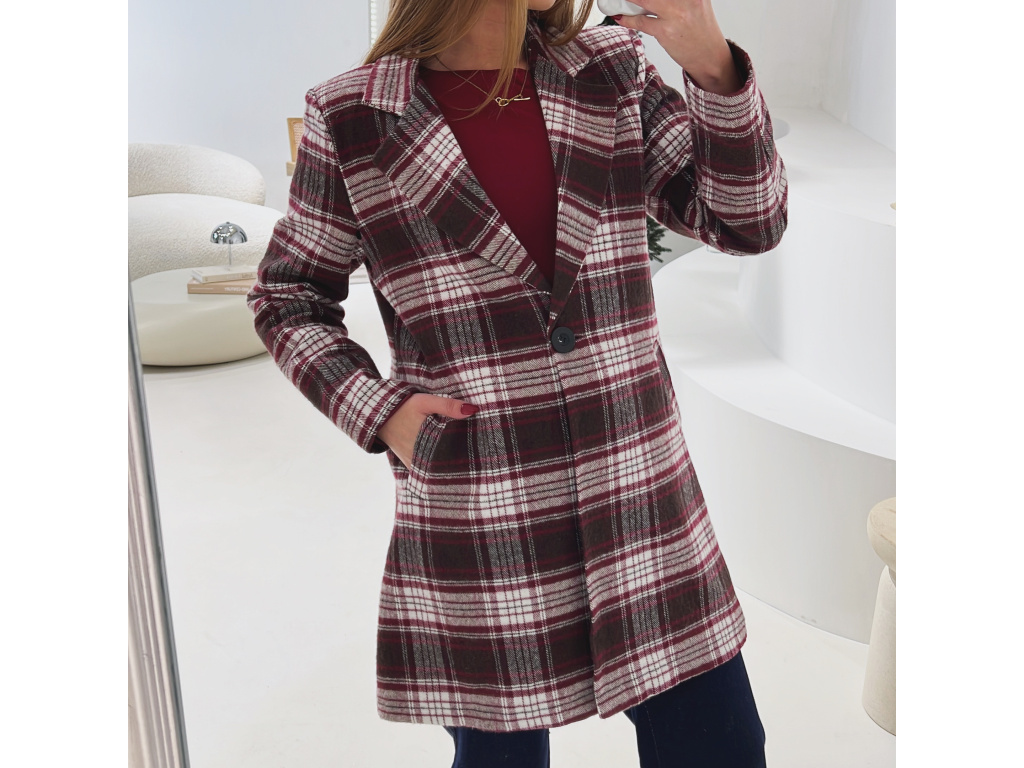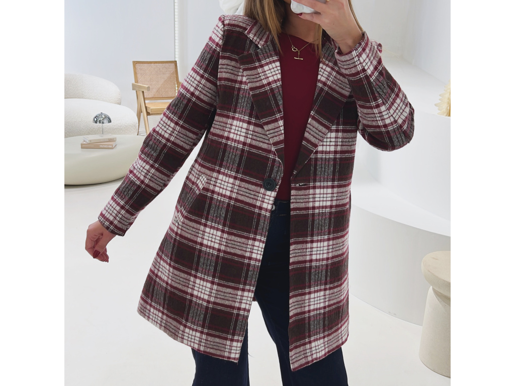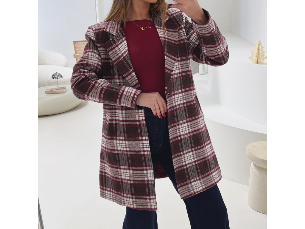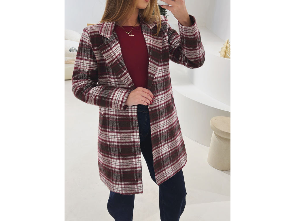 Stylový károvaný kabát ve vínových tónech, který dodá každému outfitu hřejivý a elegantní nádech. Zapíná se na jeden knoflík, má praktické přední kapsy a je vybaven podšívkou pro pohodlné celodenní nošení. Skvělá volba pro podzimní i zimní dny.