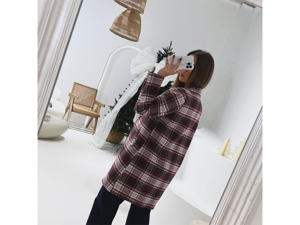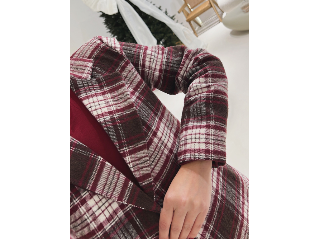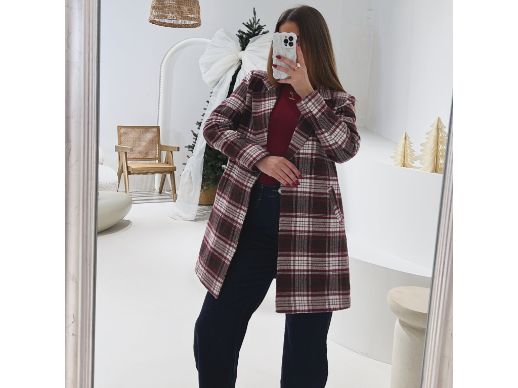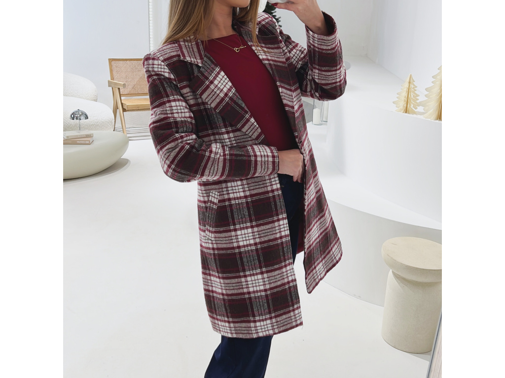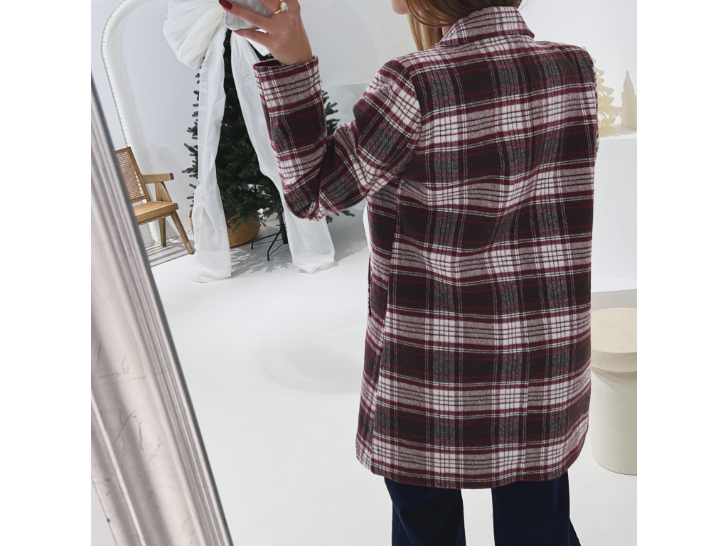 Stylový károvaný kabát ve vínových tónech, který dodá každému outfitu hřejivý a elegantní nádech. Zapíná se na jeden knoflík, má praktické přední kapsy a je vybaven podšívkou pro pohodlné celodenní nošení. Skvělá volba pro podzimní i zimní dny.