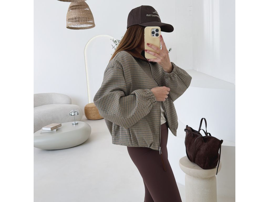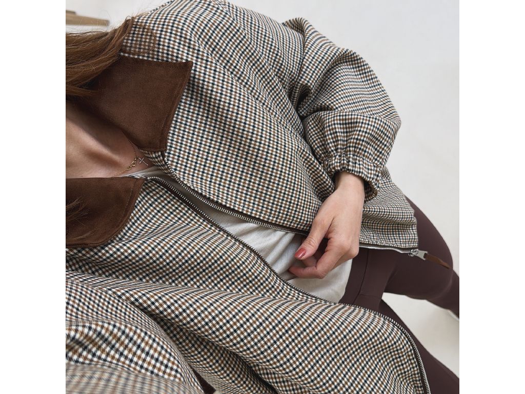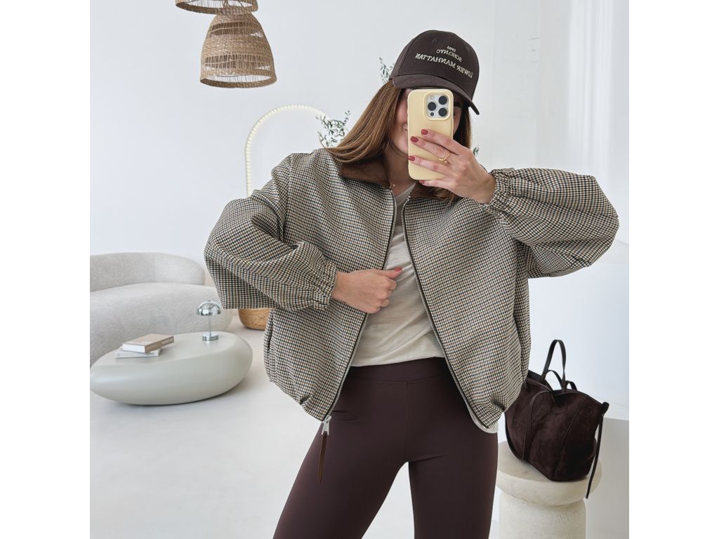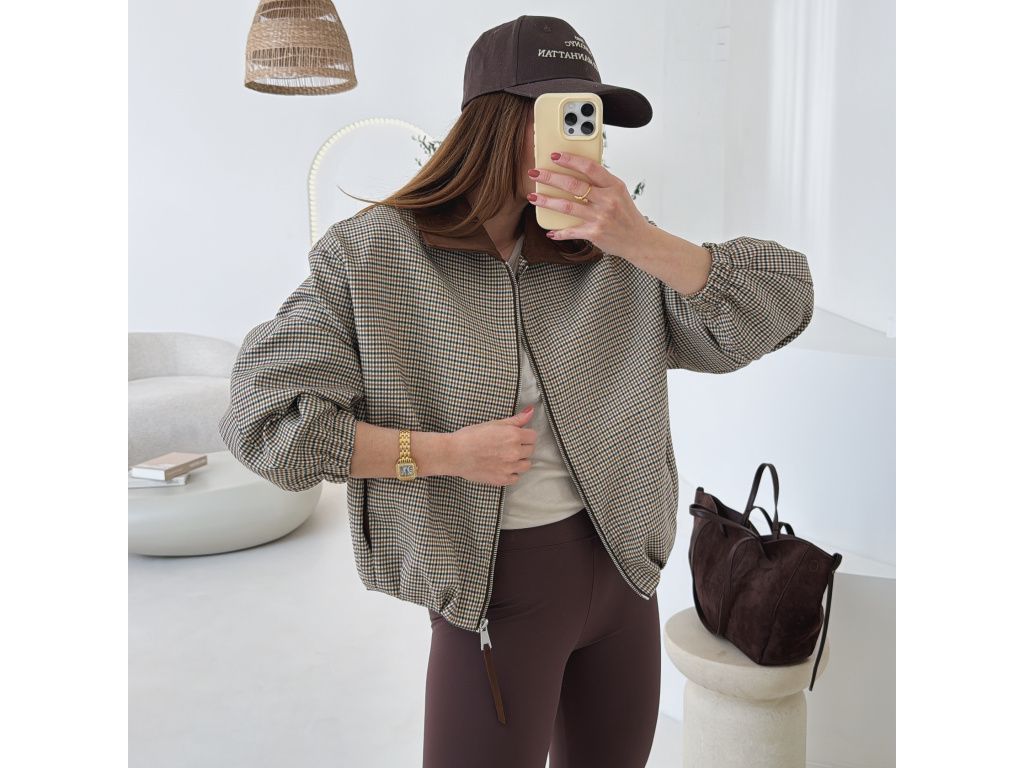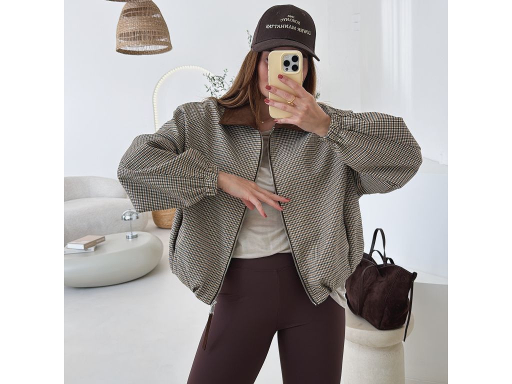 Stylový bomber s jemným kostkovaným vzorem, který dodá outfitu šmrnc a originalitu. Má volnější oversize střih, takže působí uvolněně a zároveň trendy. Výrazný límec a detaily v hnědém tónu krásně ladí se zipem a celkovým designem. Rukávy jsou zakončené do gumy, takže hezky drží tvar. Bunda má kapsy. Nechybí podšívka pro větší komfort při nošení.