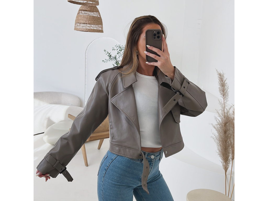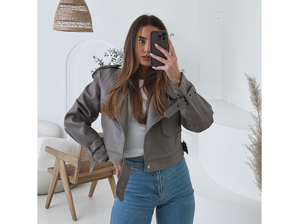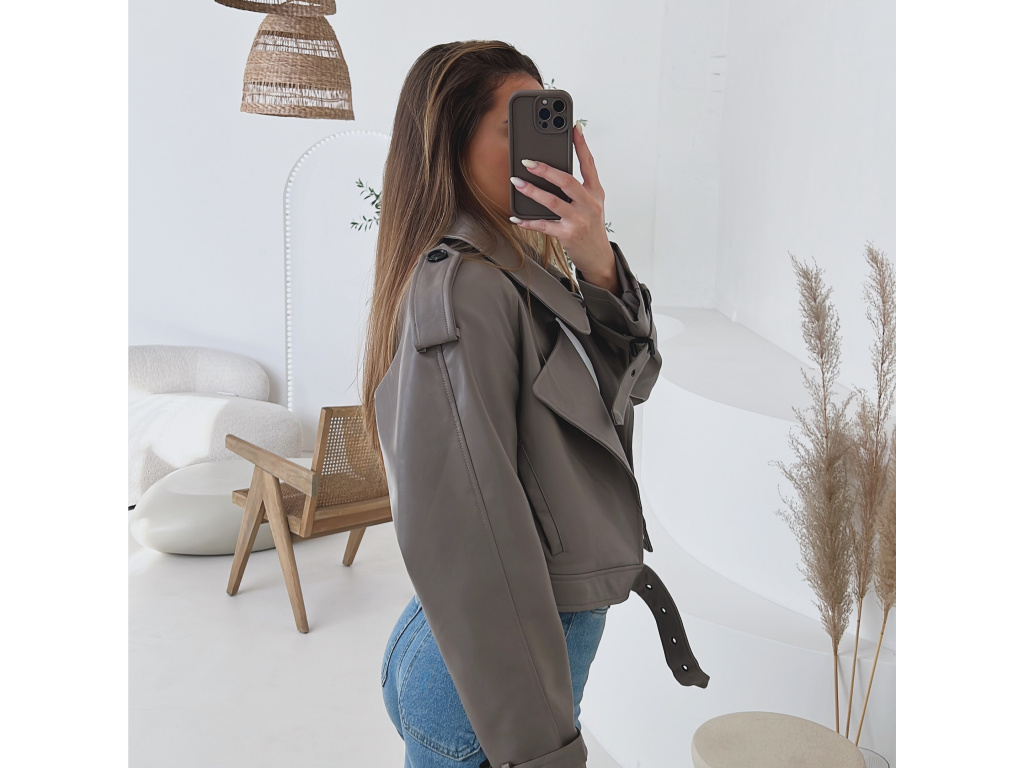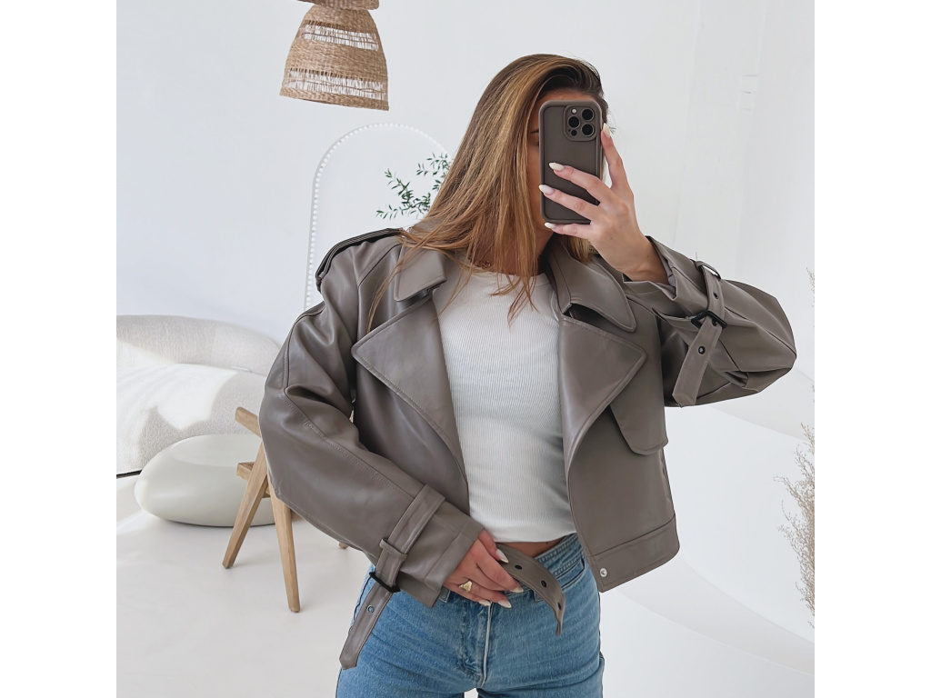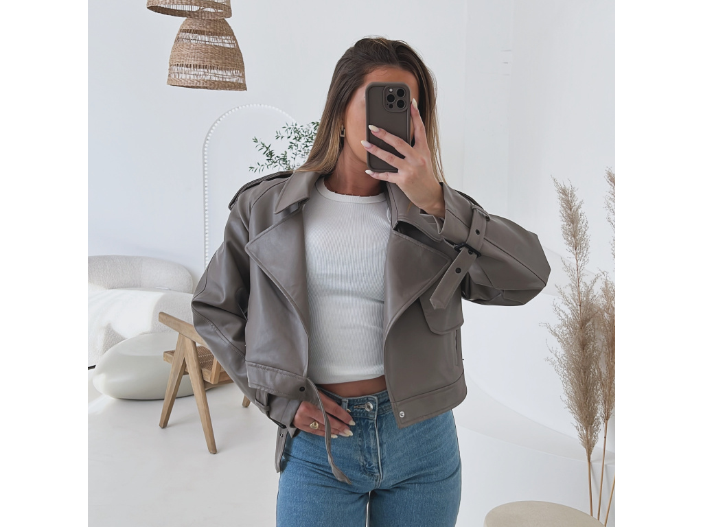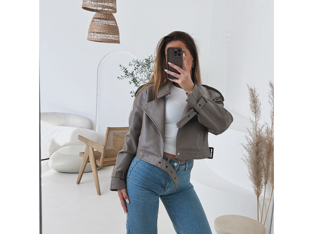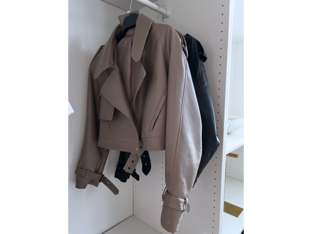 Stylová koženková bunda v moderním střihu, která dodá každému outfitu sebevědomý a elegantní vzhled. Je dostupná v taupe a černé barvě s kontrastními černými detaily. Díky vyztuženým ramenům, velkým klopám a ochrannému štítu působí luxusně a nadčasově. Praktické zapínání doplňují nastavitelné pásky na rukávech i v pase, které krásně tvarují siluetu.