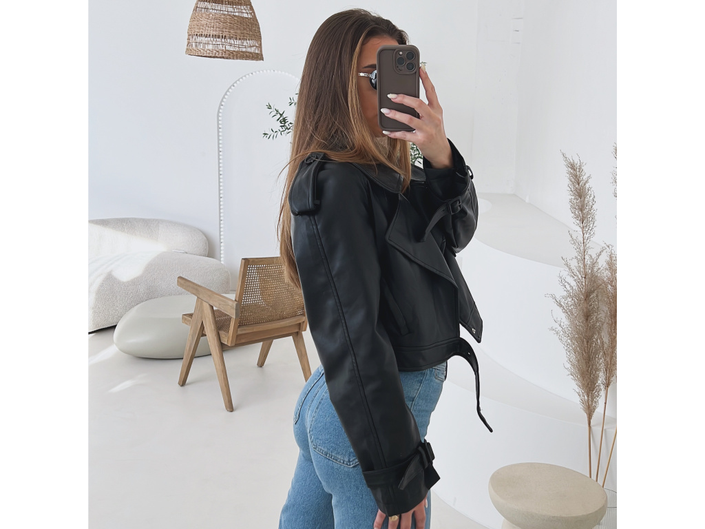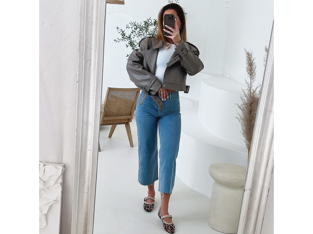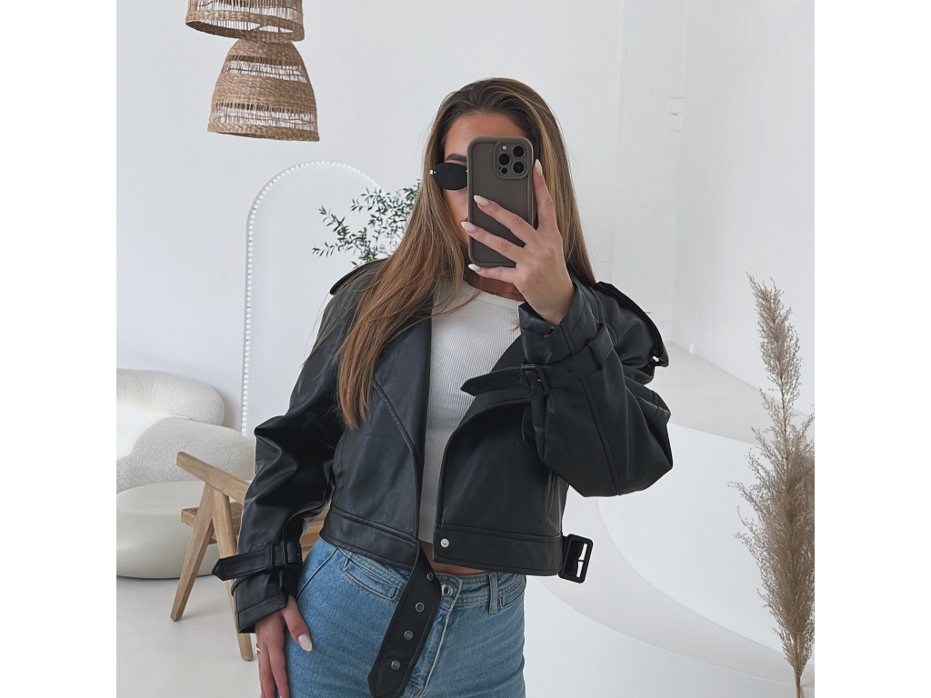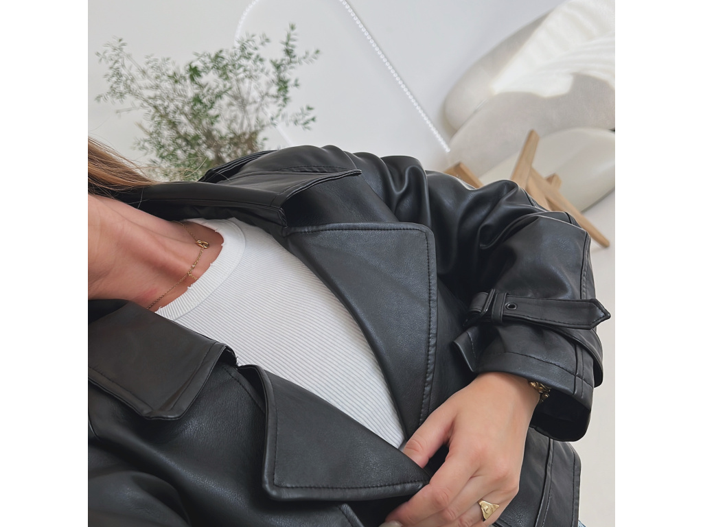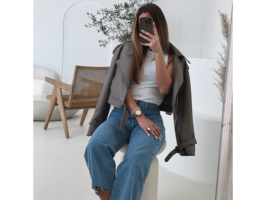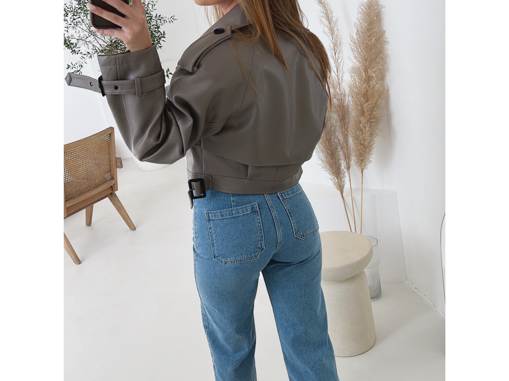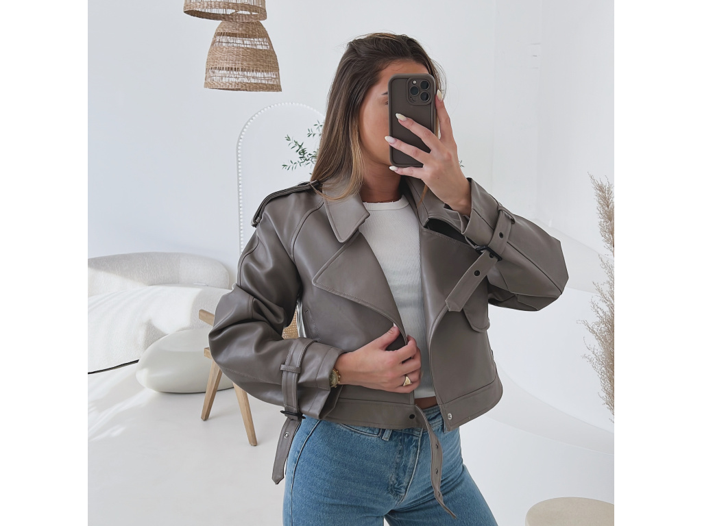 Stylová koženková bunda v moderním střihu, která dodá každému outfitu sebevědomý a elegantní vzhled. Je dostupná v taupe a černé barvě s kontrastními černými detaily. Díky vyztuženým ramenům, velkým klopám a ochrannému štítu působí luxusně a nadčasově. Praktické zapínání doplňují nastavitelné pásky na rukávech i v pase, které krásně tvarují siluetu.