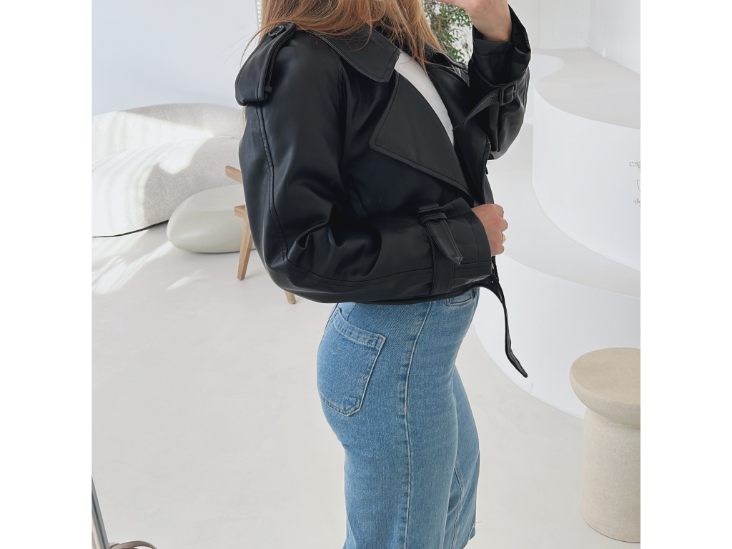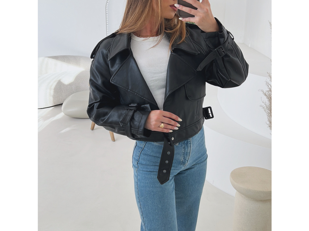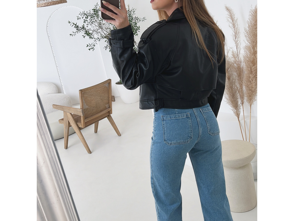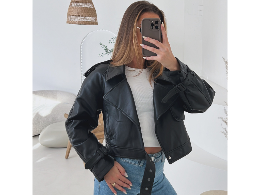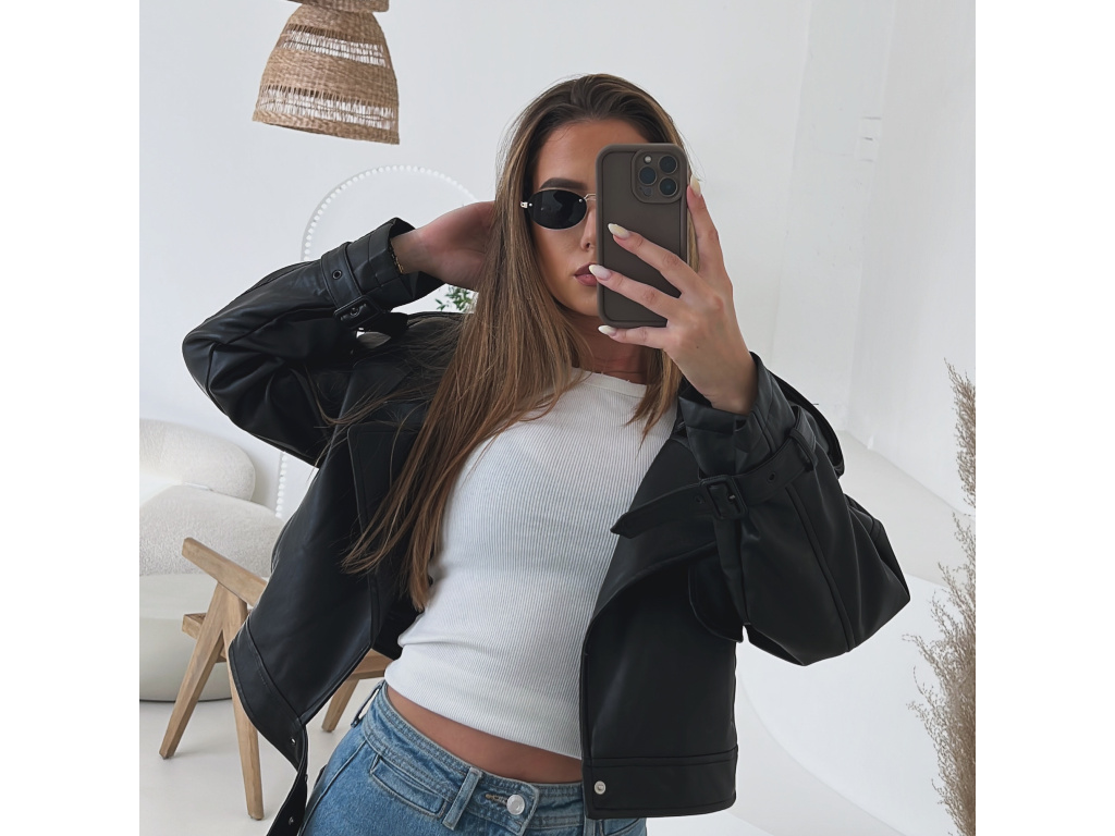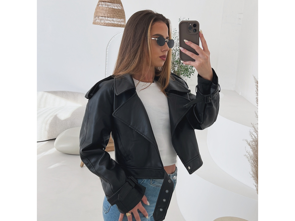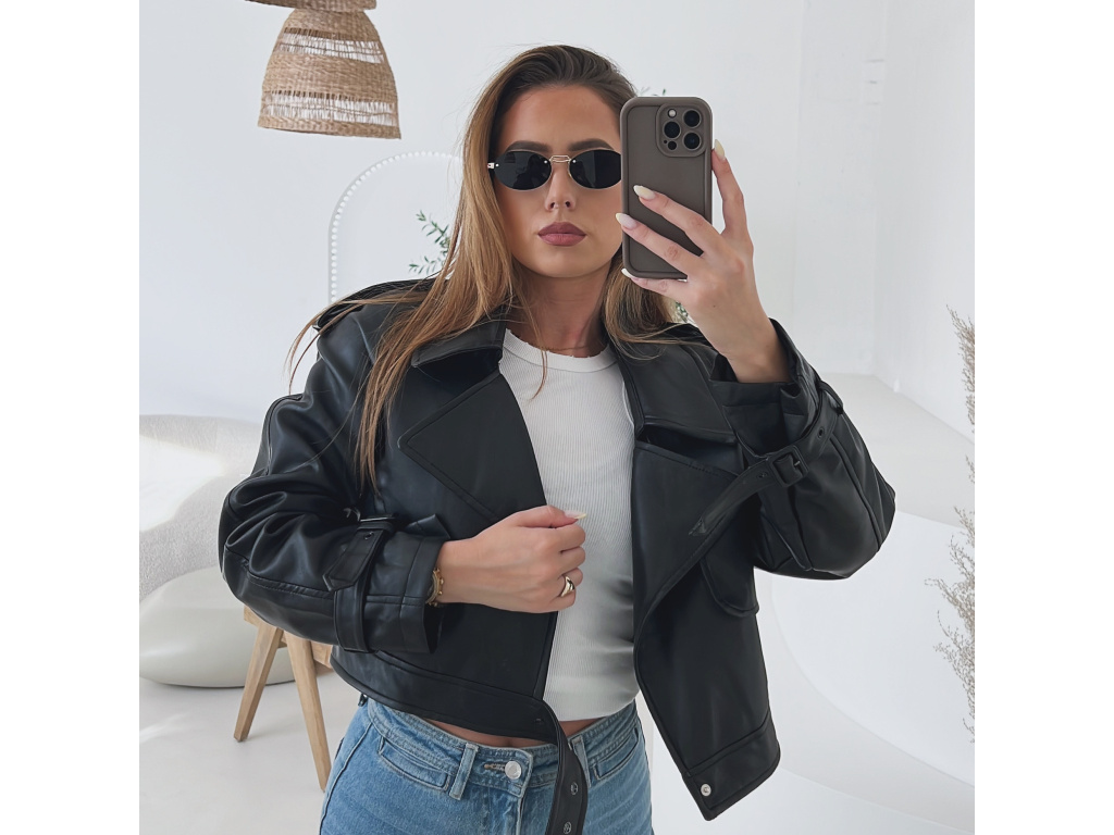 Stylová koženková bunda v moderním střihu, která dodá každému outfitu sebevědomý a elegantní vzhled. Je dostupná v taupe a černé barvě s kontrastními černými detaily. Díky vyztuženým ramenům, velkým klopám a ochrannému štítu působí luxusně a nadčasově. Praktické zapínání doplňují nastavitelné pásky na rukávech i v pase, které krásně tvarují siluetu.