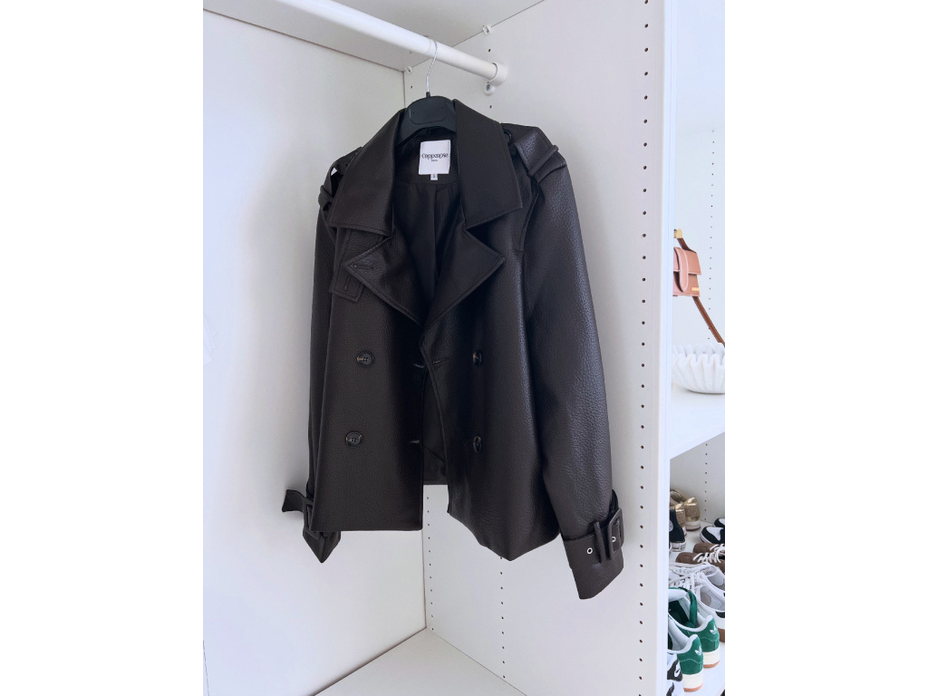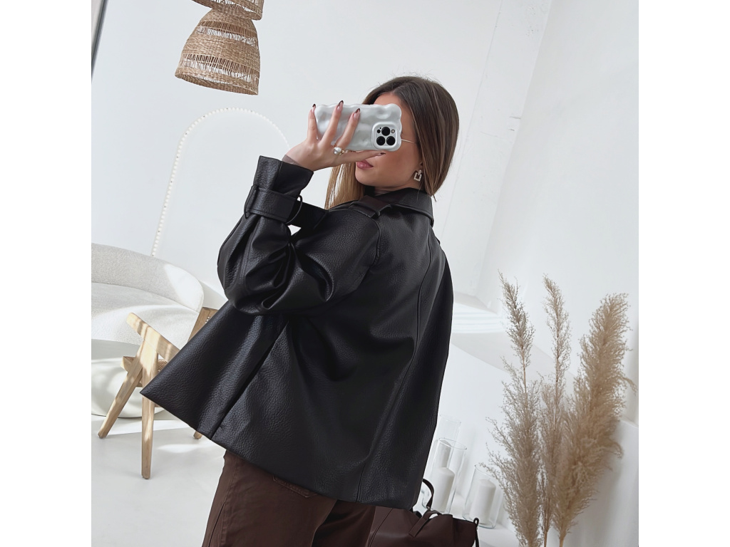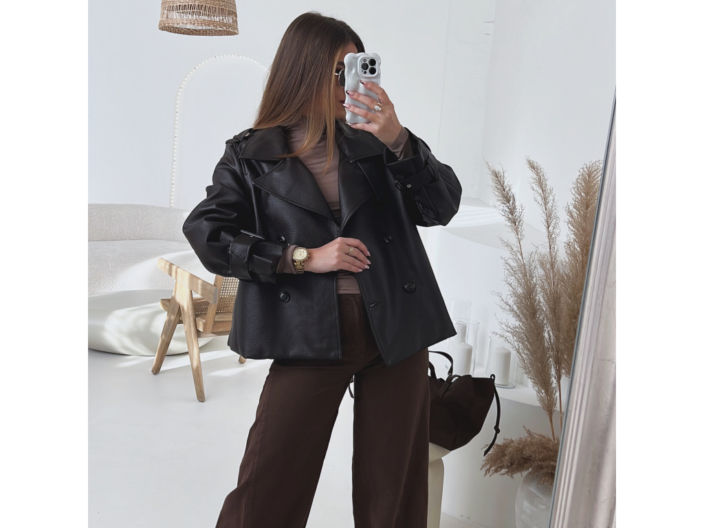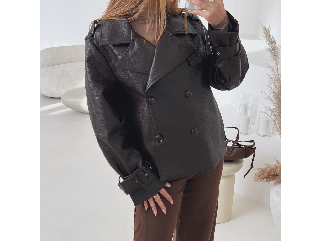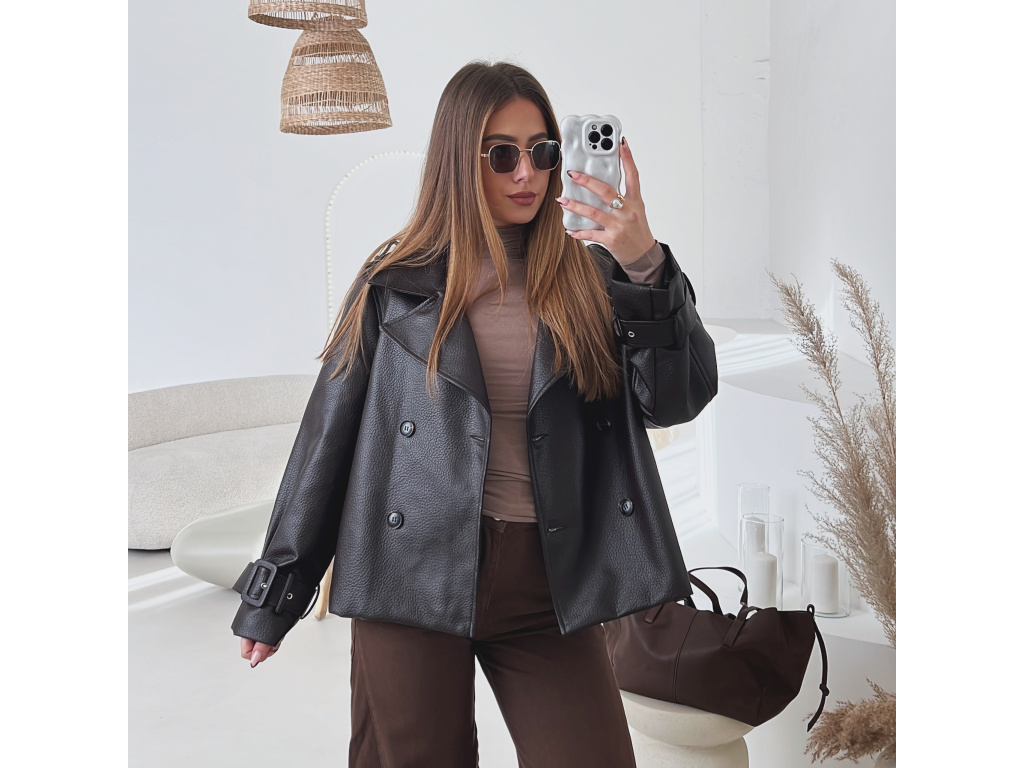 Stylová koženková bunda v tmavě hnědém odstínu s výrazným strukturovaným povrchem dodá každému outfitu elegantní i moderní nádech. Má dvouřadé zapínání na knoflíky, široké klopy a ozdobné pásky na rukávech. Pohodlný volnější střih se snadno kombinuje jak s džíny, tak s elegantními kalhotami.