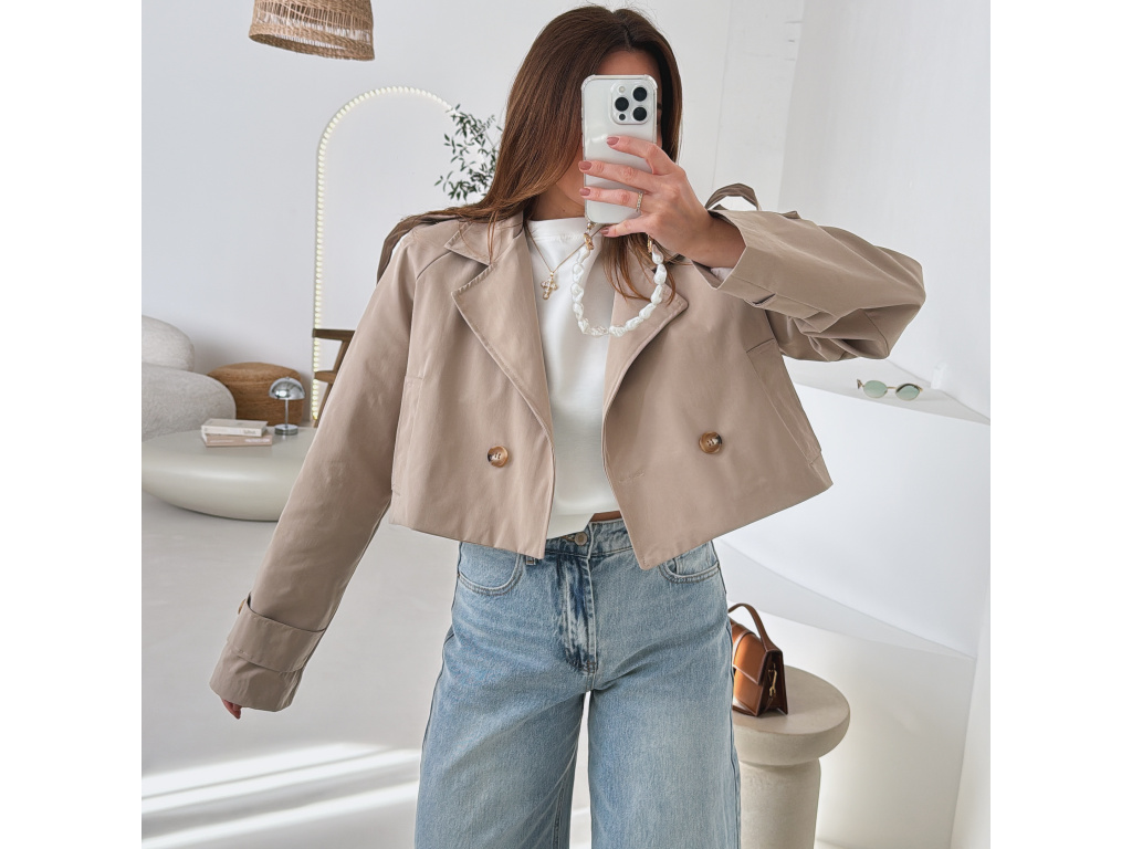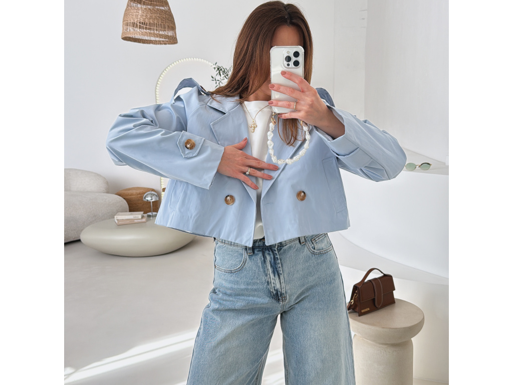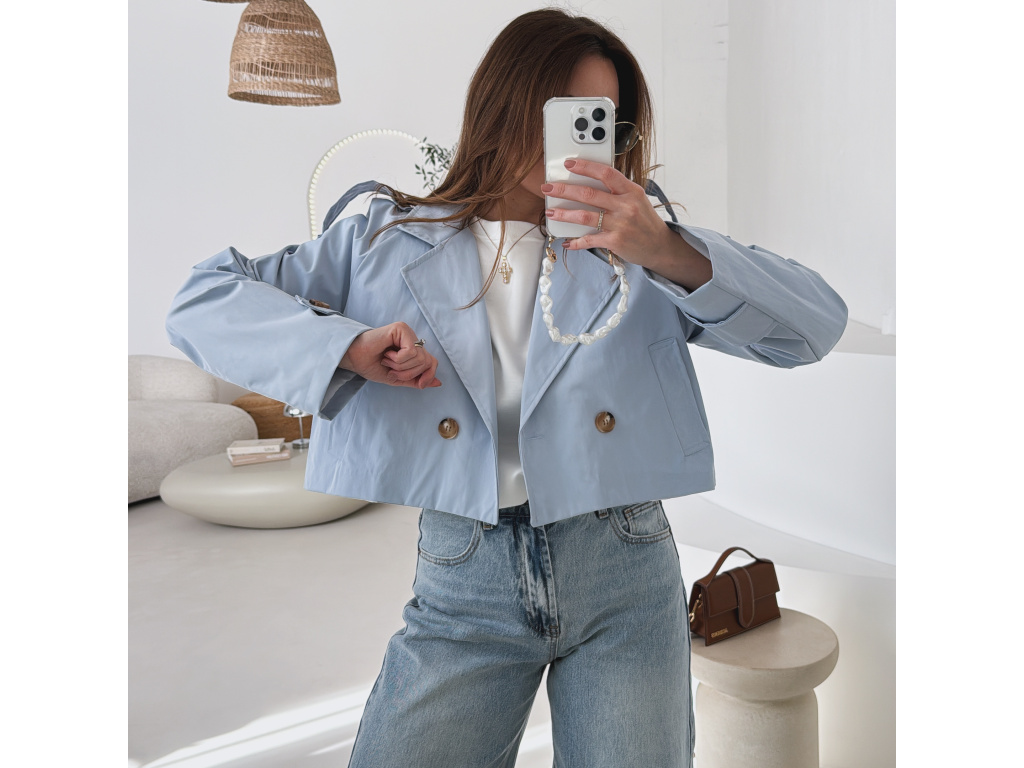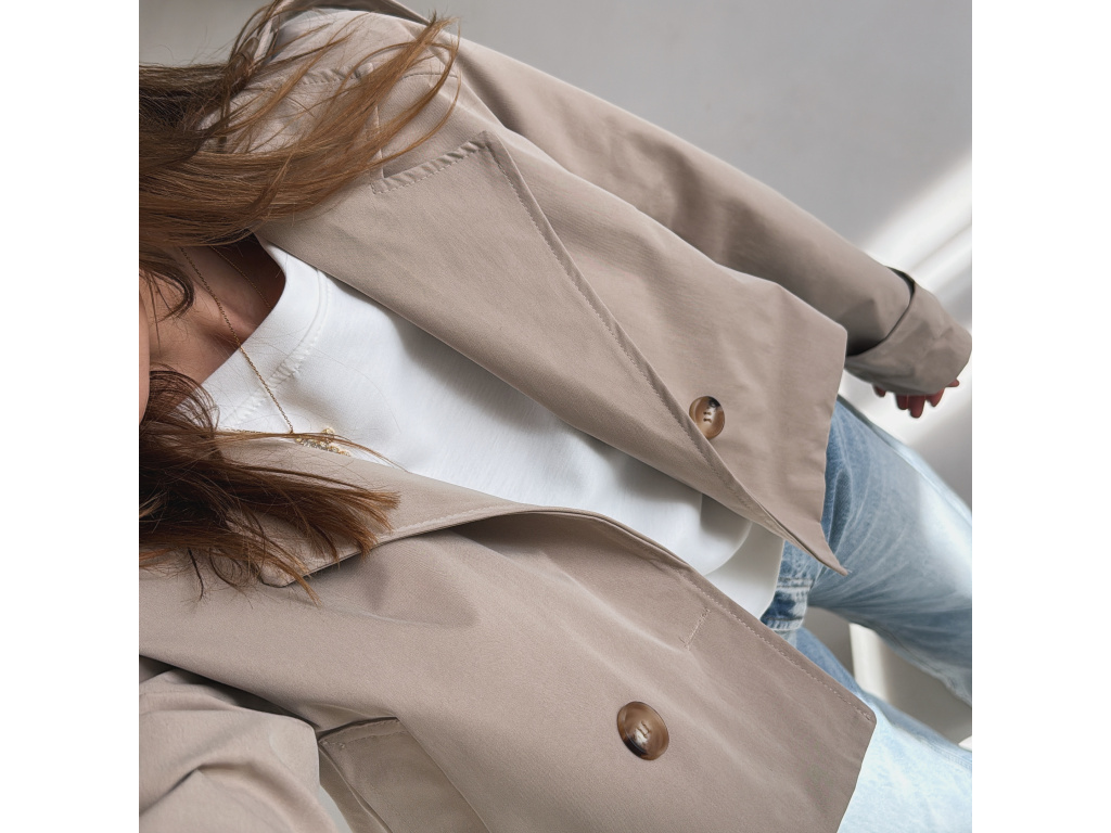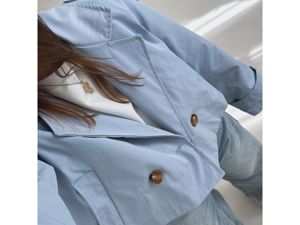 Krátký trenčkot v moderním střihu, který dodá outfitu svěží a nadčasový vzhled. Dvouvradové zapínání s výraznými knoflíky a klasický límec podtrhují elegantní siluetu, zatímco zkrácená délka působí mladistvě a stylově. Lehký materiál je ideální na přechodné období a snadno se kombinuje s džínami, šaty i sukní. Dostupný v jemné baby blue a nadčasové béžové barvě.
