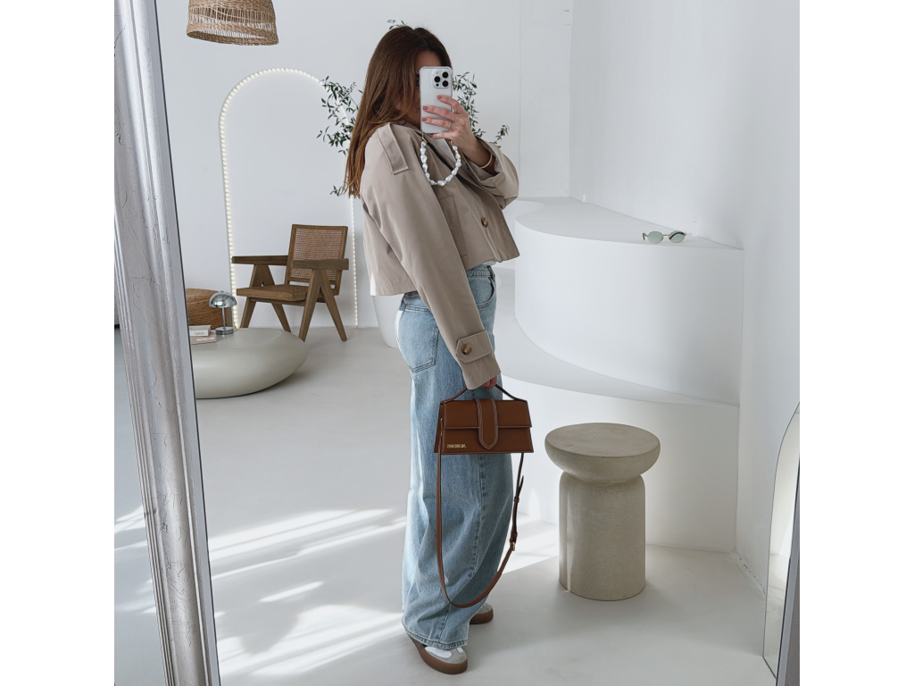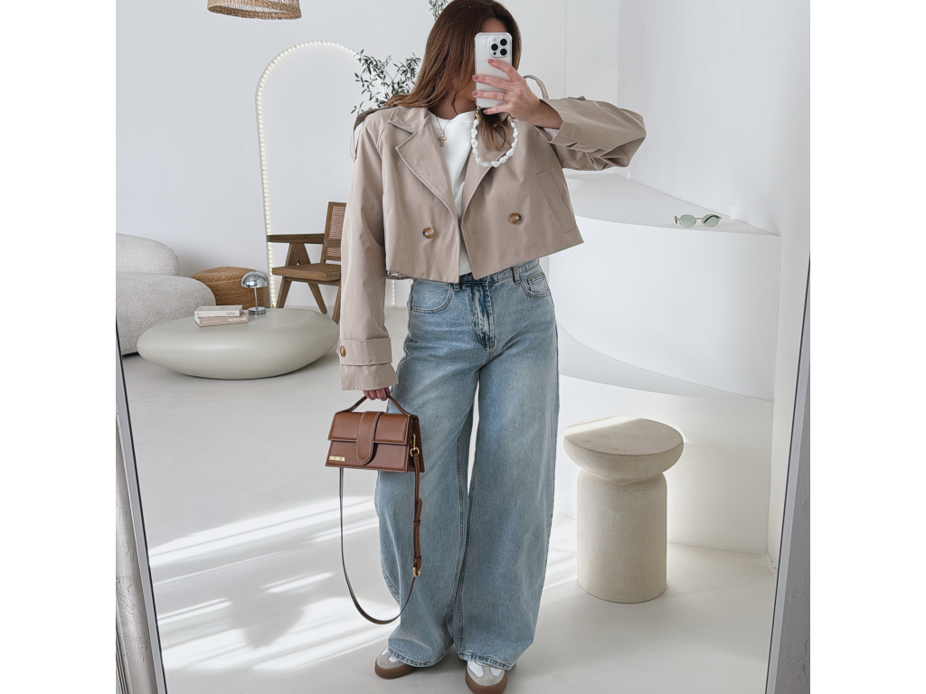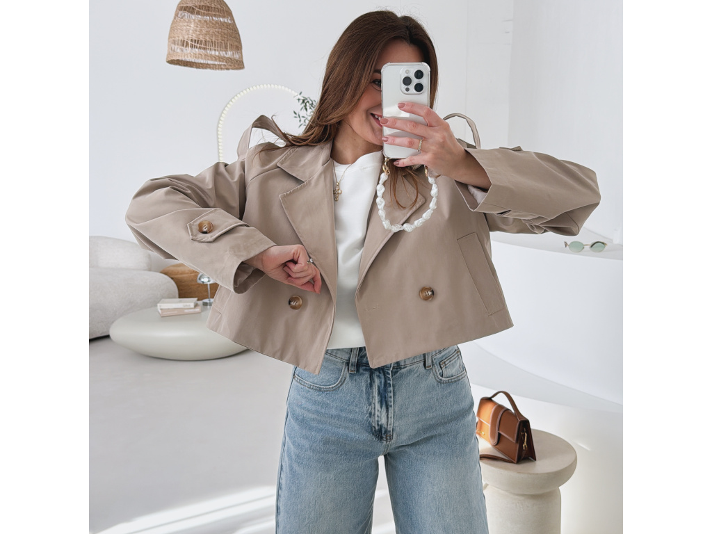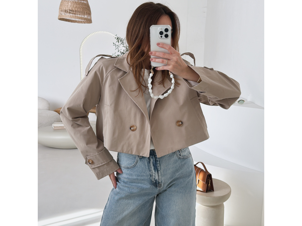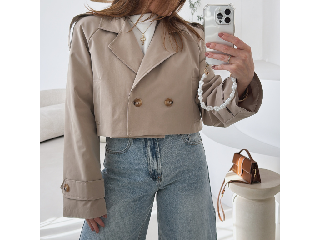 Krátký trenčkot v moderním střihu, který dodá outfitu svěží a nadčasový vzhled. Dvouvradové zapínání s výraznými knoflíky a klasický límec podtrhují elegantní siluetu, zatímco zkrácená délka působí mladistvě a stylově. Lehký materiál je ideální na přechodné období a snadno se kombinuje s džínami, šaty i sukní. Dostupný v jemné baby blue a nadčasové béžové barvě.