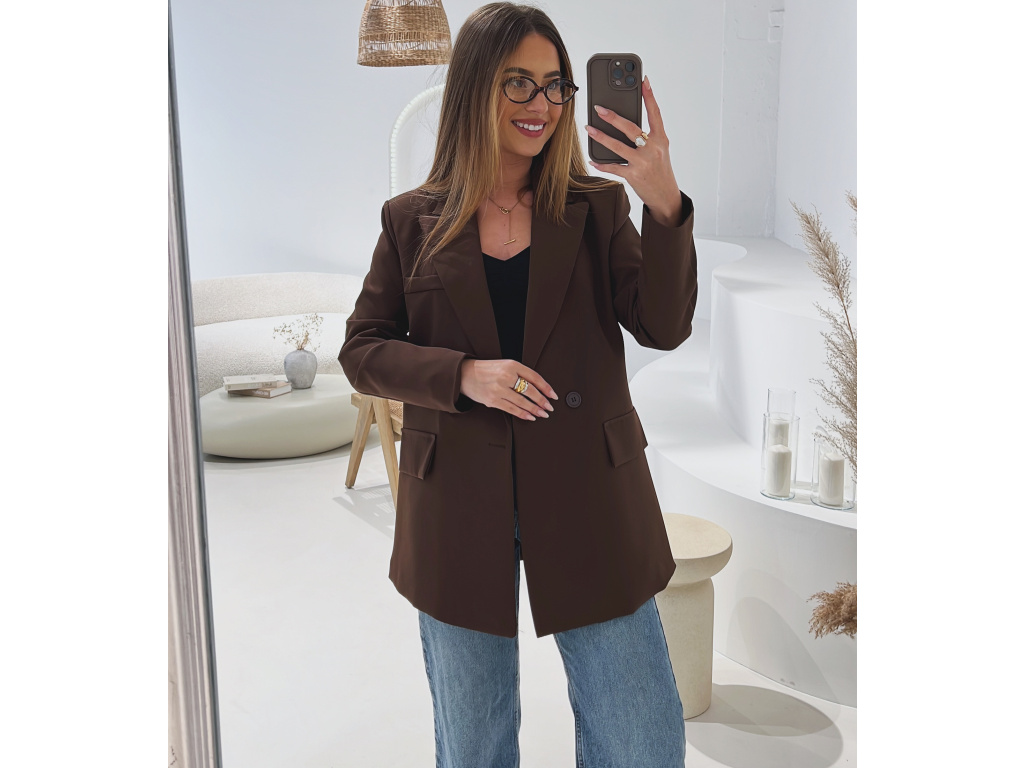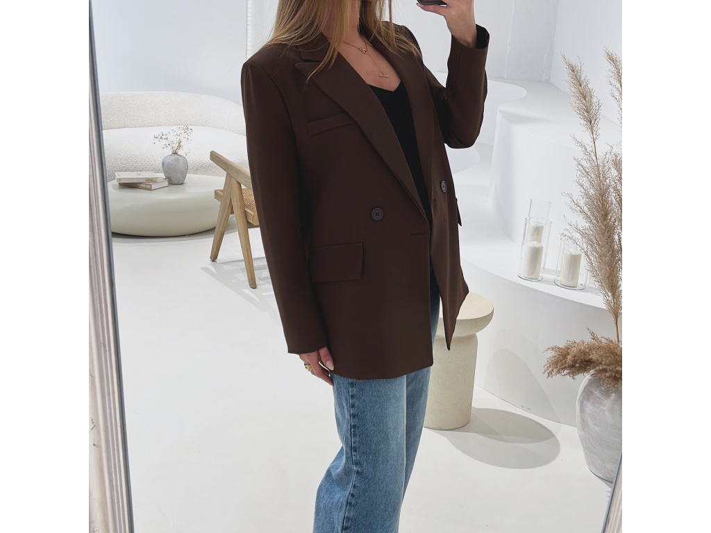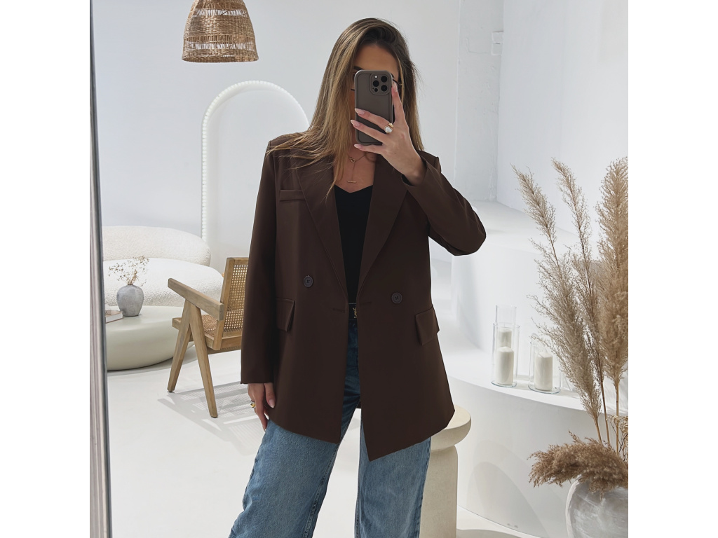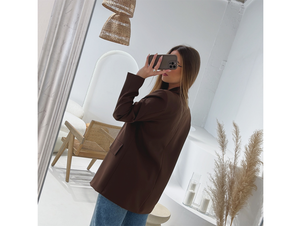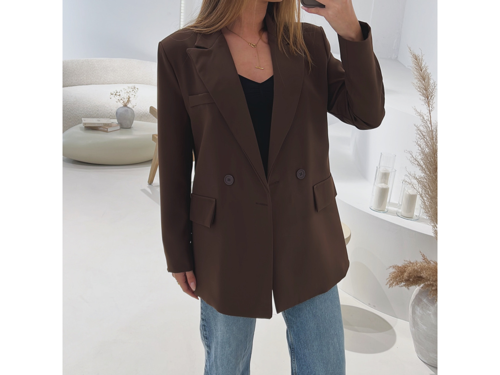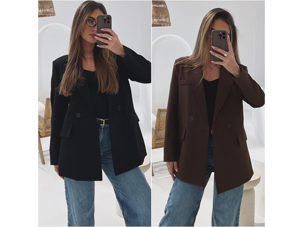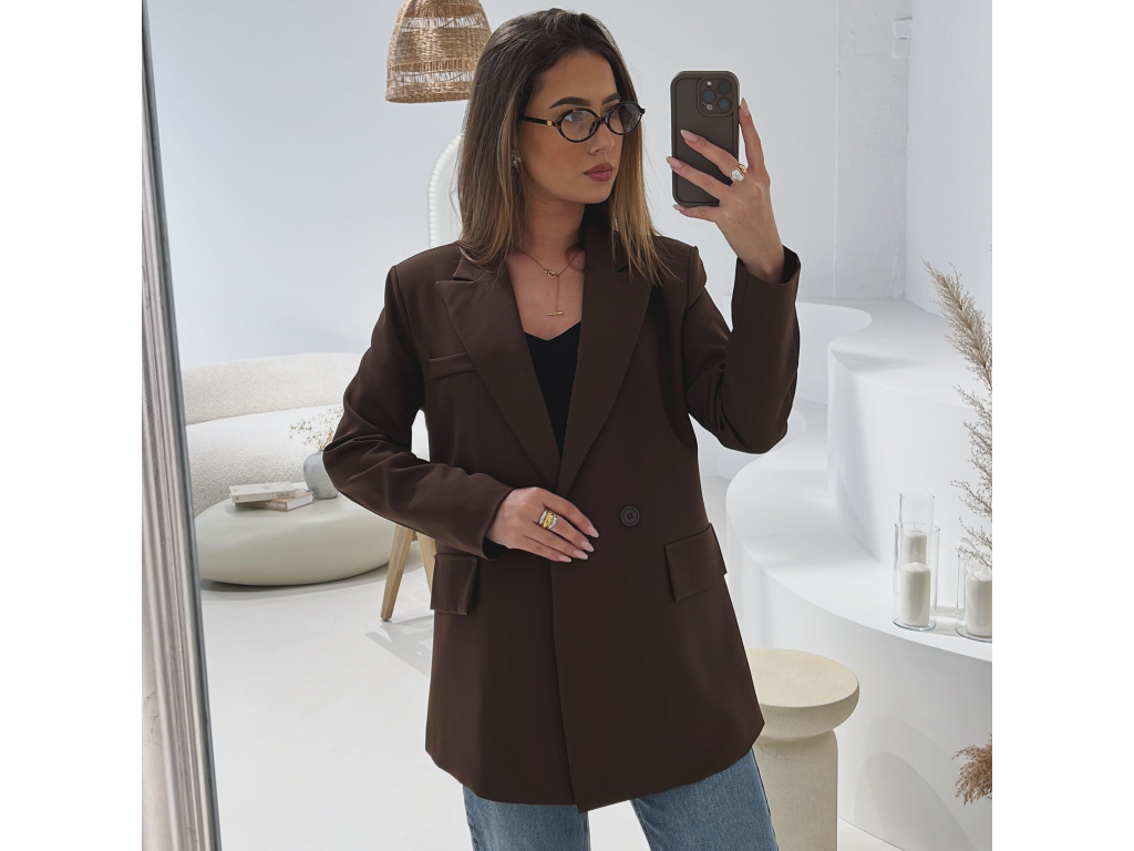 Stylové oversize sako v hnědé a černé barvě je dokonalým kouskem pro moderní, sebevědomý outfit. Má vystužená ramena, která vytvářejí krásnou siluetu, a příjemnou počívku, díky níž skvěle sedí a drží tvar. Dvouřadé zapínání na knoflíky dodává saku nadčasový vzhled, zatímco falešné kapsy podtrhují jeho čistou, elegantní linii. Perfektní volba ke kalhotám, džínám i šatům.