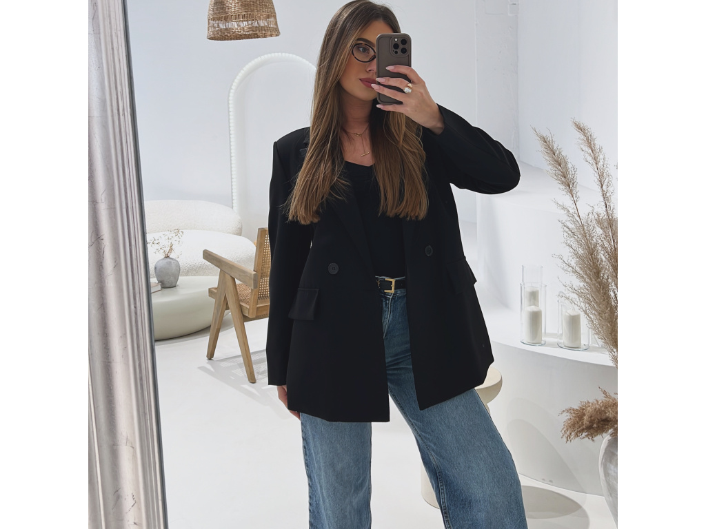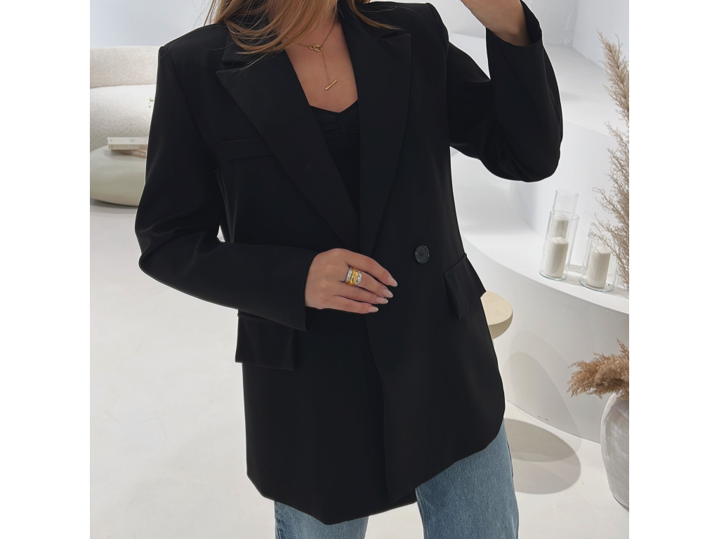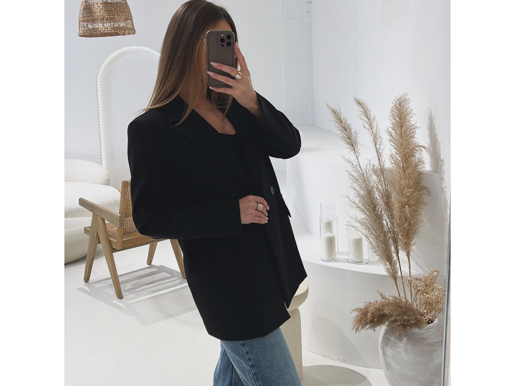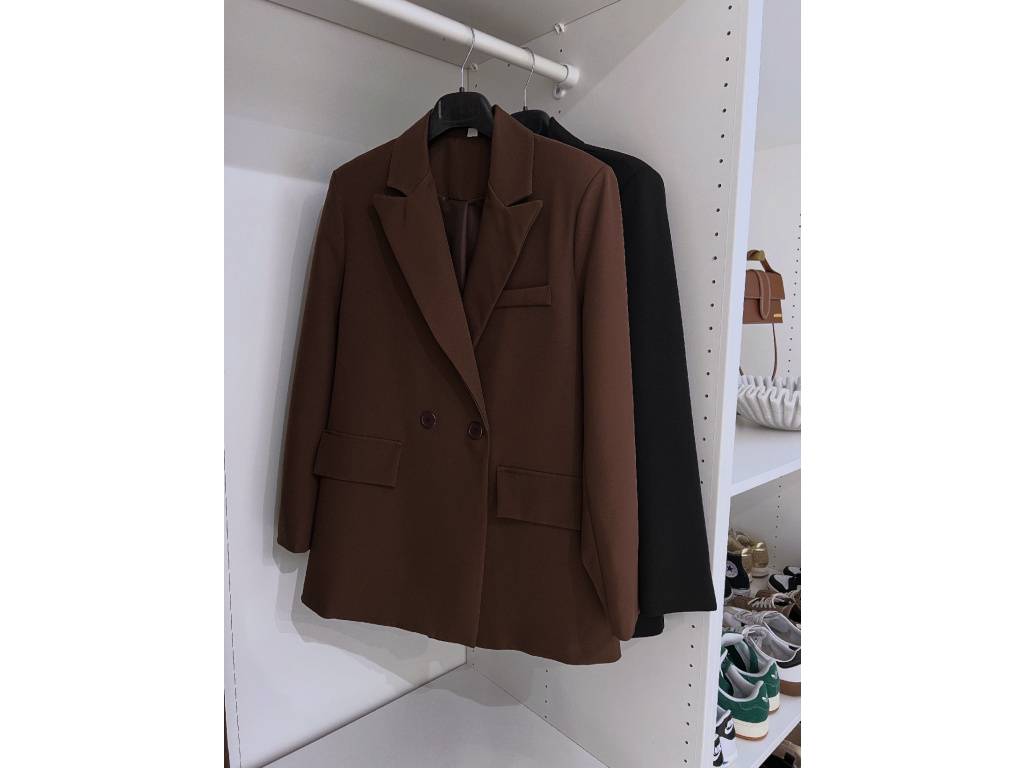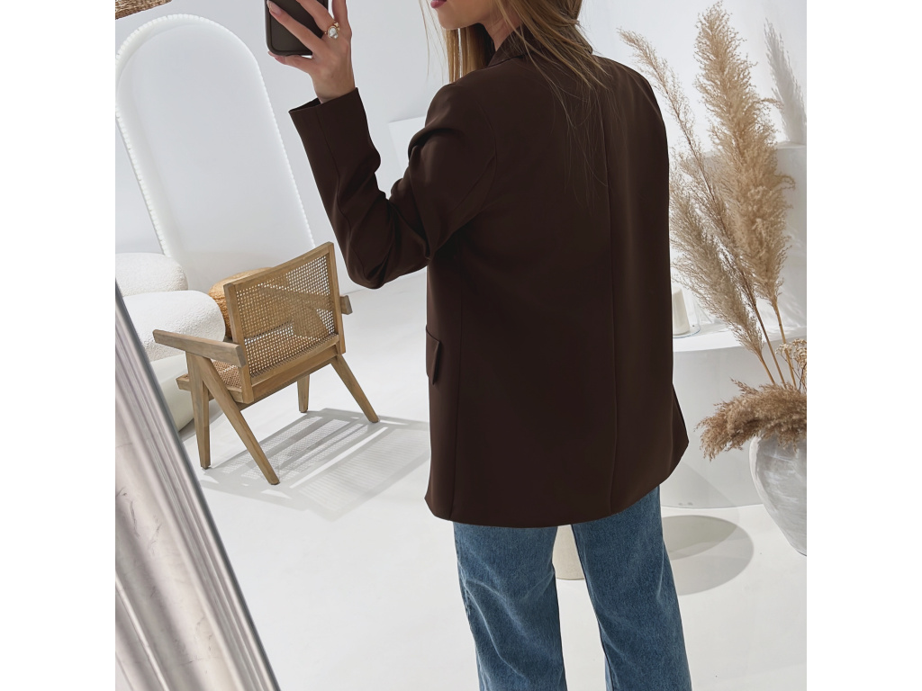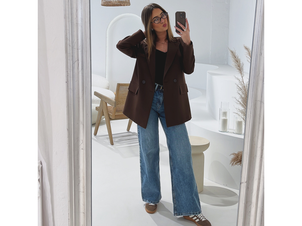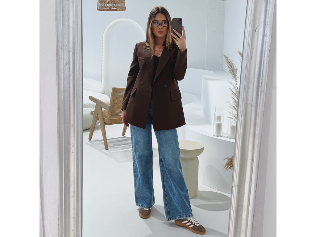 Stylové oversize sako v hnědé a černé barvě je dokonalým kouskem pro moderní, sebevědomý outfit. Má vystužená ramena, která vytvářejí krásnou siluetu, a příjemnou počívku, díky níž skvěle sedí a drží tvar. Dvouřadé zapínání na knoflíky dodává saku nadčasový vzhled, zatímco falešné kapsy podtrhují jeho čistou, elegantní linii. Perfektní volba ke kalhotám, džínám i šatům.