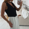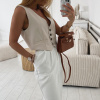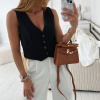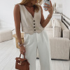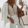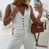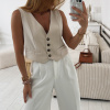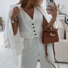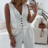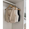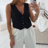 Elegantní, saková vestička se zapínáním na knoflíčky v bílé, černé a béžové barvě. Vesta je po celé délce vypodšívkovaná. Velikost je univerzální, sedí na S, M a menší L, na velikosti XS je vesta v oblasti prsou větší. Foceno je velikosti na XS a výšce 165 cm.