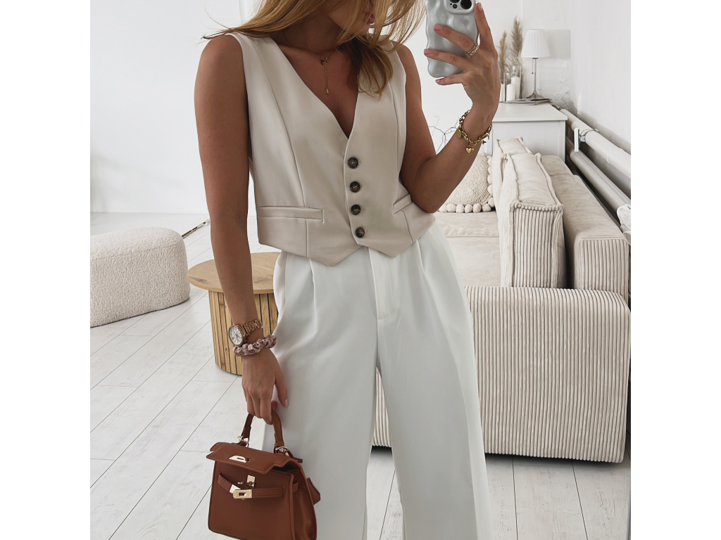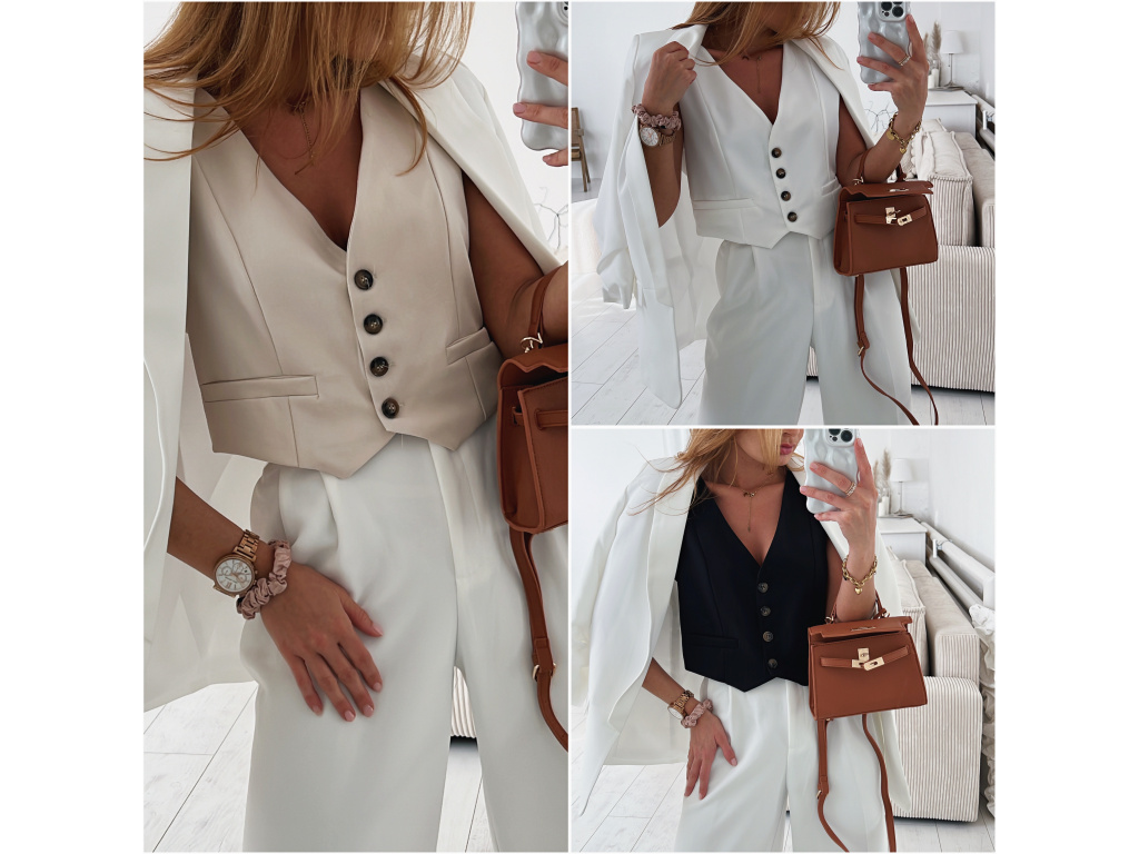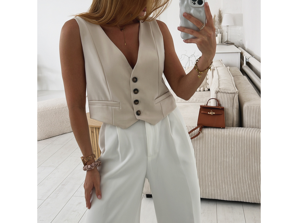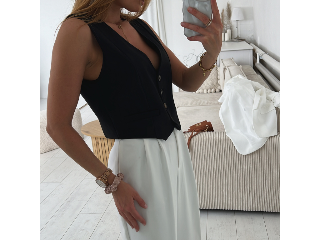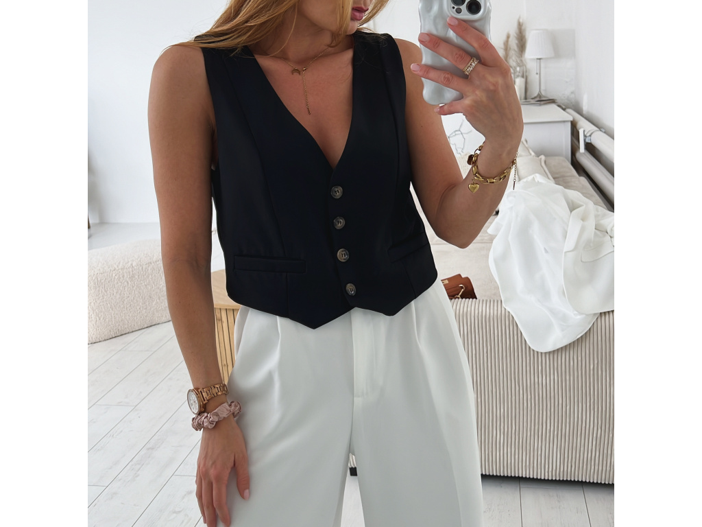 Elegantní, saková vestička se zapínáním na knoflíčky v bílé, černé a béžové barvě. Vesta je po celé délce vypodšívkovaná. Velikost je univerzální, sedí na S, M a menší L, na velikosti XS je vesta v oblasti prsou větší. Foceno je velikosti na XS a výšce 165 cm.