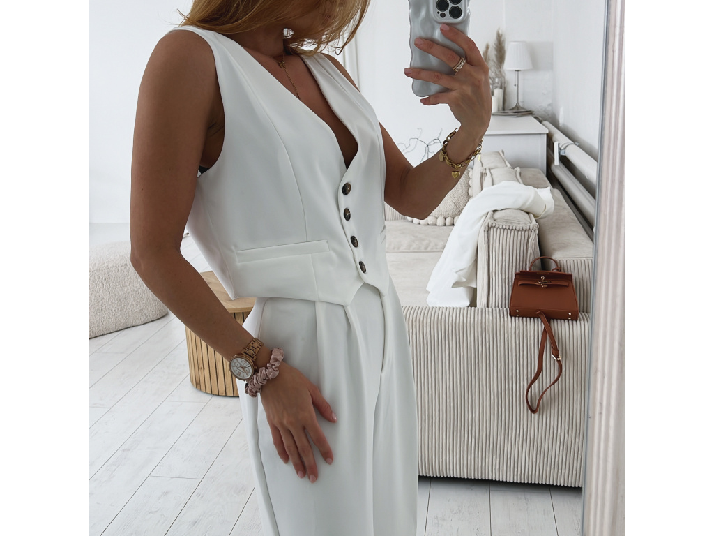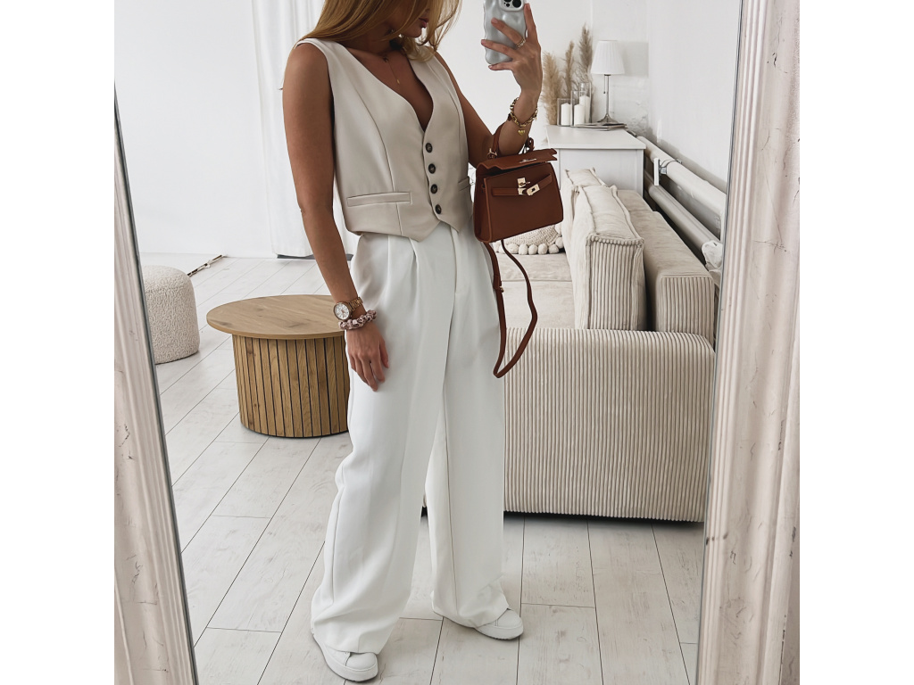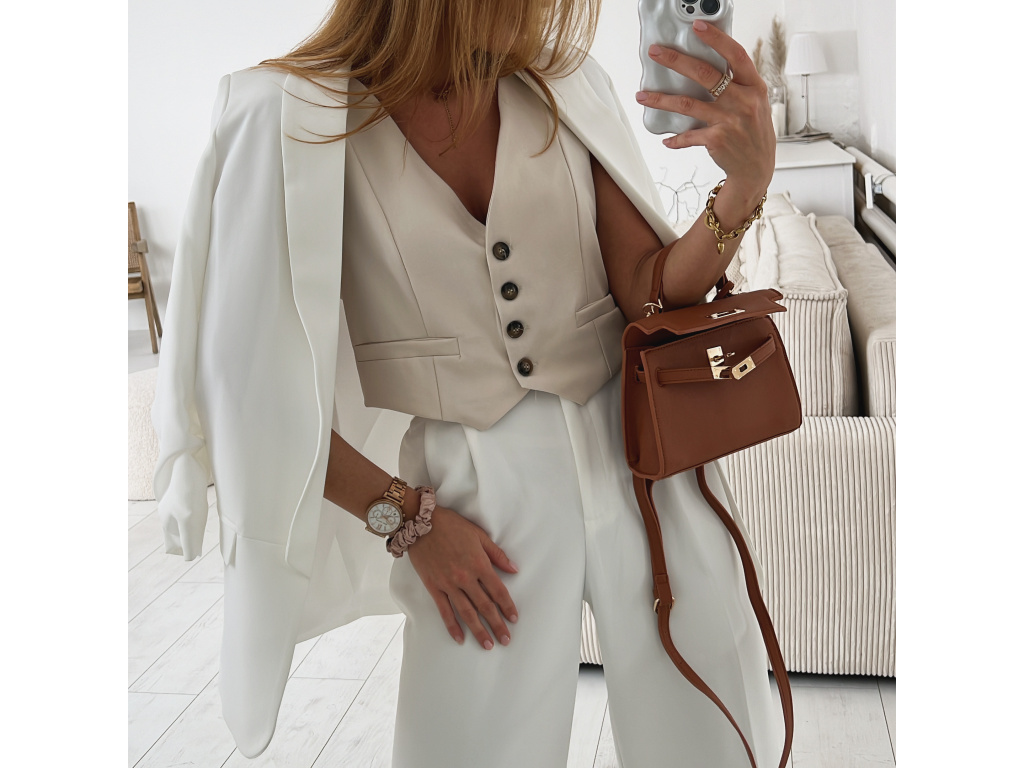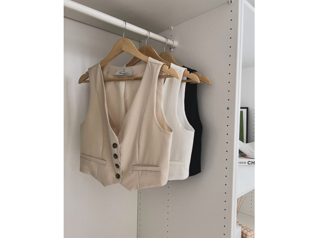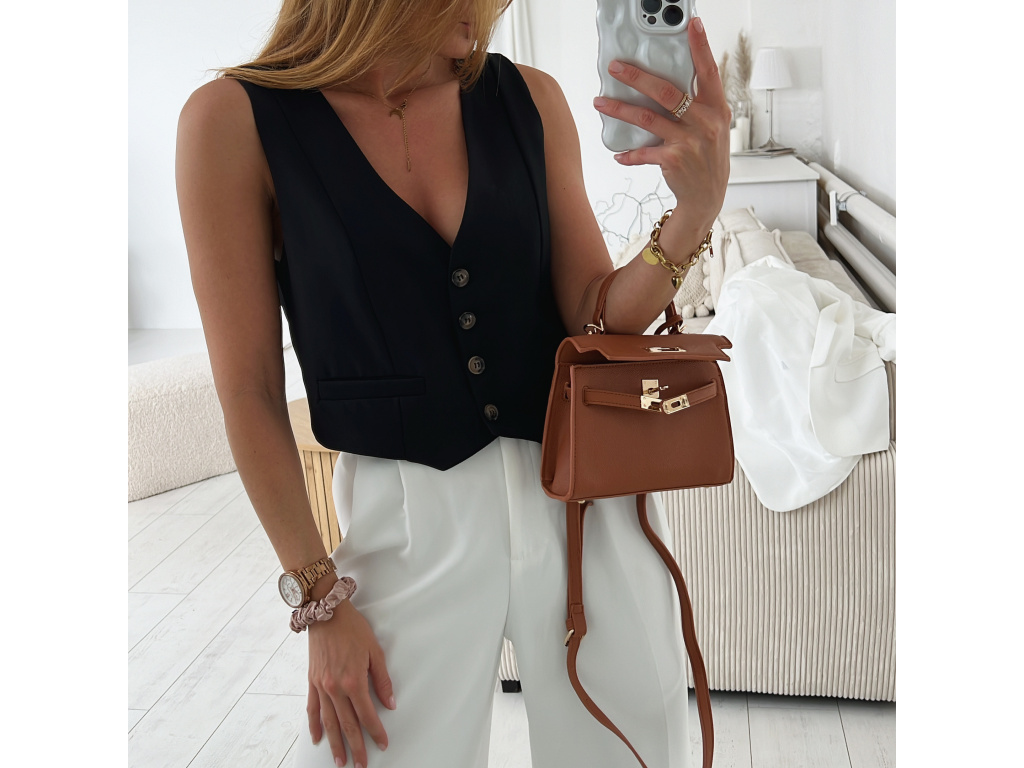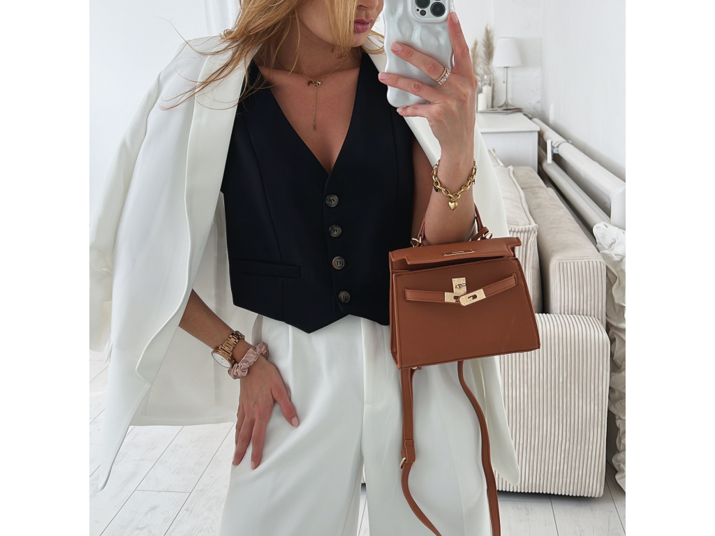 Elegantní, saková vestička se zapínáním na knoflíčky v bílé, černé a béžové barvě. Vesta je po celé délce vypodšívkovaná. Velikost je univerzální, sedí na S, M a menší L, na velikosti XS je vesta v oblasti prsou větší. Foceno je velikosti na XS a výšce 165 cm.
