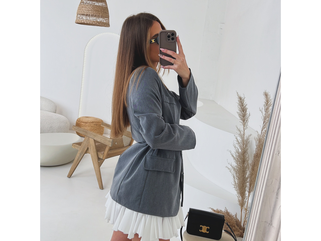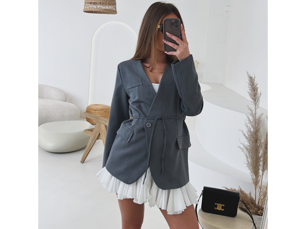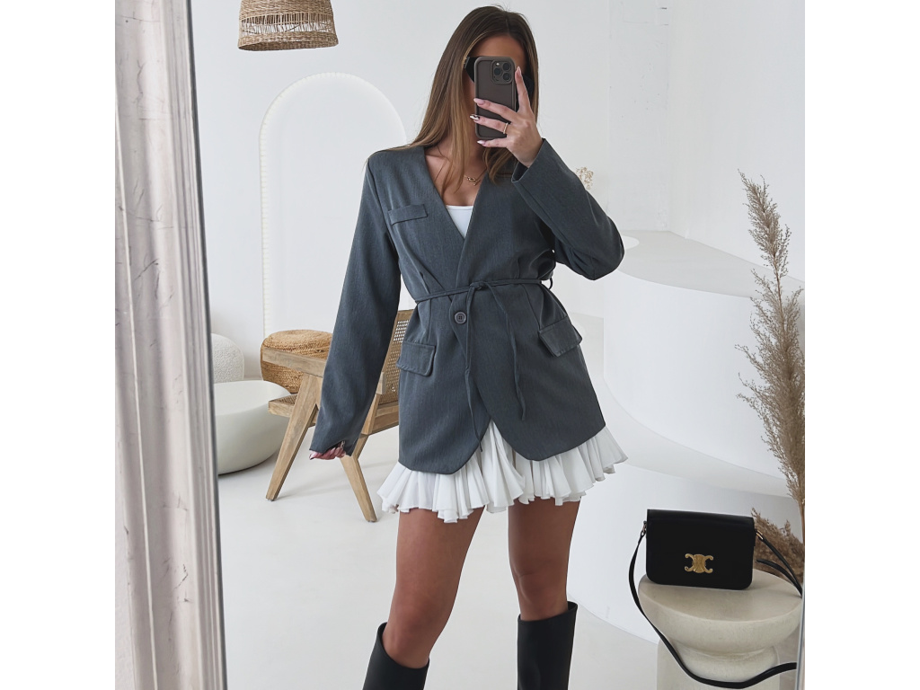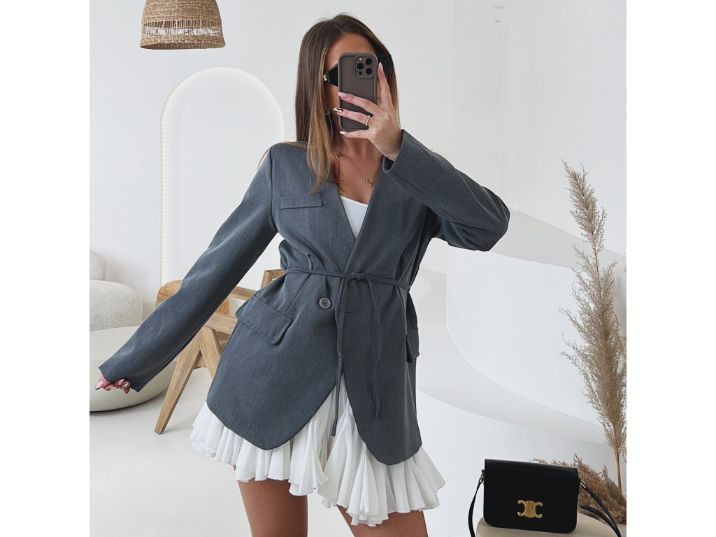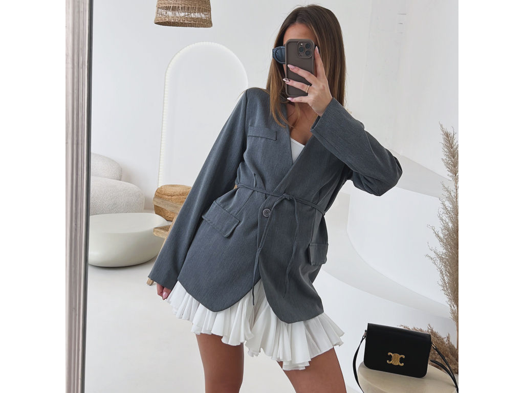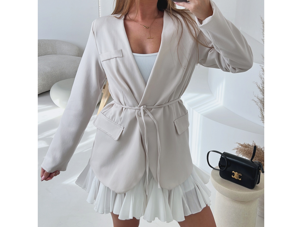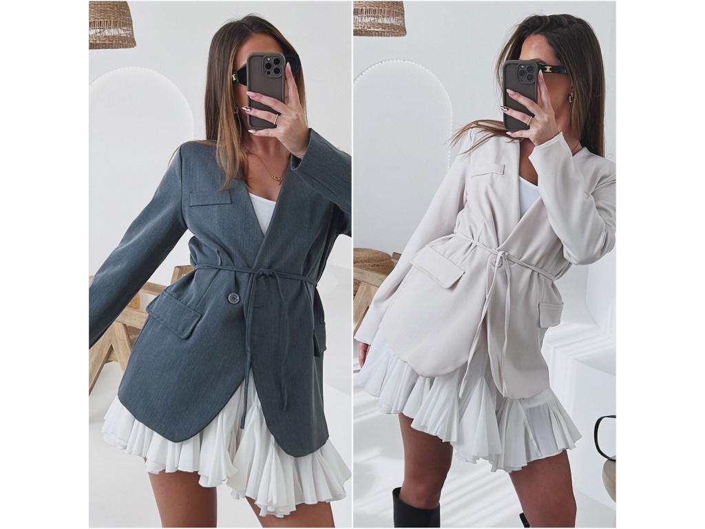 Elegantní sako s podšívkou, zapínáním na knoflík a tenkým páskem, který krásně zvýrazní pas. Má klasický střih s falešnými kapsami, díky čemuž působí stylově. Perfektní volba pro elegantní i ležérní outfity – snadno ho zkombinujete se sukní, kalhotami i šaty. Dostupné ve dvou nadčasových barvách – šedé a béžové. Velikost je univerzální, sedí na XS, S, M. Sako má vyztužená ramena.
