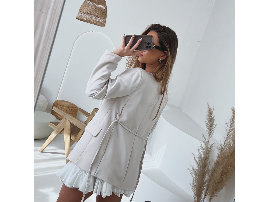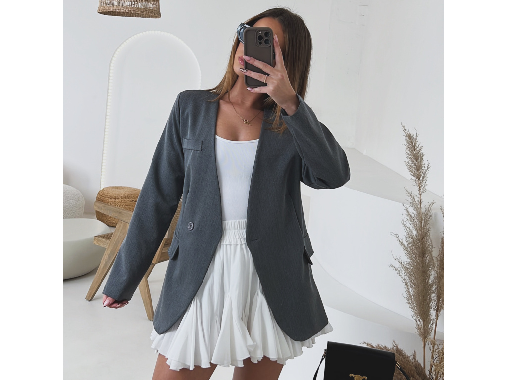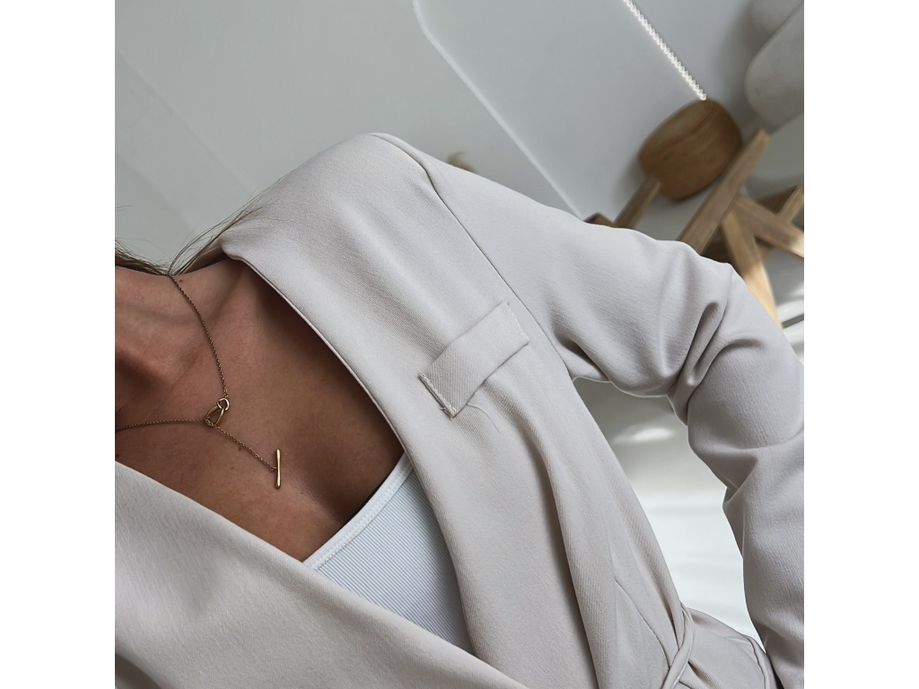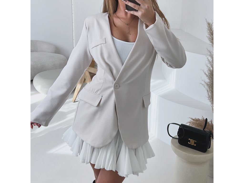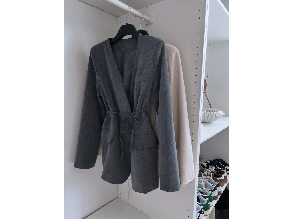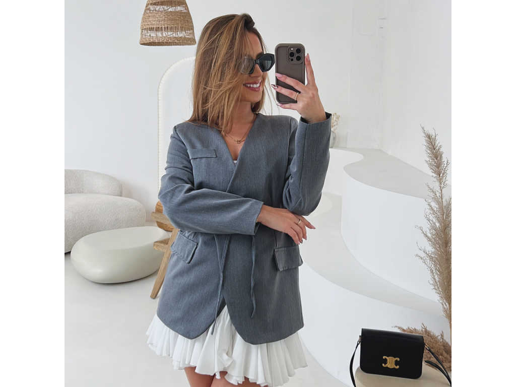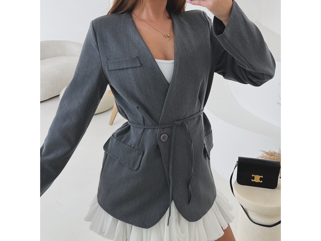 Elegantní sako s podšívkou, zapínáním na knoflík a tenkým páskem, který krásně zvýrazní pas. Má klasický střih s falešnými kapsami, díky čemuž působí stylově. Perfektní volba pro elegantní i ležérní outfity – snadno ho zkombinujete se sukní, kalhotami i šaty. Dostupné ve dvou nadčasových barvách – šedé a béžové. Velikost je univerzální, sedí na XS, S, M. Sako má vyztužená ramena.