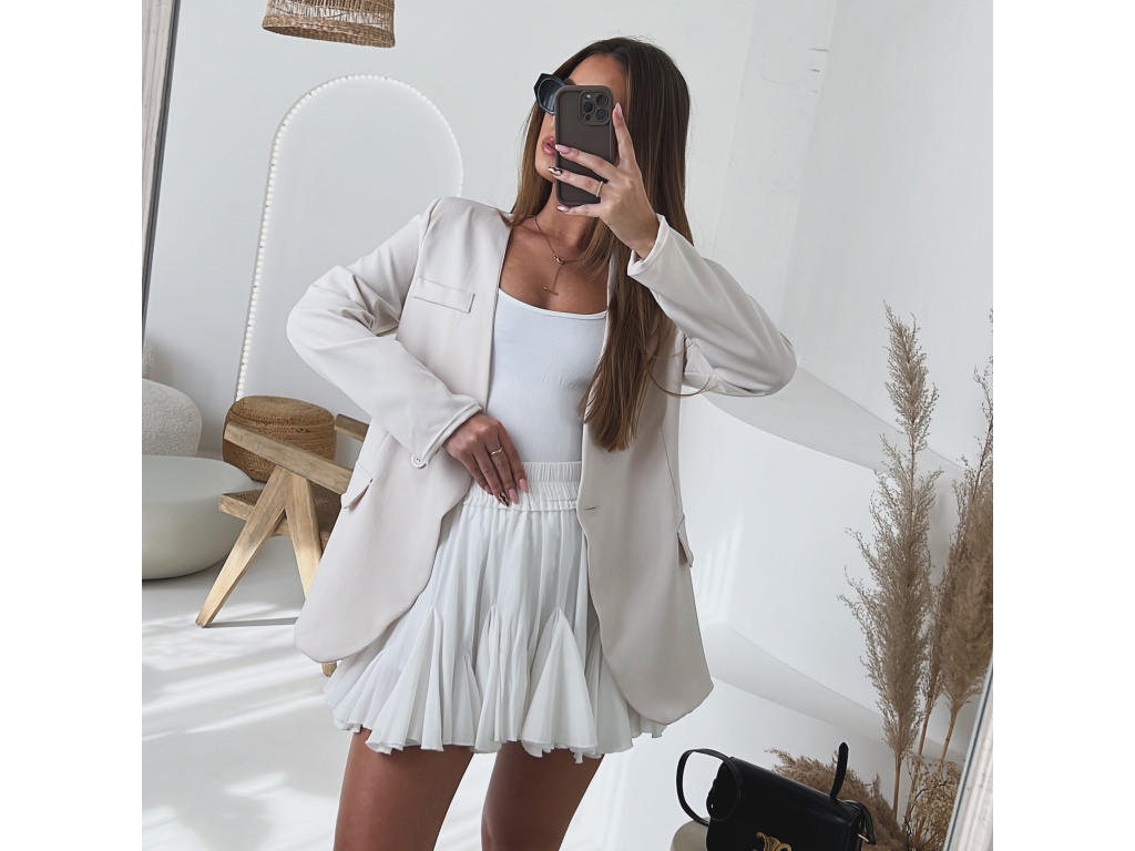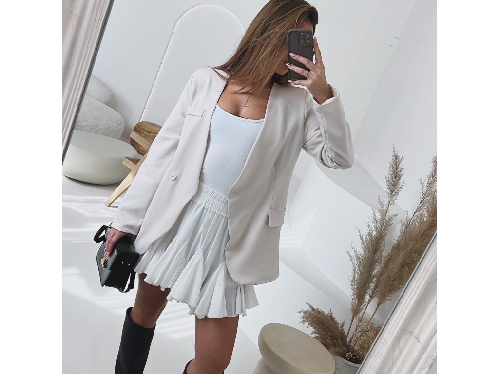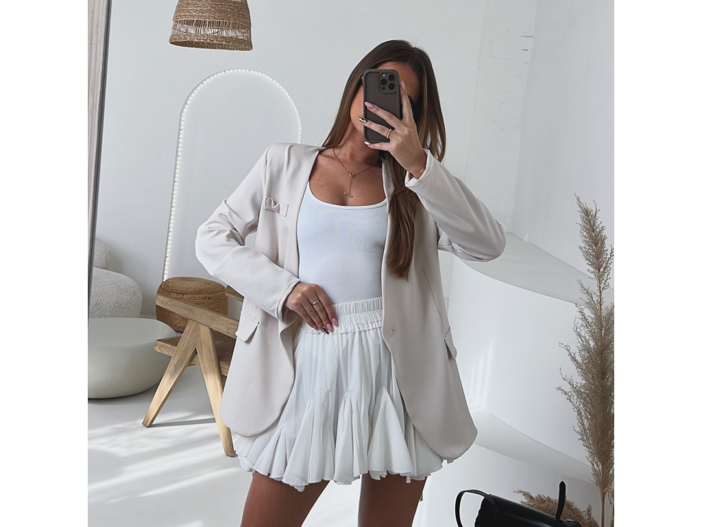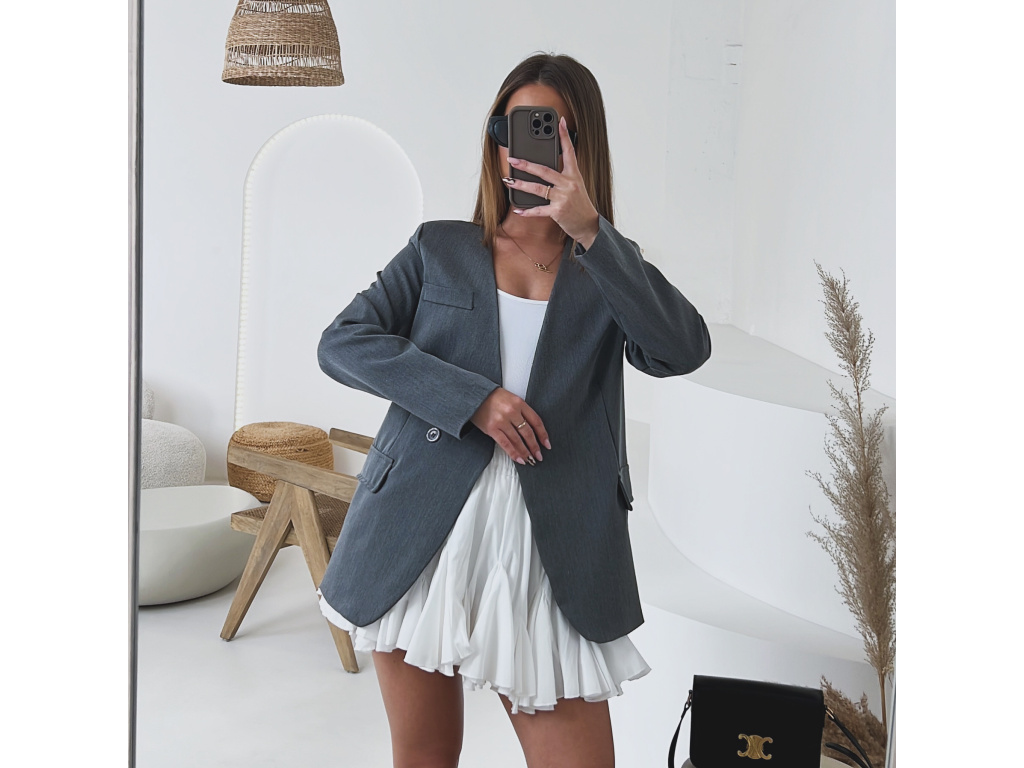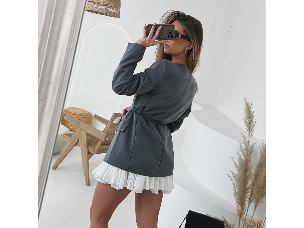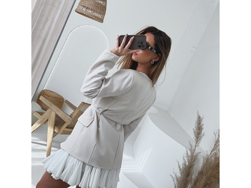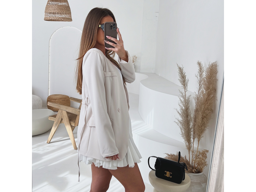 Elegantní sako s podšívkou, zapínáním na knoflík a tenkým páskem, který krásně zvýrazní pas. Má klasický střih s falešnými kapsami, díky čemuž působí stylově. Perfektní volba pro elegantní i ležérní outfity – snadno ho zkombinujete se sukní, kalhotami i šaty. Dostupné ve dvou nadčasových barvách – šedé a béžové. Velikost je univerzální, sedí na XS, S, M. Sako má vyztužená ramena.