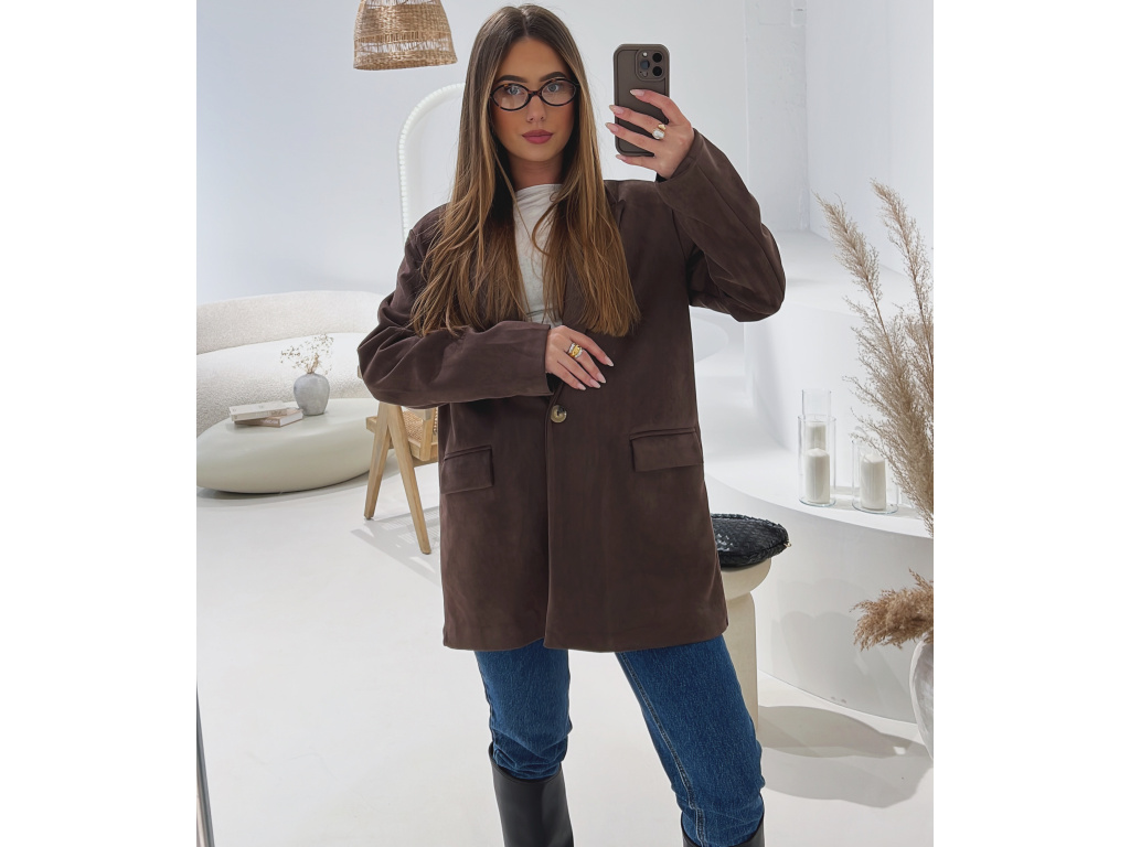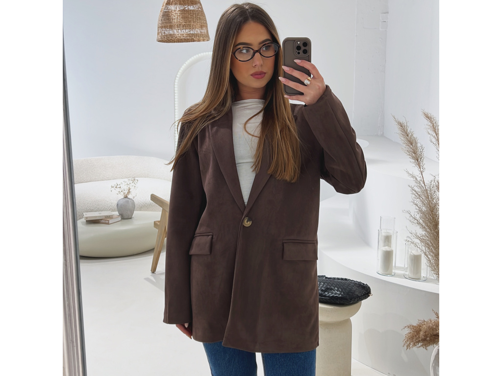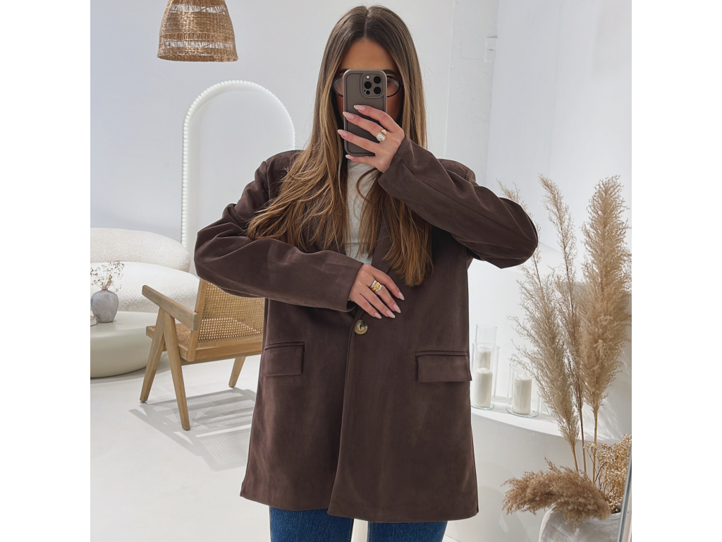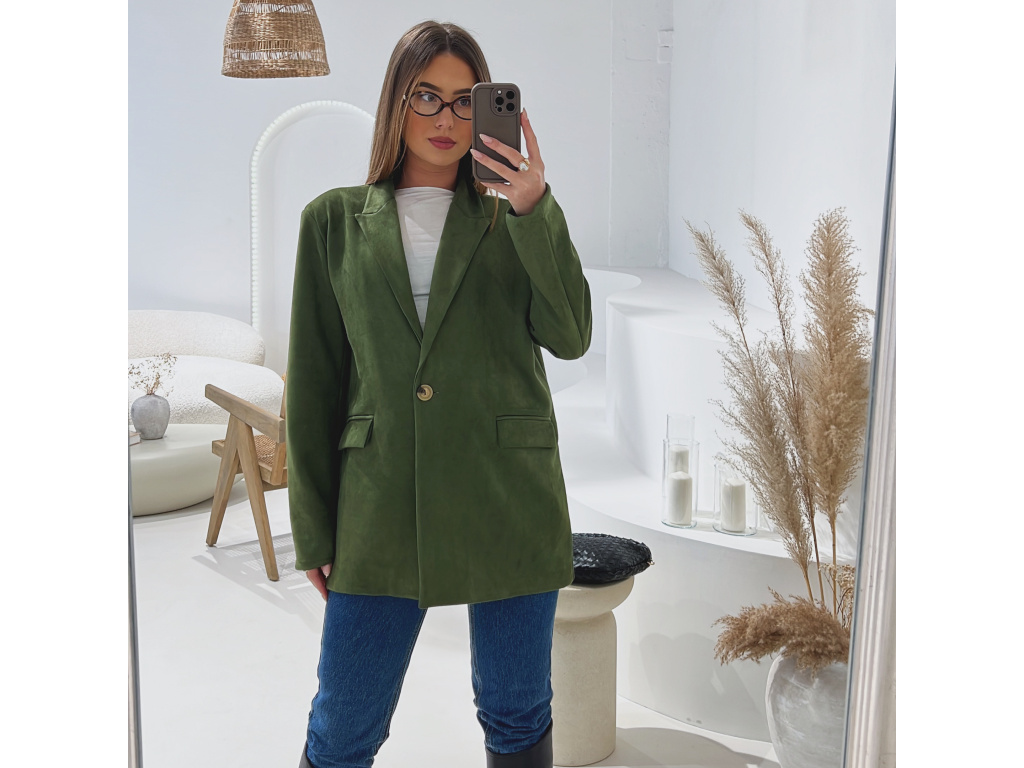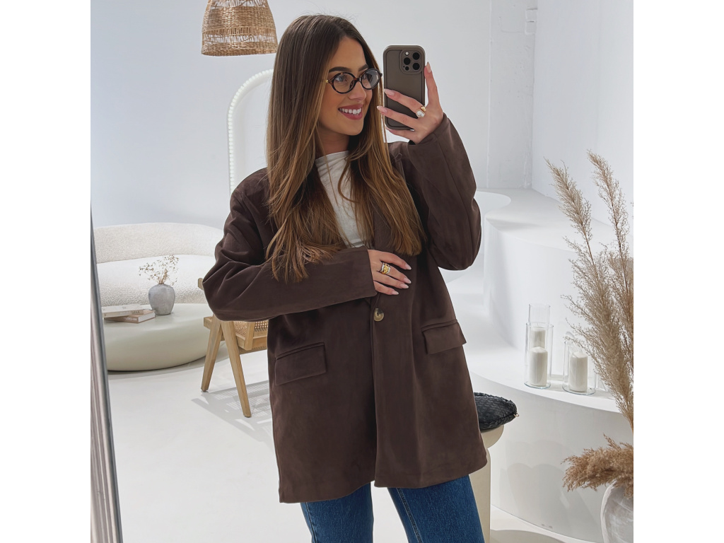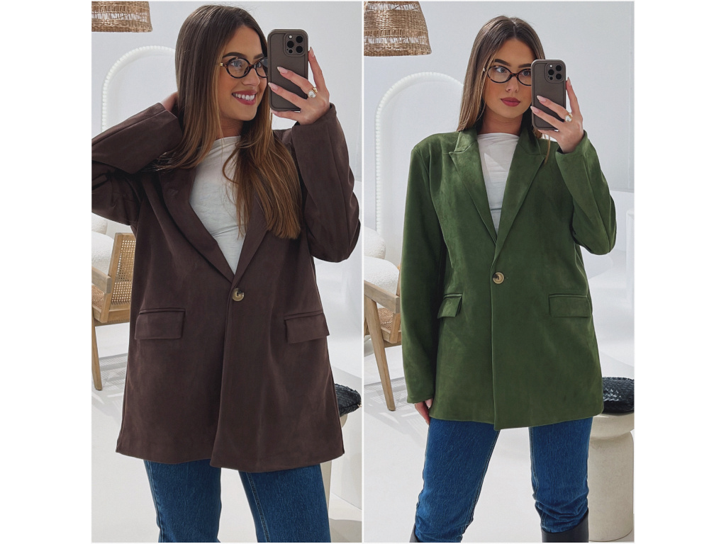 Elegantní semišové sako s jemně strukturovaným povrchem, které dodá outfitu šmrnc i nadčasovost. Má zapínání na knoflík, praktické kapsy, ramenní výztuže pro perfektní siluetu a kvalitní podšívku. Dostupné v krásné čokoládové a zelené barvě ve velikostech S, M a L.