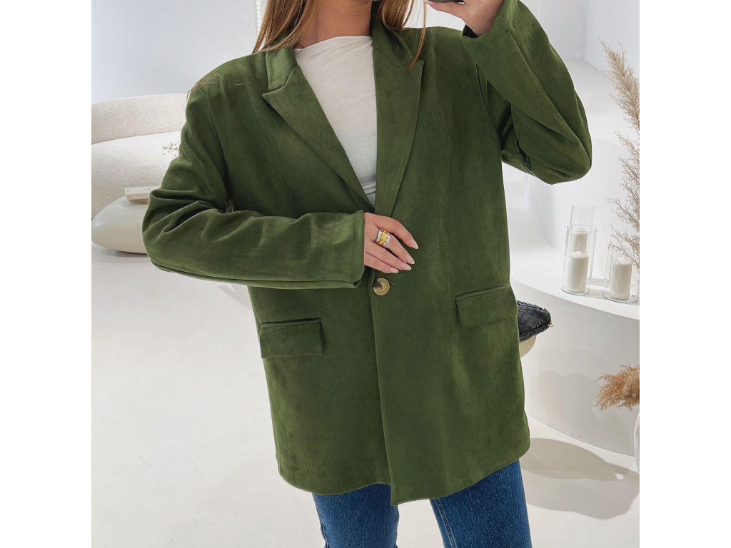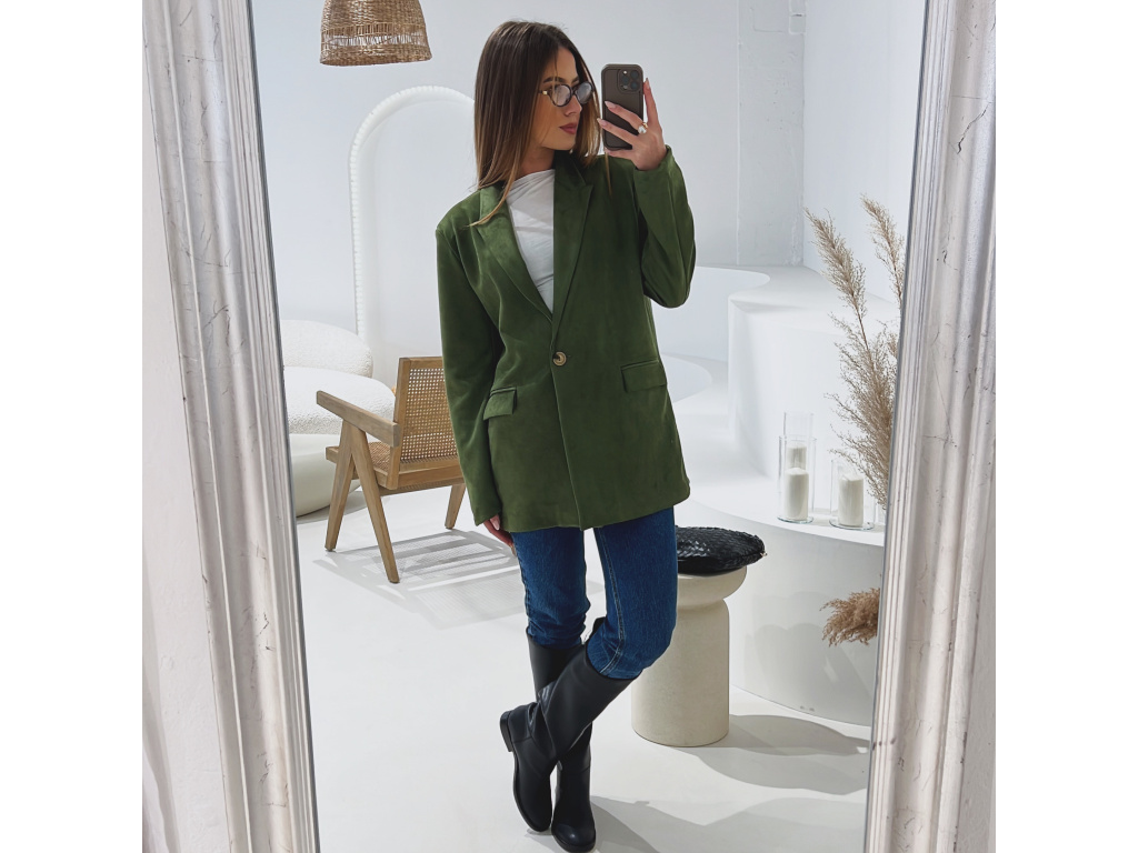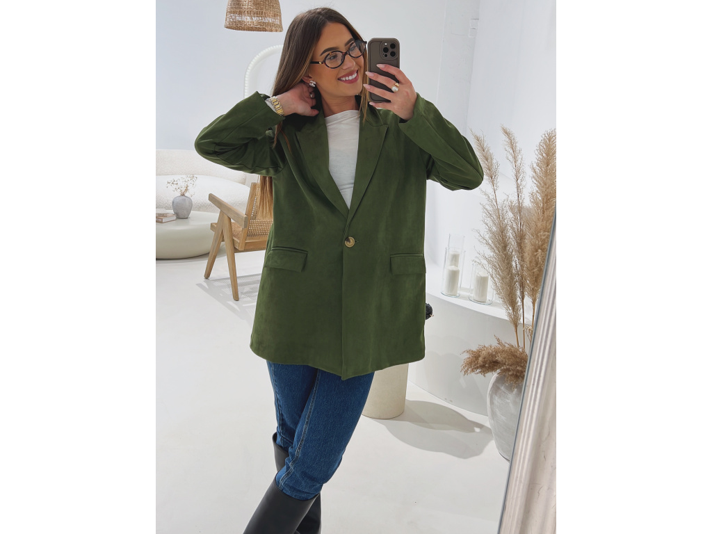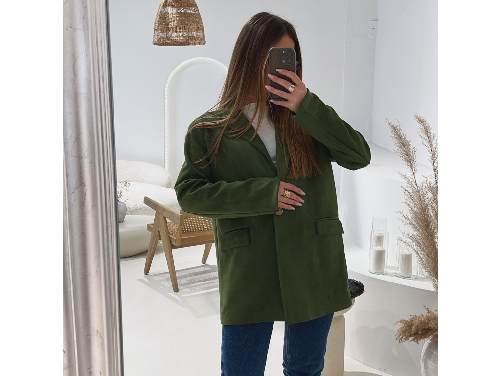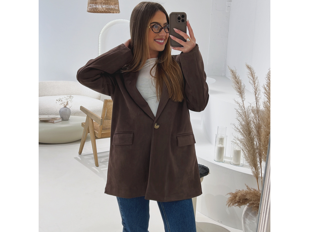 Elegantní semišové sako s jemně strukturovaným povrchem, které dodá outfitu šmrnc i nadčasovost. Má zapínání na knoflík, praktické kapsy, ramenní výztuže pro perfektní siluetu a kvalitní podšívku. Dostupné v krásné čokoládové a zelené barvě ve velikostech S, M a L.