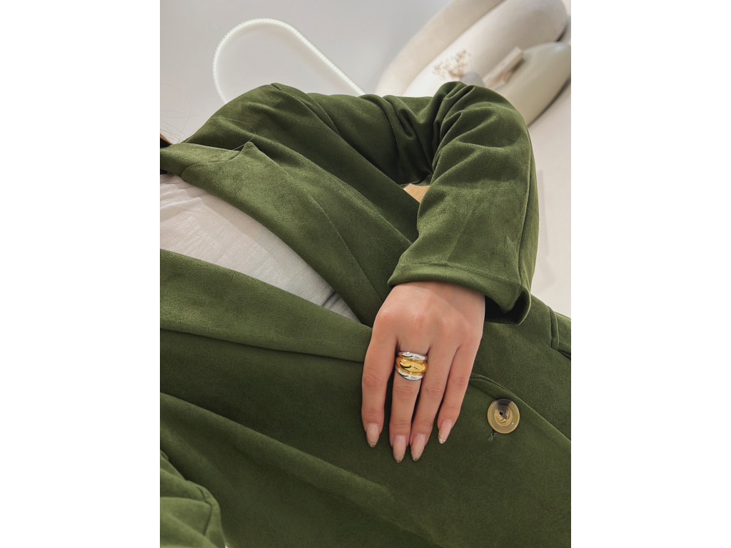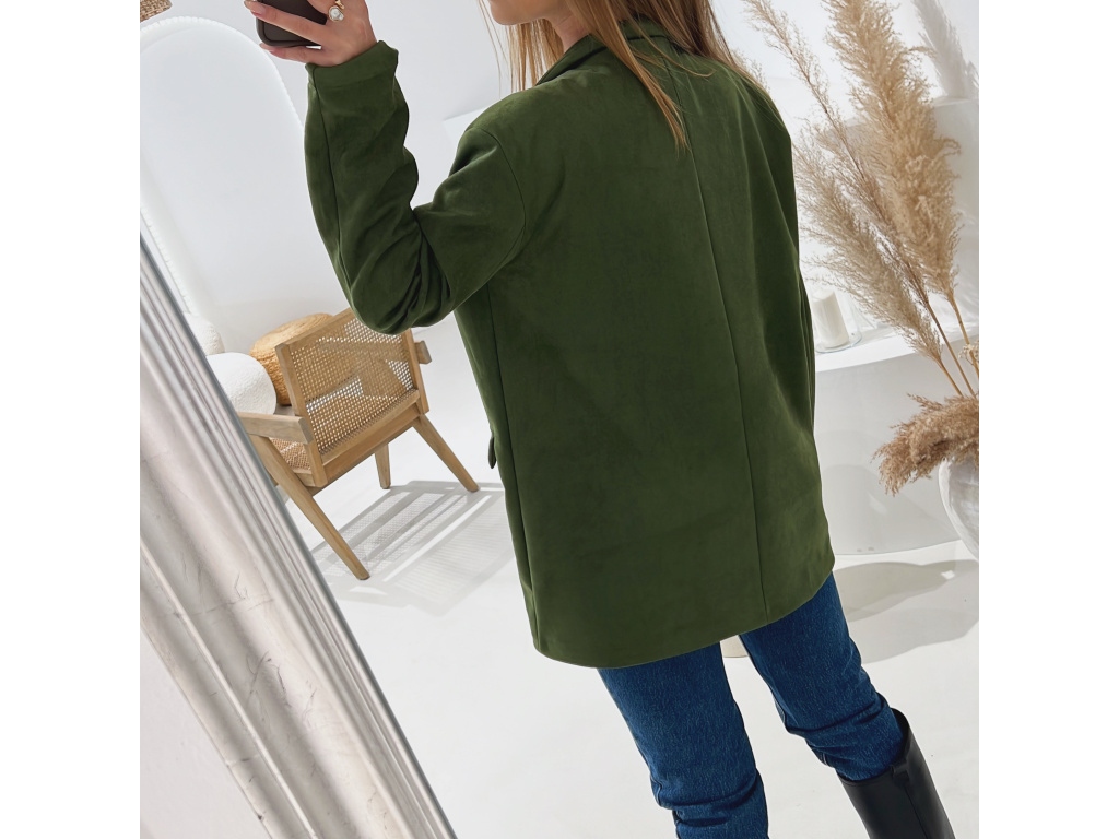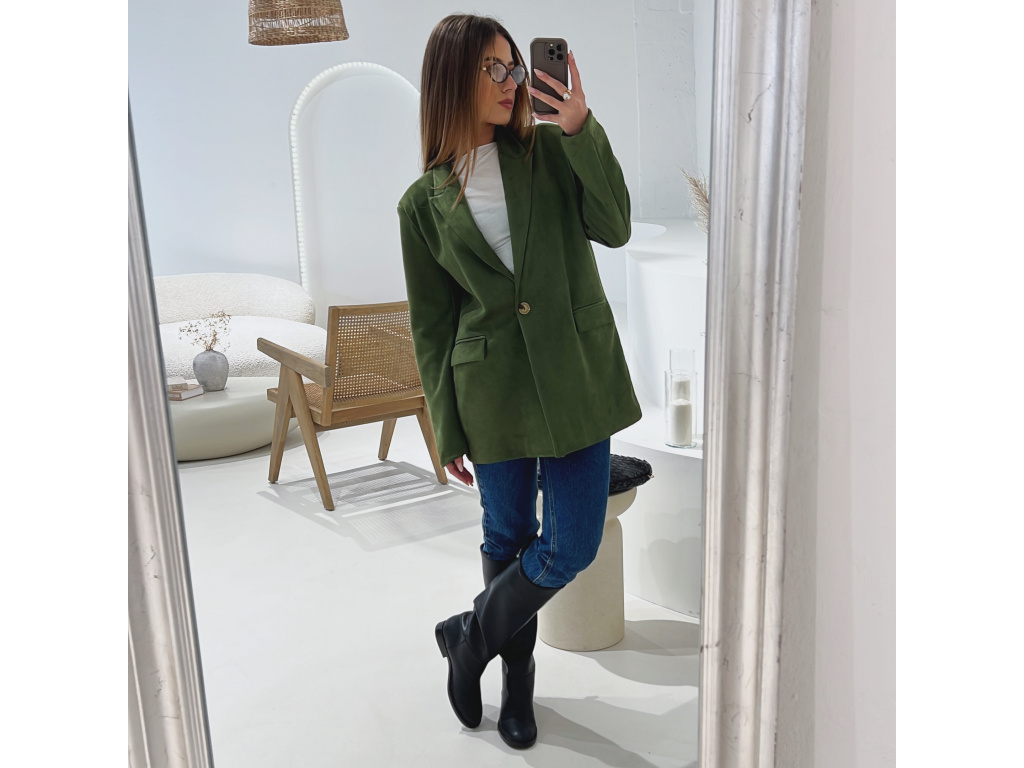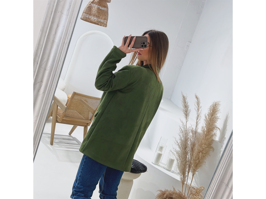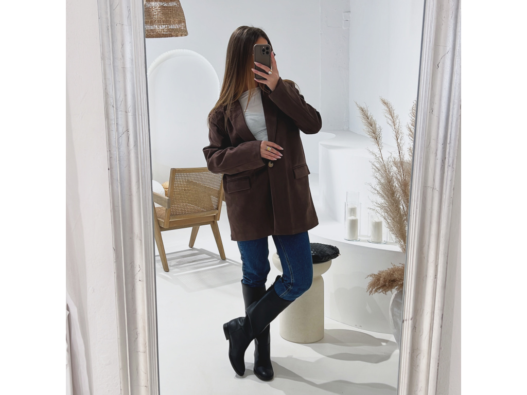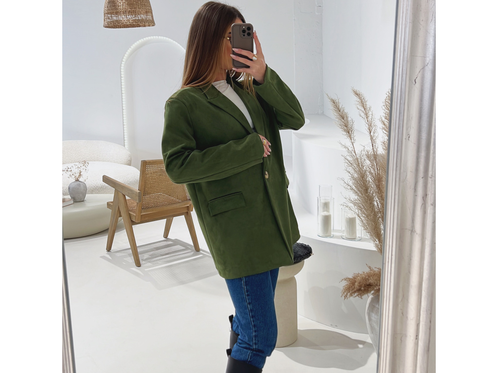 Elegantní semišové sako s jemně strukturovaným povrchem, které dodá outfitu šmrnc i nadčasovost. Má zapínání na knoflík, praktické kapsy, ramenní výztuže pro perfektní siluetu a kvalitní podšívku. Dostupné v krásné čokoládové a zelené barvě ve velikostech S, M a L.