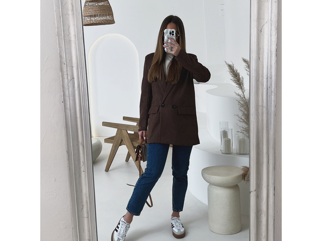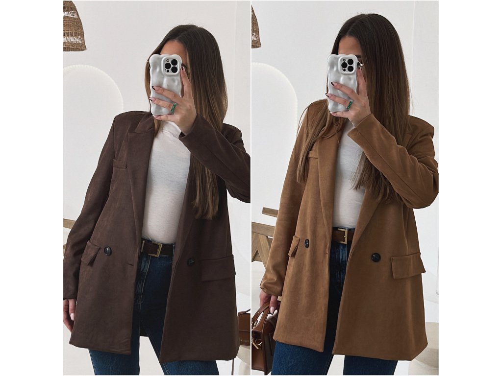 Stylové semišové sako Maribel v prodlouženém střihu dodá každému outfitu nádech elegance a sofistikovanosti. Díky jemné podšívce, vyztuženým ramenům a dvouřadým zapínáním na knoflík krásně drží tvar a vytváří ženskou siluetu.