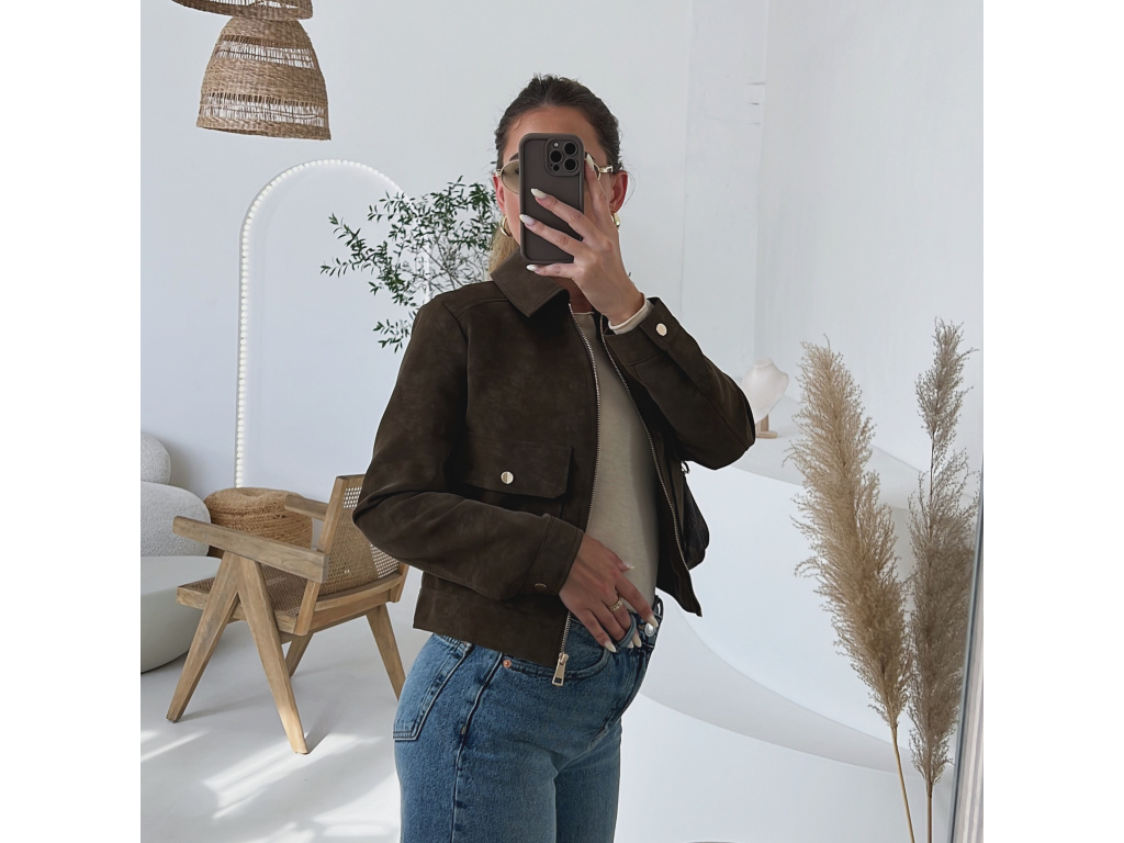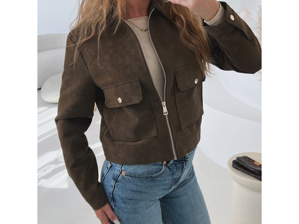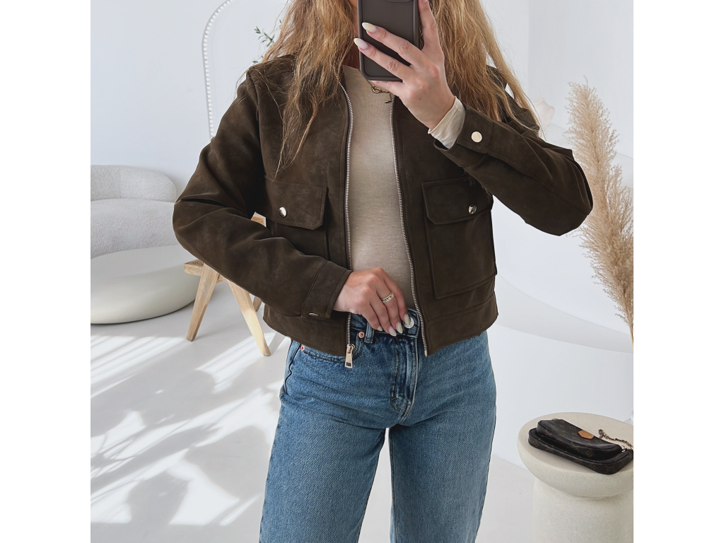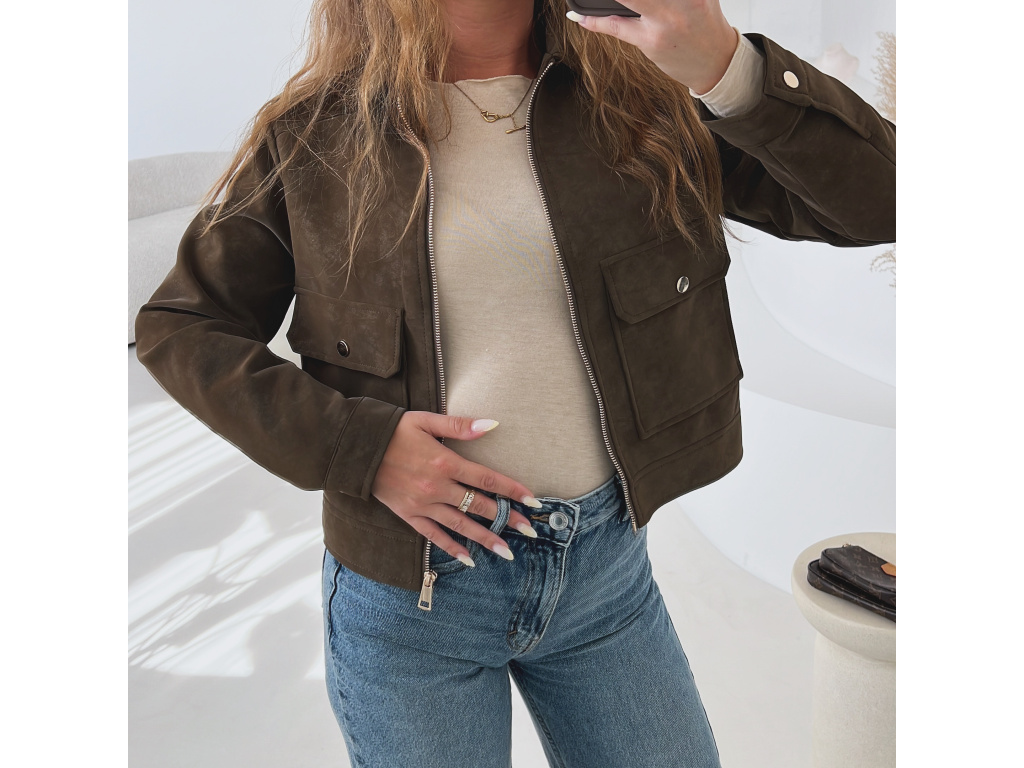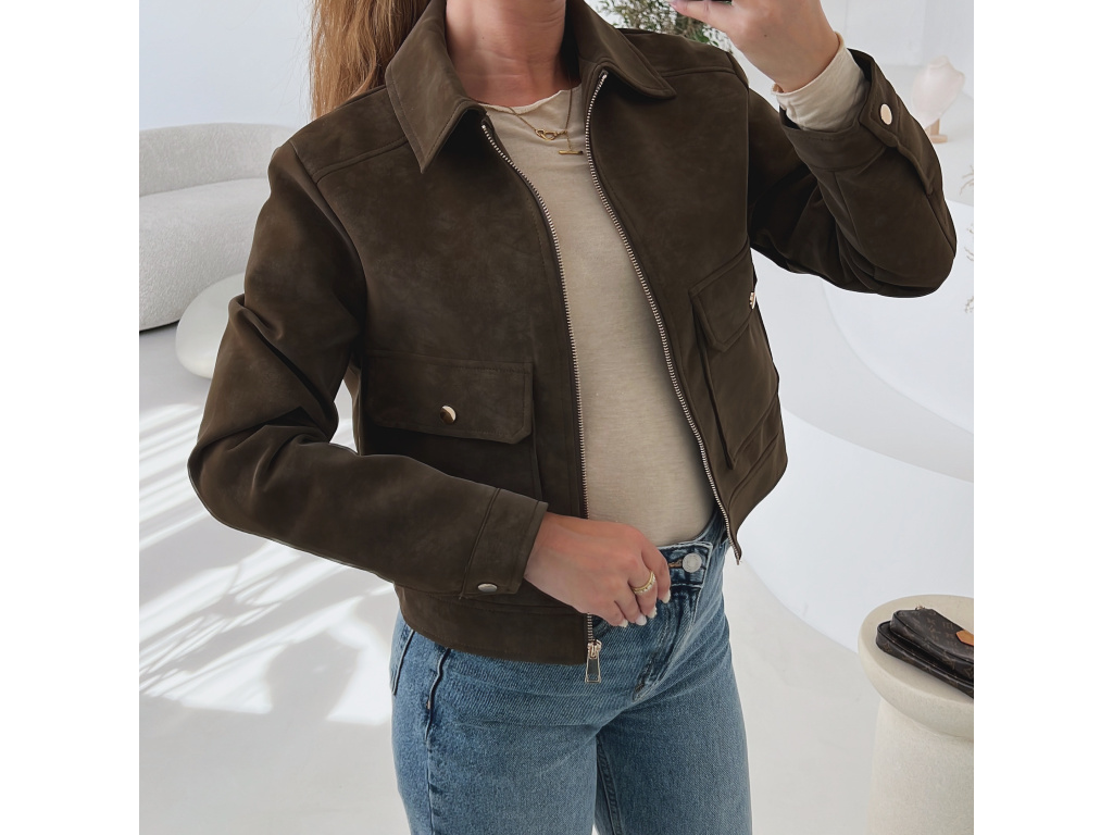 Stylová krátká bundička v hnědé barvě, která na první pohled působí jako semiš, ale je vyrobena z moderního pogumovaného materiálu. Díky tomu je nejen originální, ale i praktická – snadno se udržuje a krásně drží tvar. Bunda je doplněna jemně zlatými detaily na knoflících a zipu, což jí dodává elegantní nádech. Má příjemnou podšívku, takže je pohodlná na nošení i během chladnějších dnů.