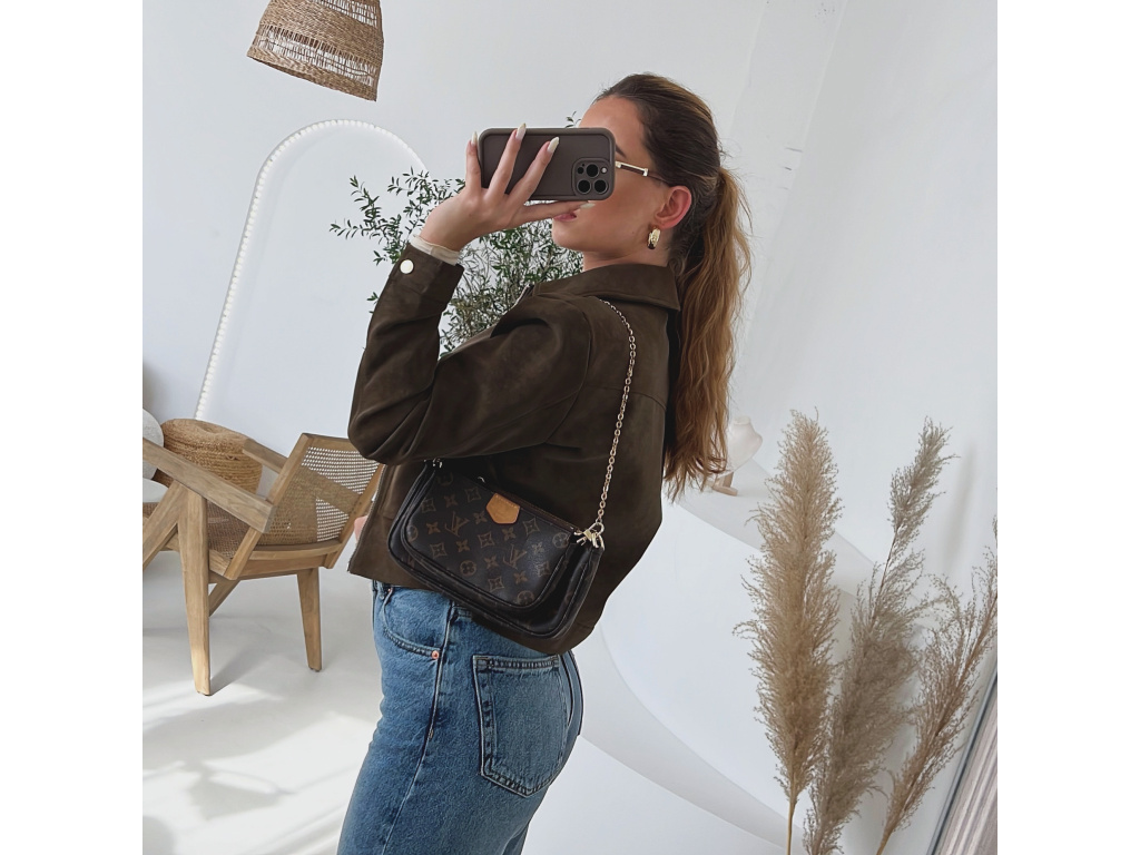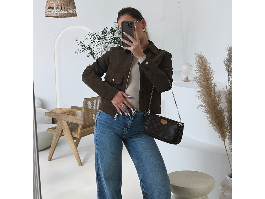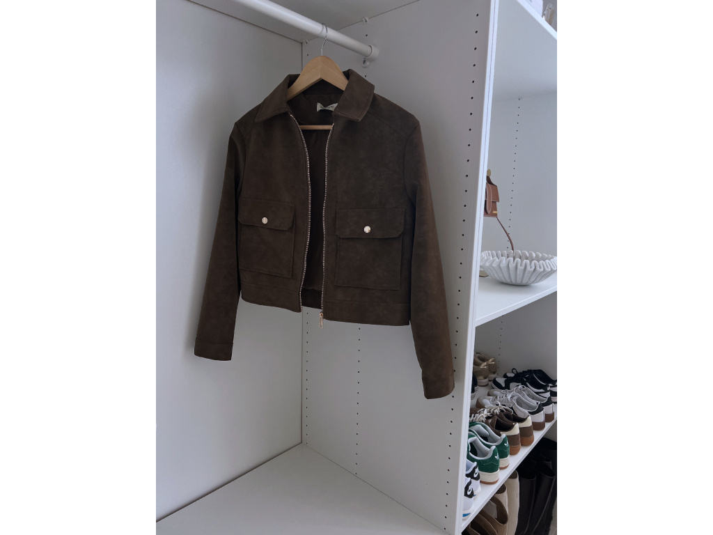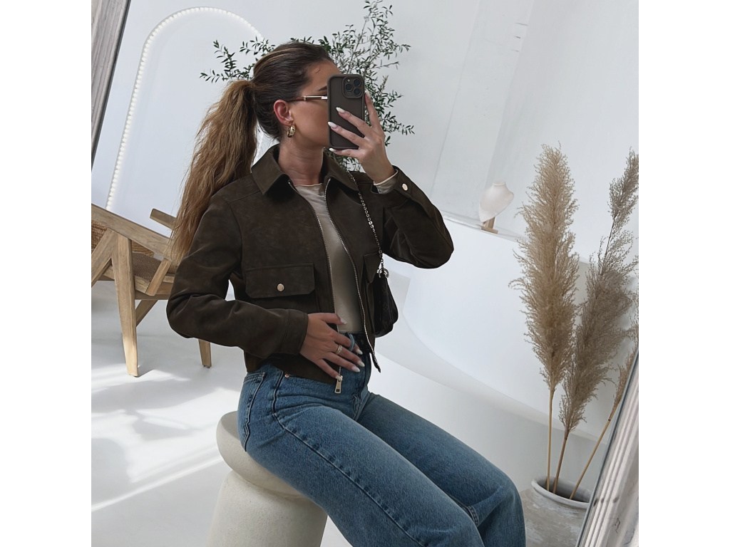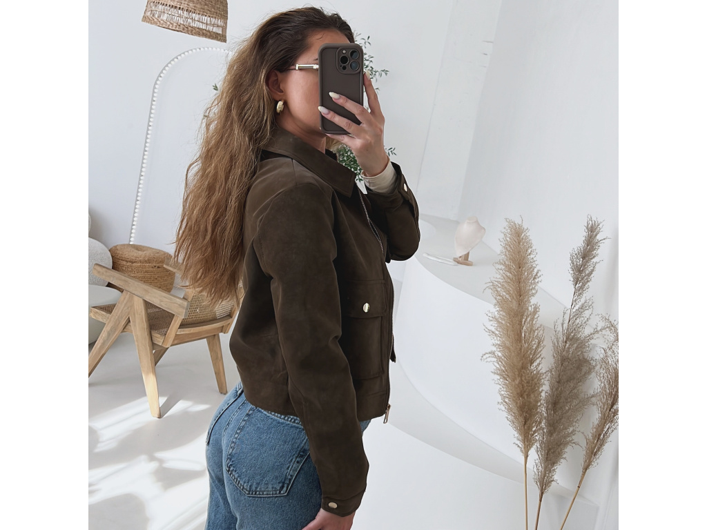 Stylová krátká bundička v hnědé barvě, která na první pohled působí jako semiš, ale je vyrobena z moderního pogumovaného materiálu. Díky tomu je nejen originální, ale i praktická – snadno se udržuje a krásně drží tvar. Bunda je doplněna jemně zlatými detaily na knoflících a zipu, což jí dodává elegantní nádech. Má příjemnou podšívku, takže je pohodlná na nošení i během chladnějších dnů.