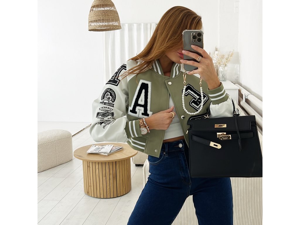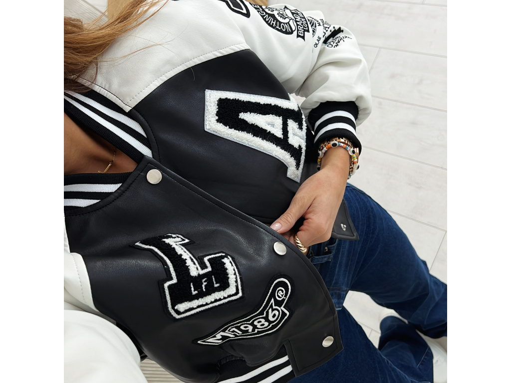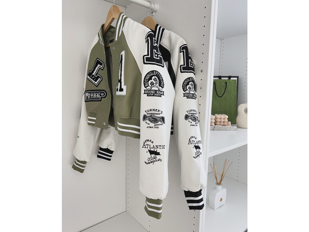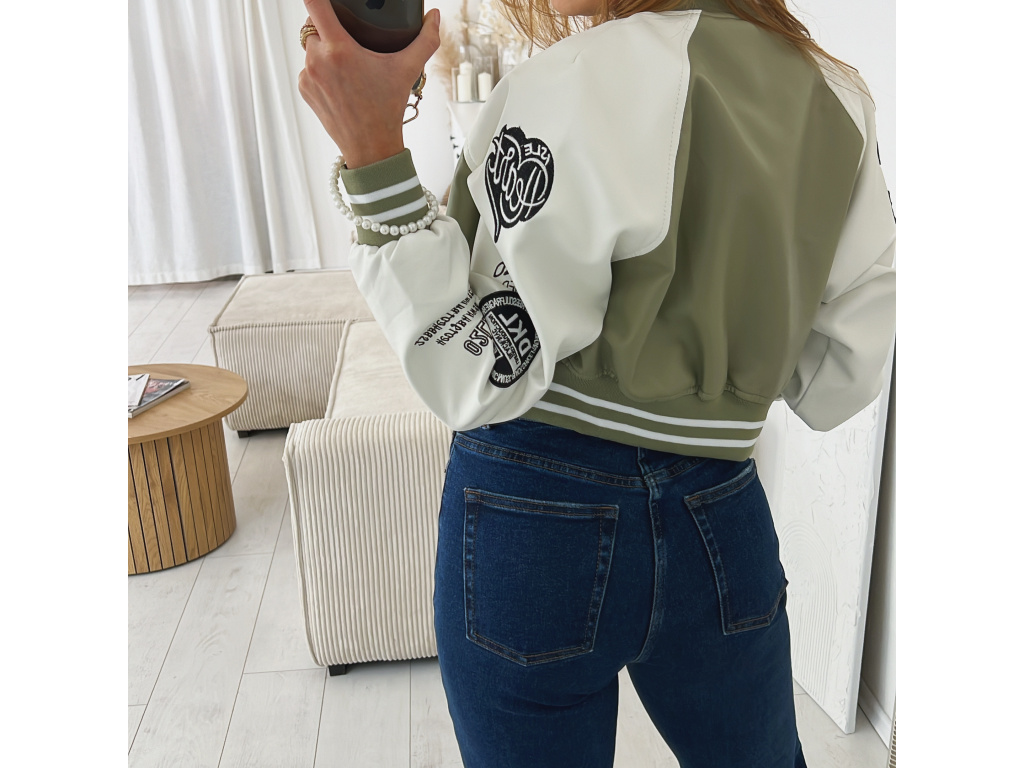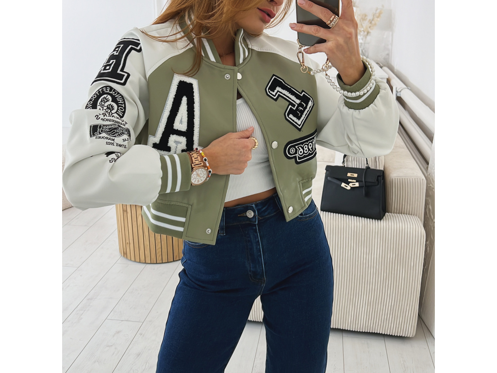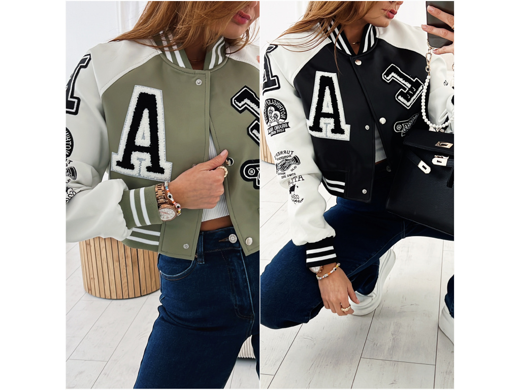 Stylová bomber bunda z eko kůže v černé a khaki barvě s nášivkami. Bomber bunda má podšívku a stříbrné detaily na zapínání. Velikost je S, M a L, sedí o číslo méně (S na XS, M na S a L na M). Velikost S je focena na XSKu a výšce 165 cm.