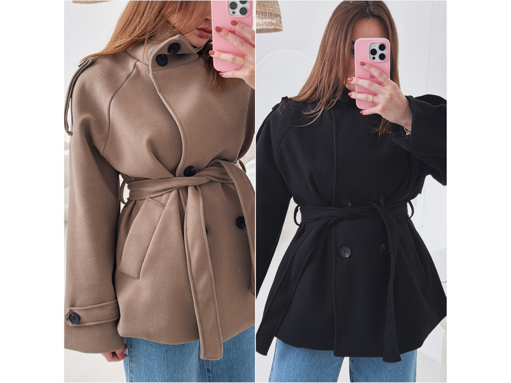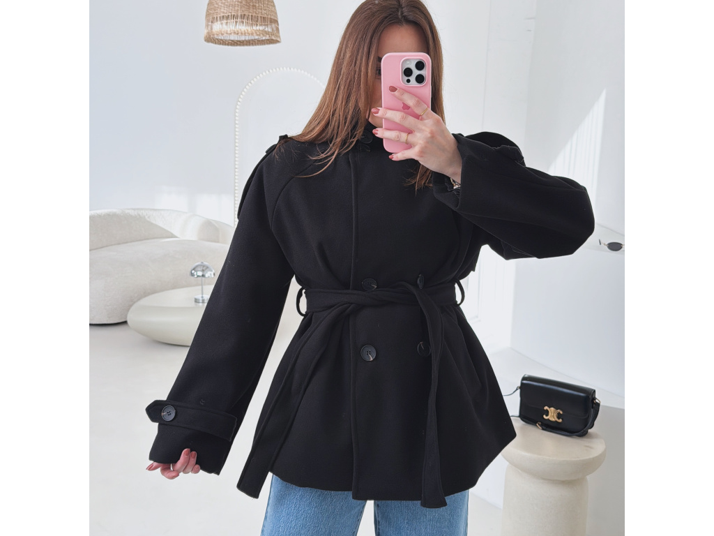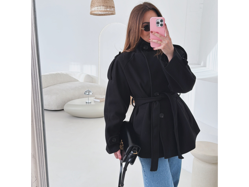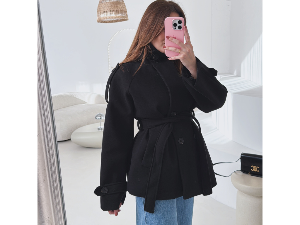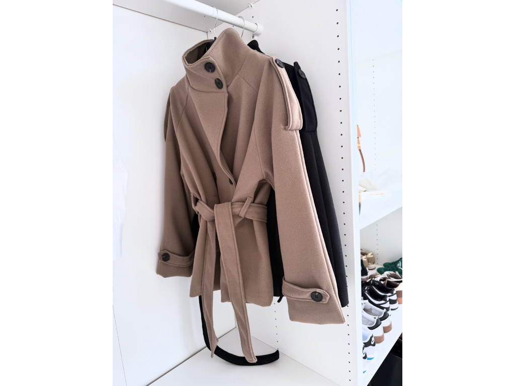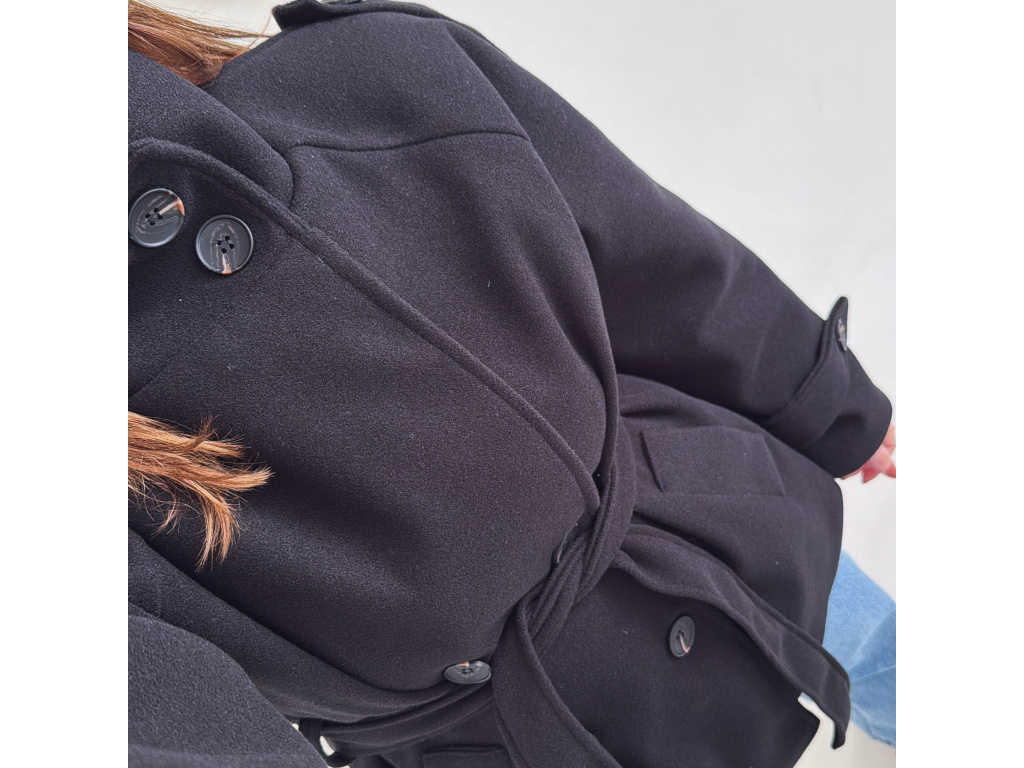Kratší kabát s dvouřadovým zapínáním a páskem v pase, který krásně zvýrazní siluetu. Vysoký límec dodává kabátu moderní vzhled a zároveň příjemně chrání před chladem. Elegantní, ale zároveň praktický kousek, který snadno zkombinuješ s džíny i kalhotami. Velikost je univerzální, sedí na XS - M.
