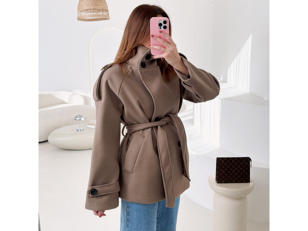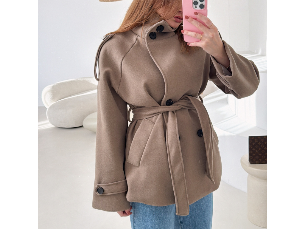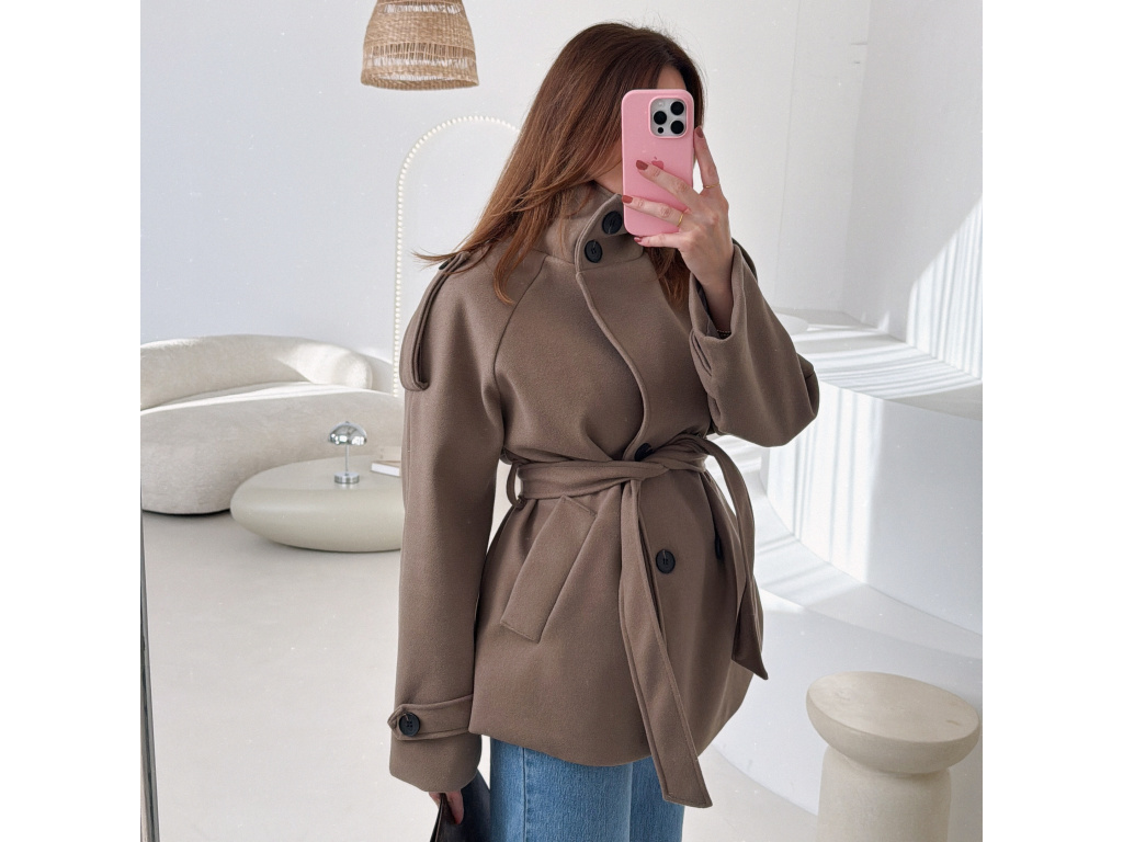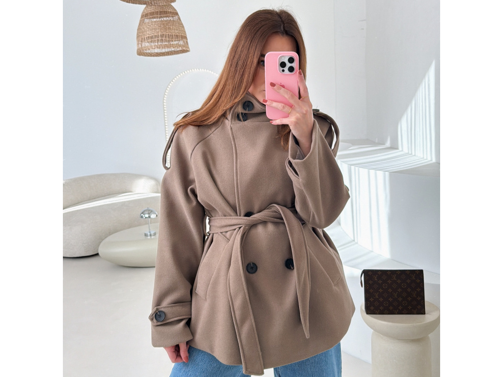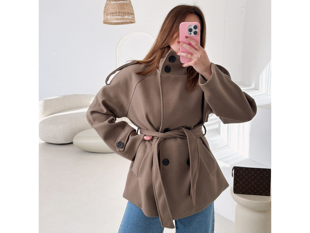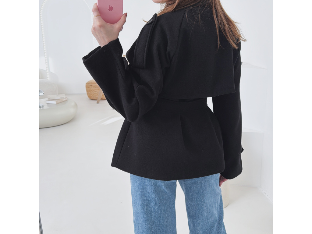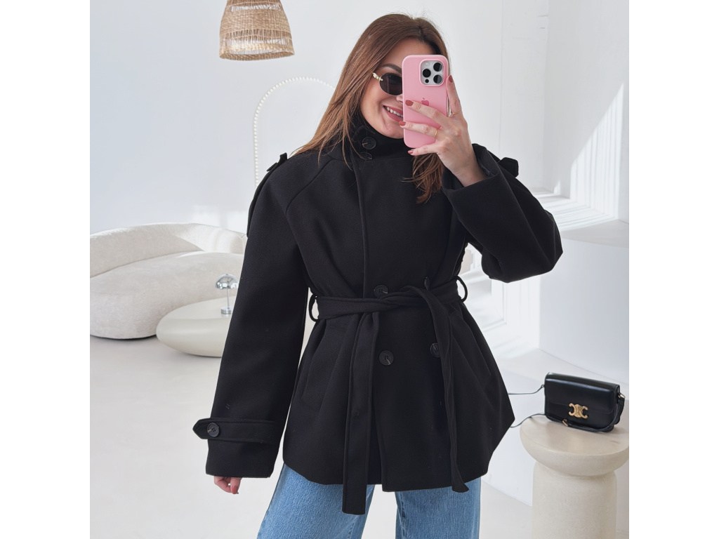 Kratší kabát s dvouřadovým zapínáním a páskem v pase, který krásně zvýrazní siluetu. Vysoký límec dodává kabátu moderní vzhled a zároveň příjemně chrání před chladem. Elegantní, ale zároveň praktický kousek, který snadno zkombinuješ s džíny i kalhotami. Velikost je univerzální, sedí na XS - M.