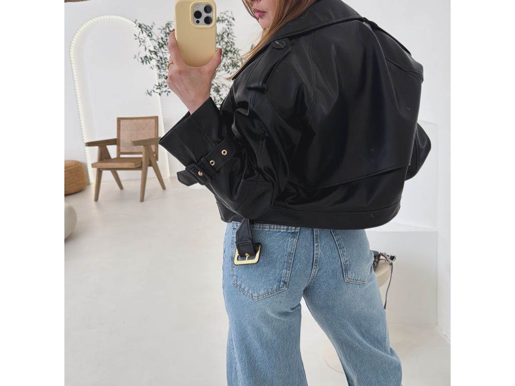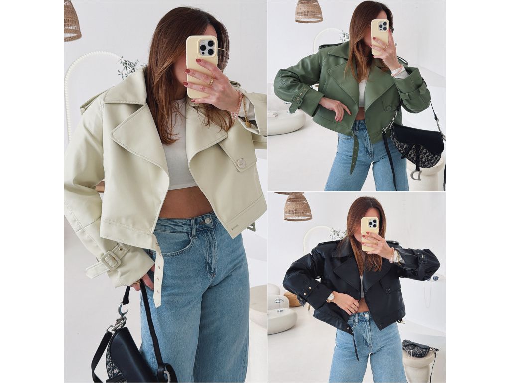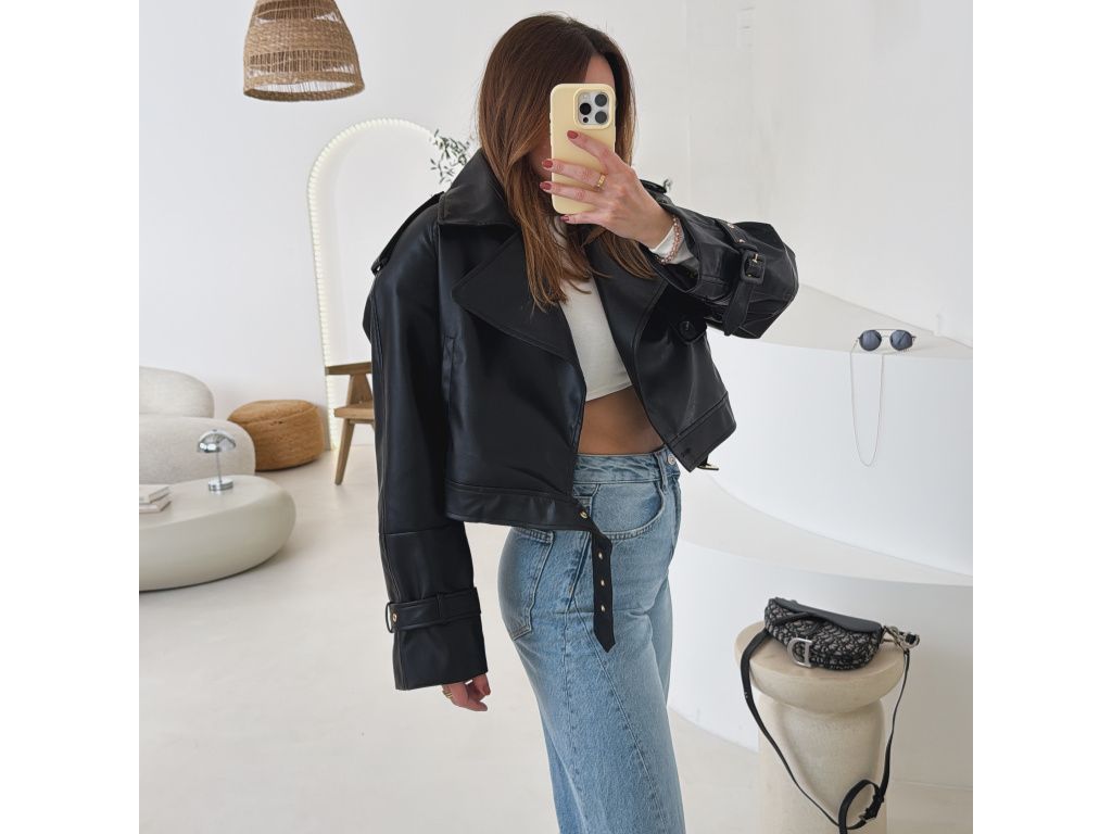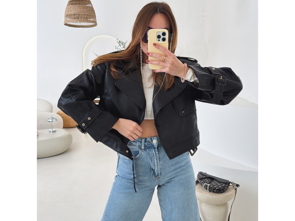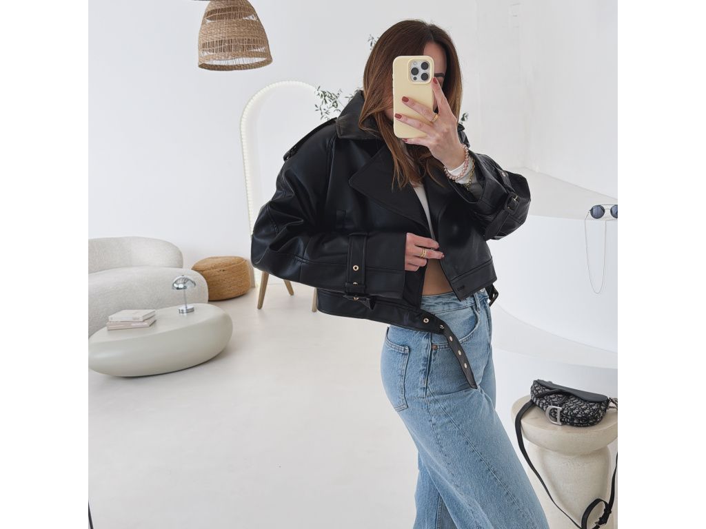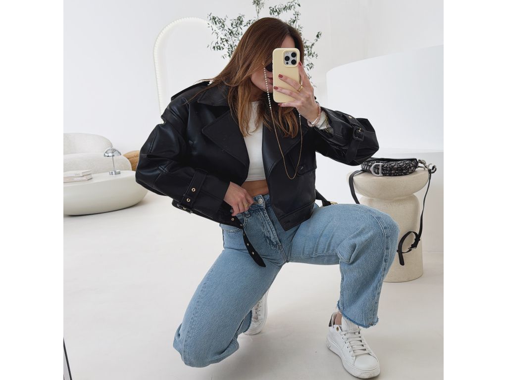 Stylový křivák z kvalitní koženky s podšívkou a mírně vyztuženými rameny, díky kterým krásně drží tvar. Bunda má výrazný fazonový límec, kapsy a zajímavé detaily v podobě pásků a kovových prvků, které jí dodávají moderní a nadčasový vzhled. Velikost je univerzální, sedí od XS až po L, na velikosti XS má lehce oversized střih.