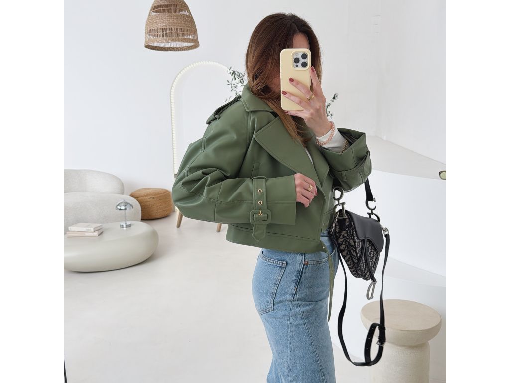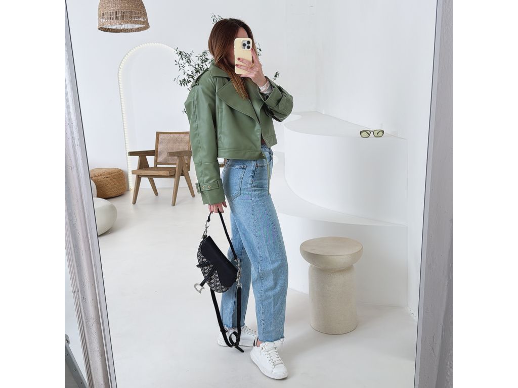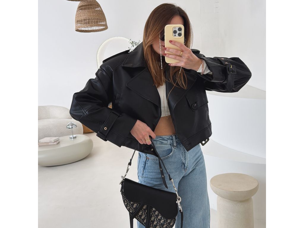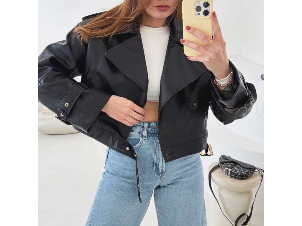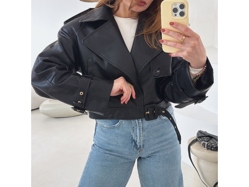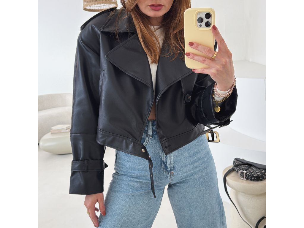 Stylový křivák z kvalitní koženky s podšívkou a mírně vyztuženými rameny, díky kterým krásně drží tvar. Bunda má výrazný fazonový límec, kapsy a zajímavé detaily v podobě pásků a kovových prvků, které jí dodávají moderní a nadčasový vzhled. Velikost je univerzální, sedí od XS až po L, na velikosti XS má lehce oversized střih.