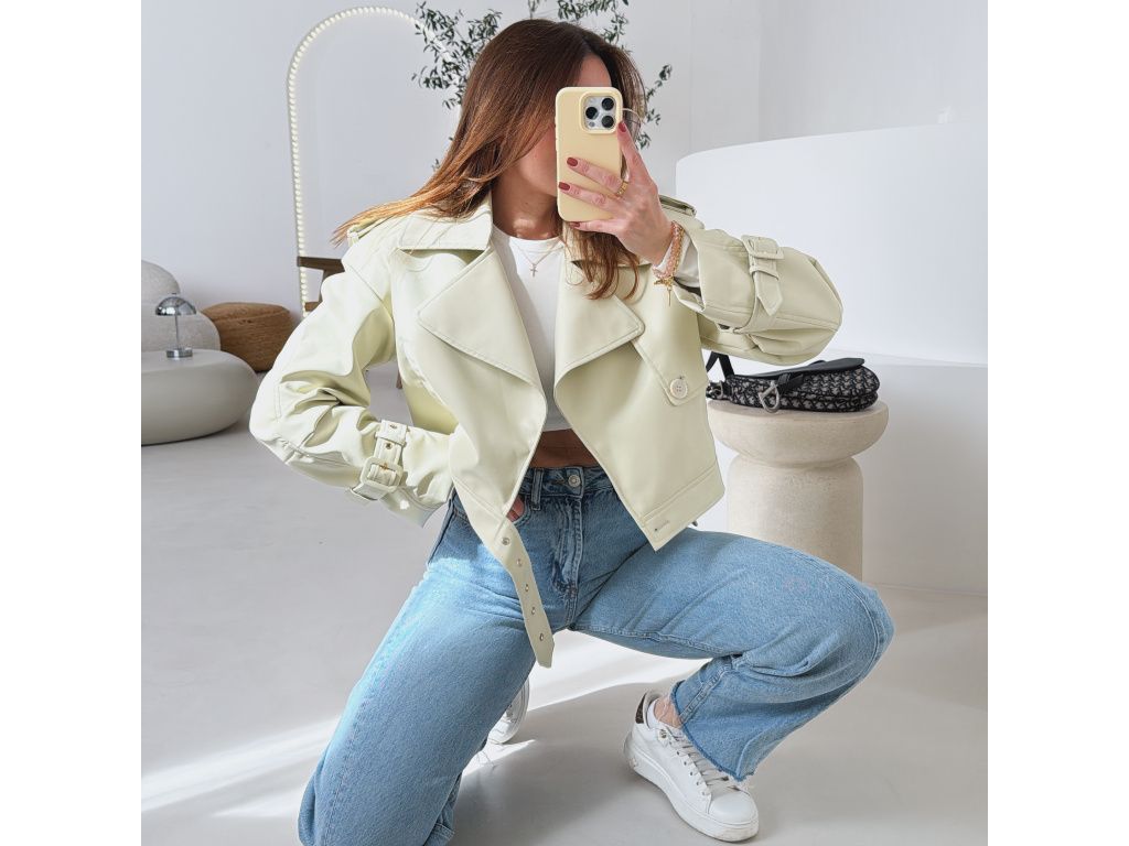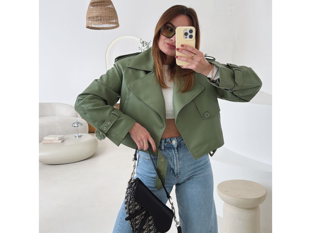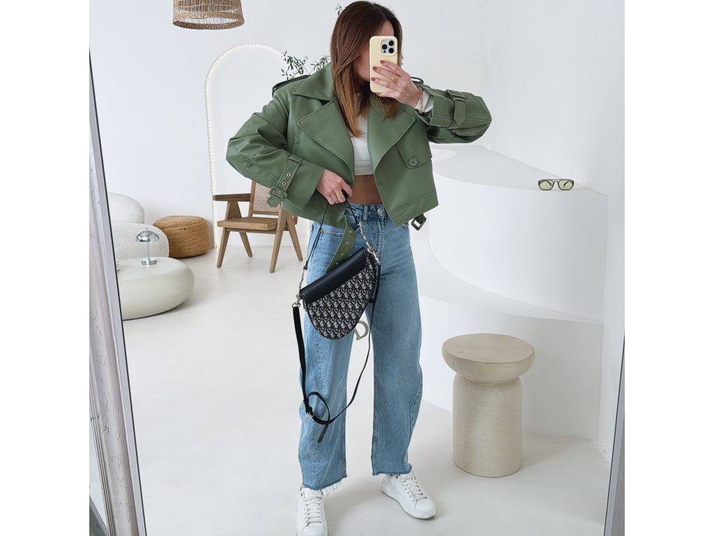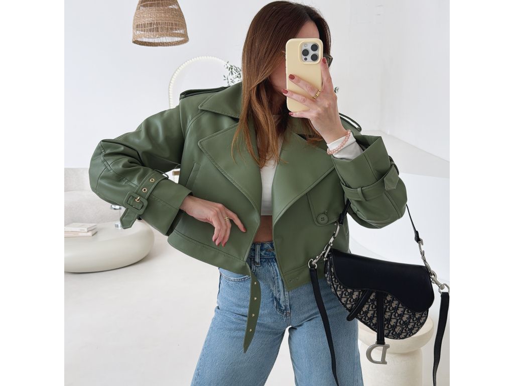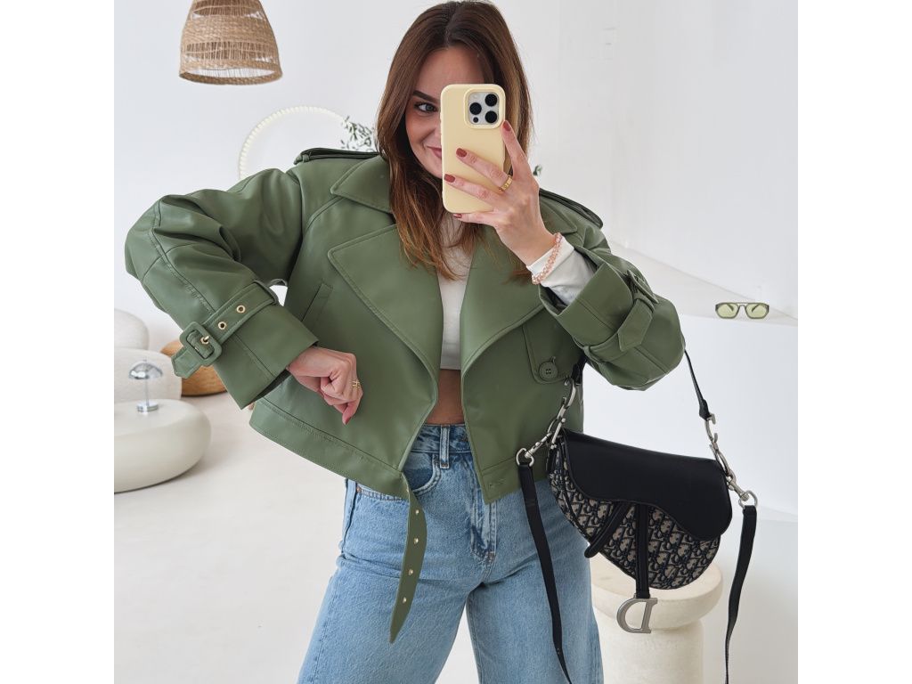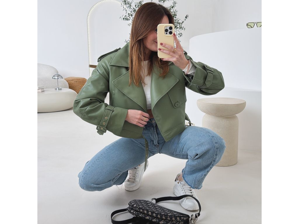 Stylový křivák z kvalitní koženky s podšívkou a mírně vyztuženými rameny, díky kterým krásně drží tvar. Bunda má výrazný fazonový límec, kapsy a zajímavé detaily v podobě pásků a kovových prvků, které jí dodávají moderní a nadčasový vzhled. Velikost je univerzální, sedí od XS až po L, na velikosti XS má lehce oversized střih.
