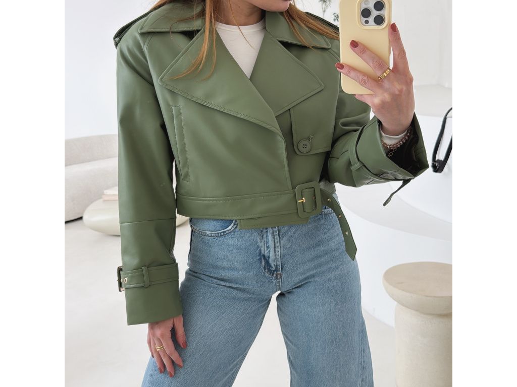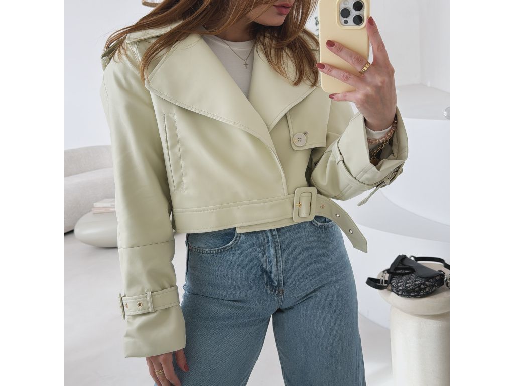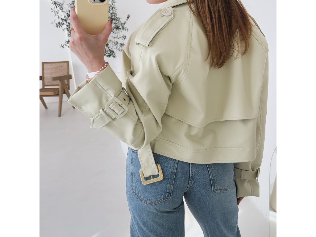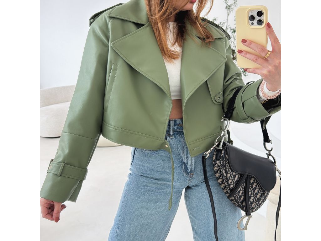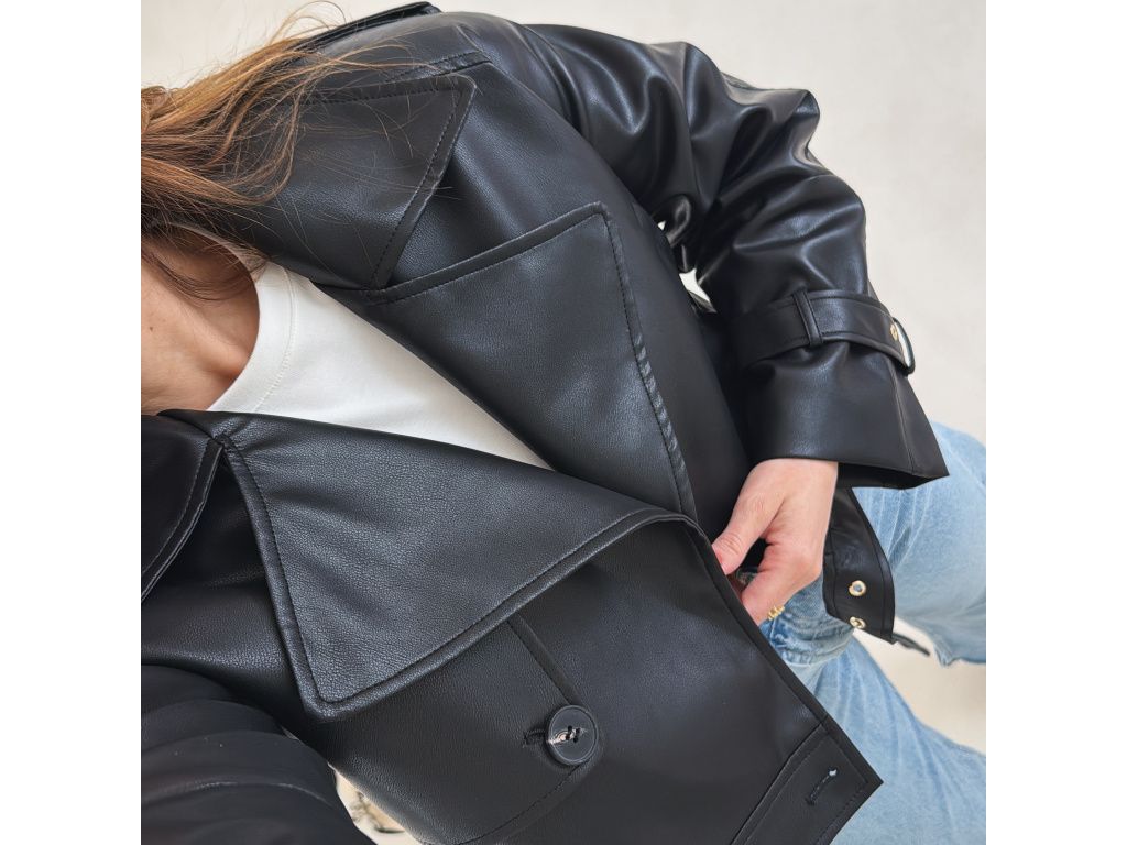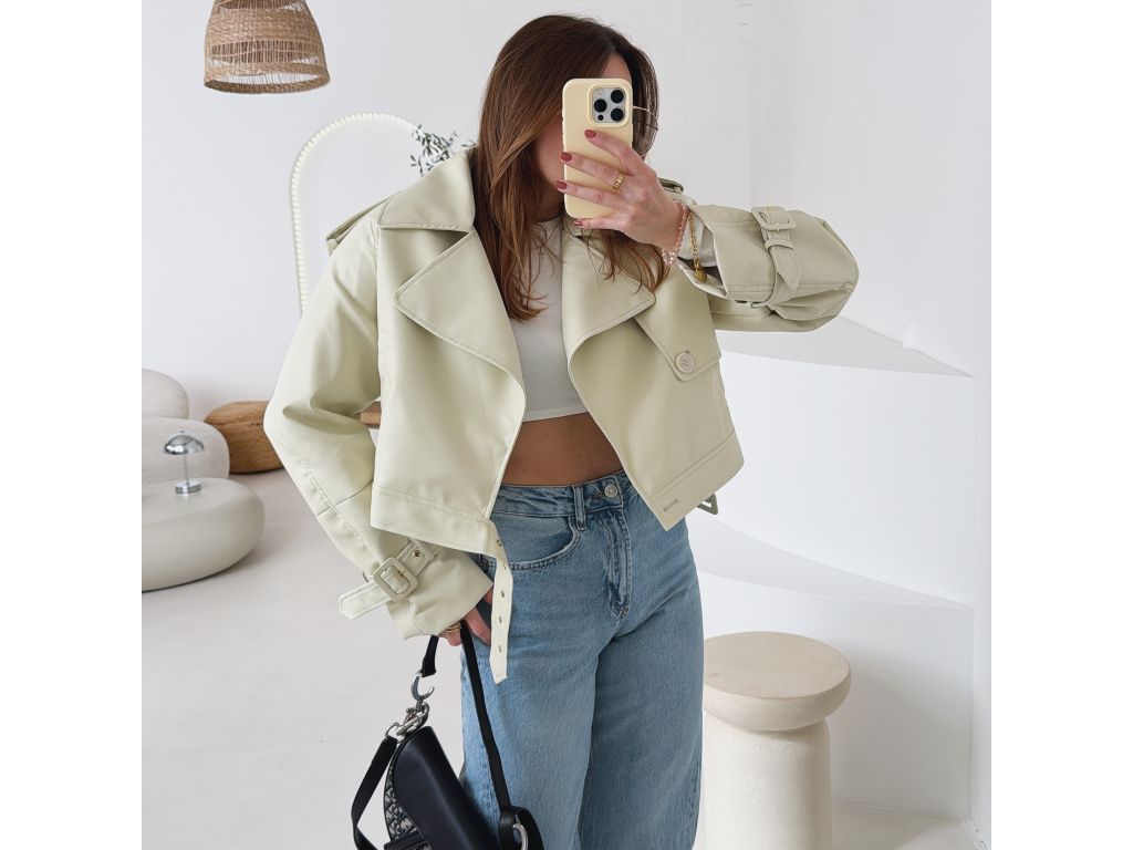 Stylový křivák z kvalitní koženky s podšívkou a mírně vyztuženými rameny, díky kterým krásně drží tvar. Bunda má výrazný fazonový límec, kapsy a zajímavé detaily v podobě pásků a kovových prvků, které jí dodávají moderní a nadčasový vzhled. Velikost je univerzální, sedí od XS až po L, na velikosti XS má lehce oversized střih.