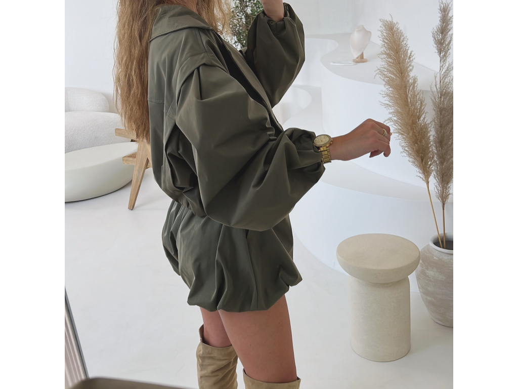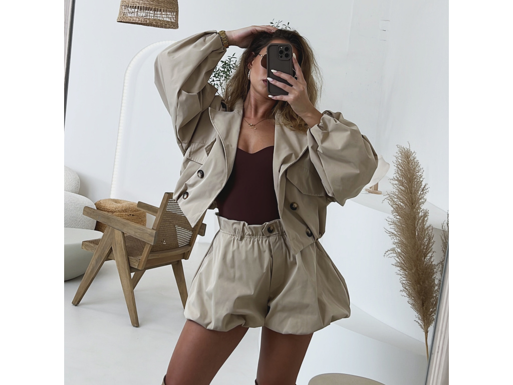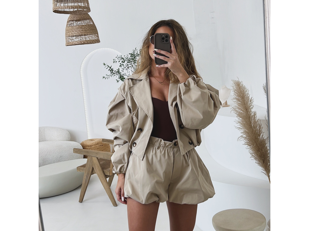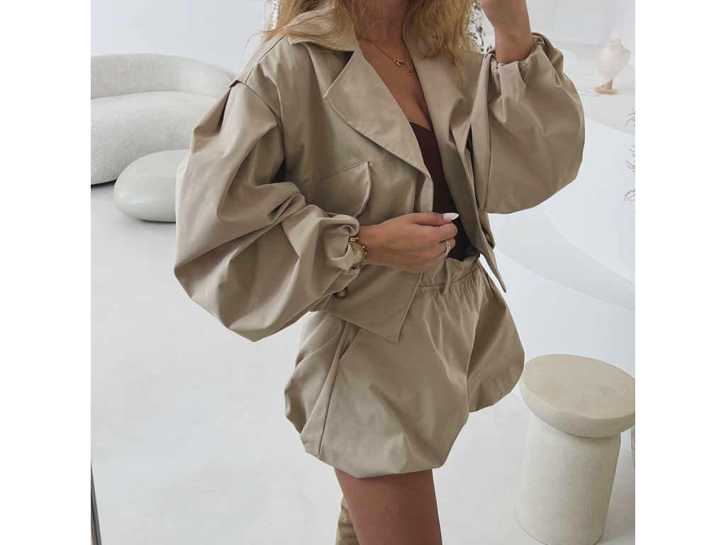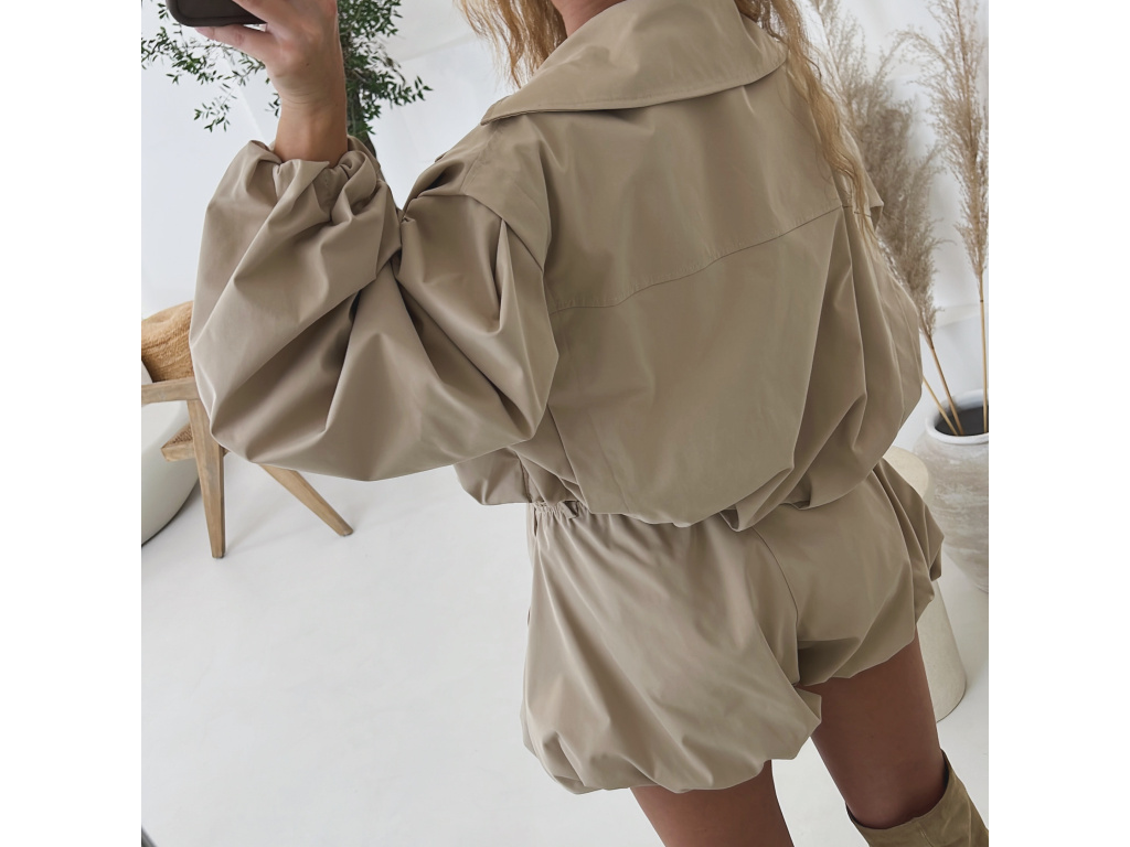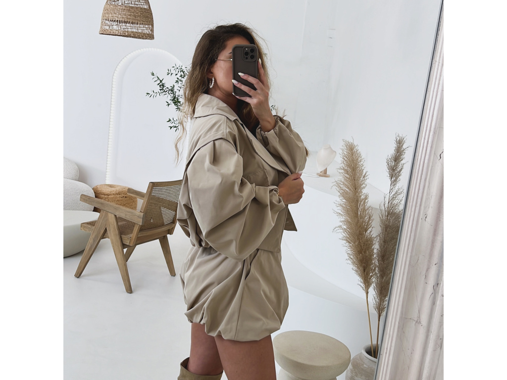 Stylová oversize bundička v béžové a khaki barvě je navržena jako komplet k balónovým šortkám ze stejné kolekce. Má výrazné balónové rukávy, volnější střih a zapínání na knoflíky, takže působí trendy i pohodlně zároveň. Dostupná ve velikostech S/M a M/L. Trenčkot je vč. podšívky. Rukávy a dolní kraj bundy je stažený do gumy.